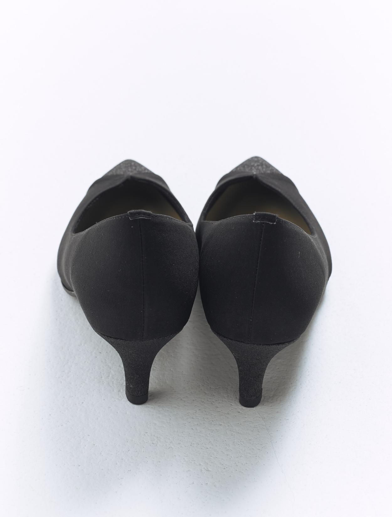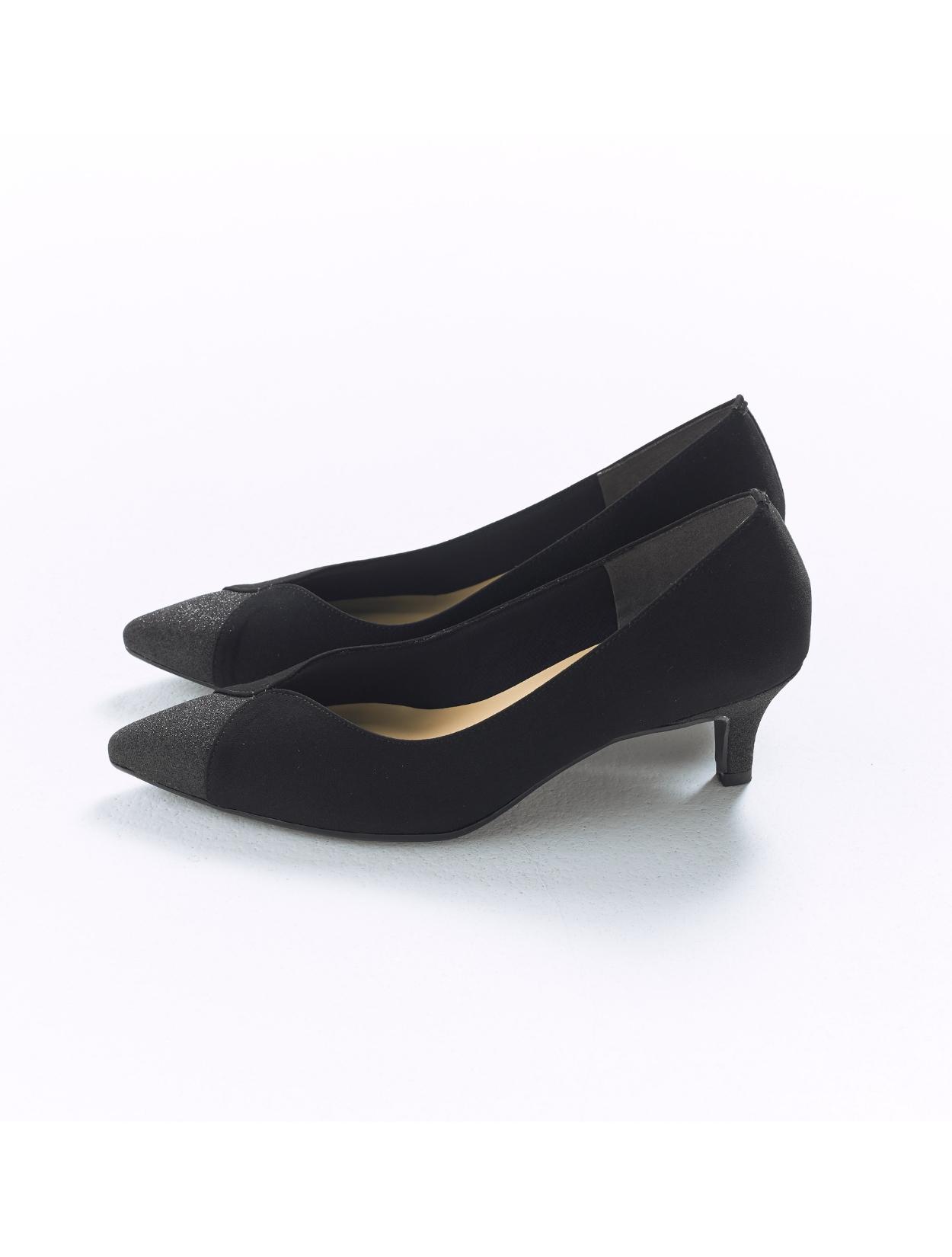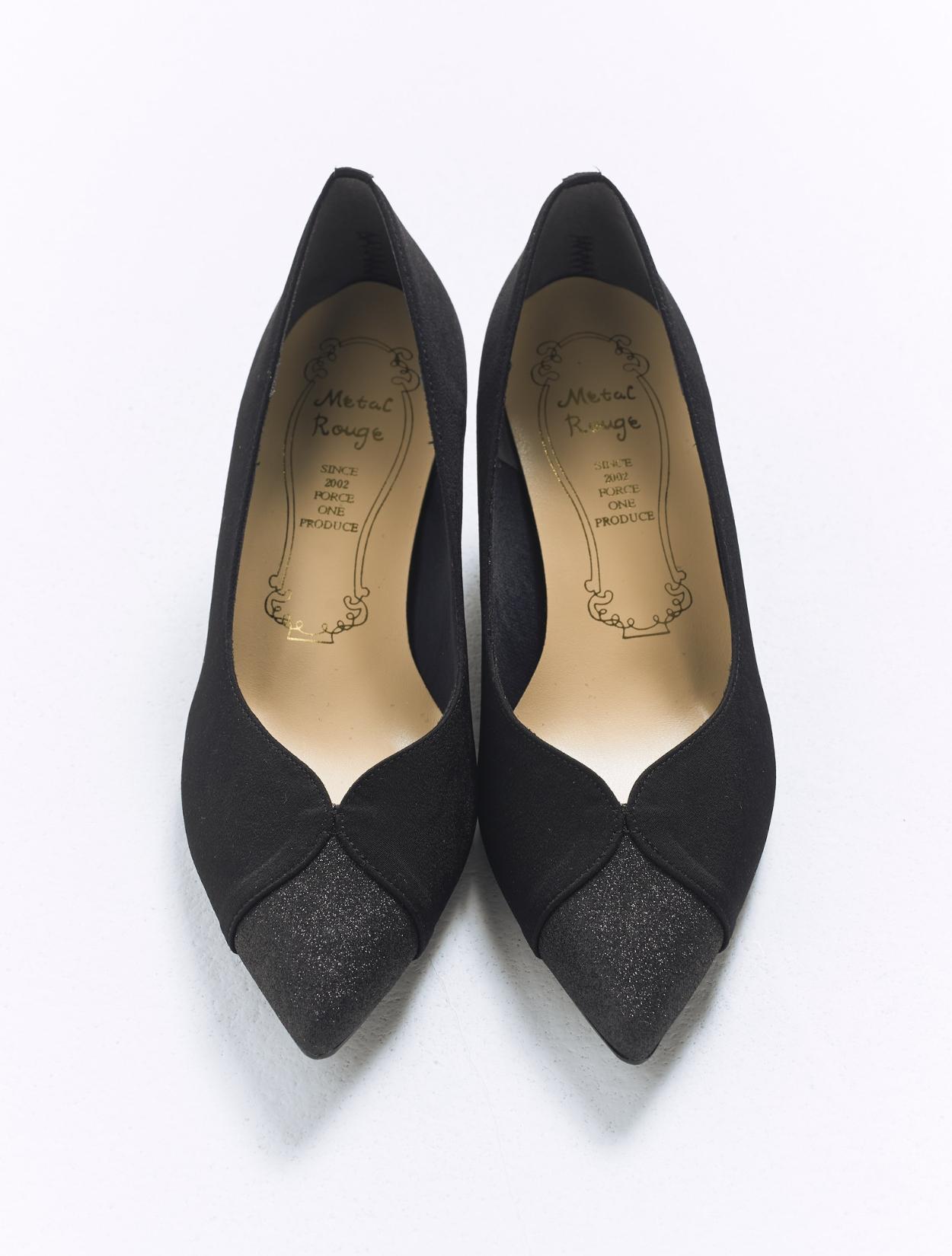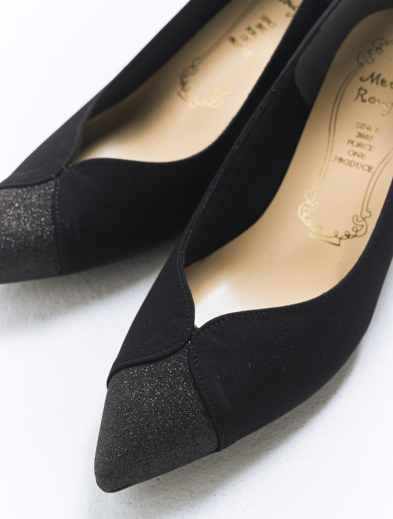 細かいラメとサテンの切り替えは上品な華やかさがあります。スッキリとしたポインテッドトウと細めのヒールは、エレガントなフォーマル感をUP。