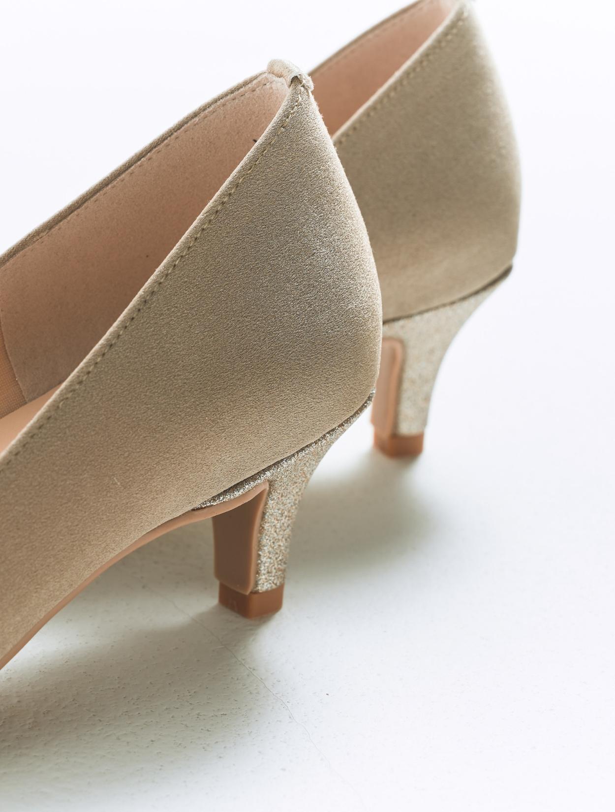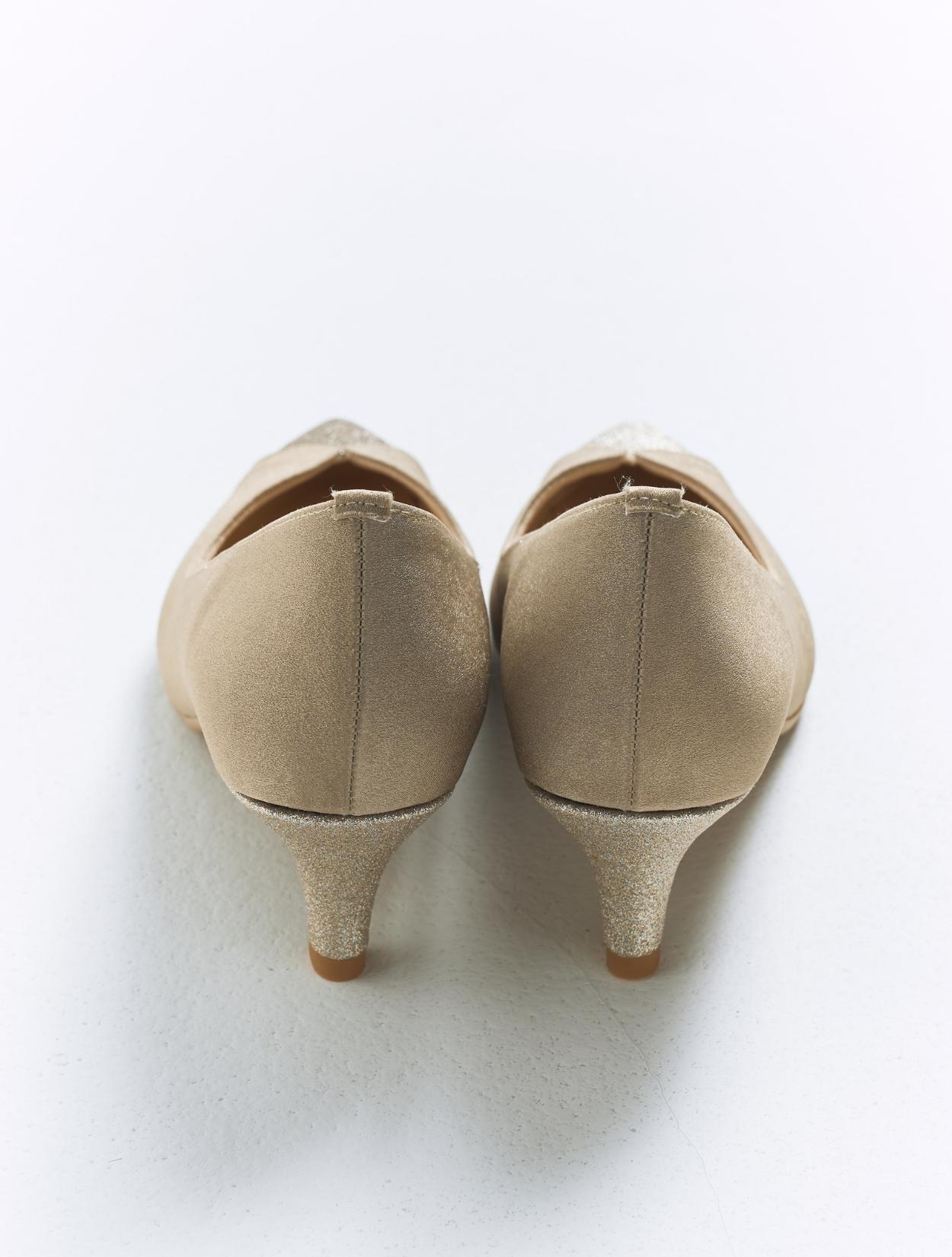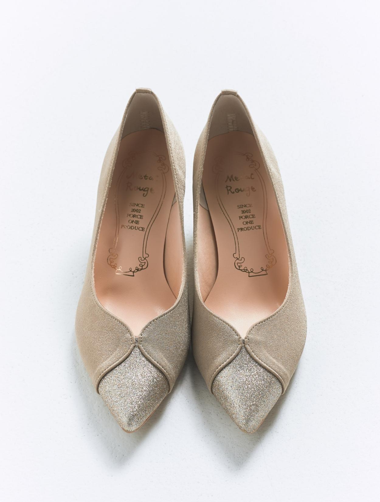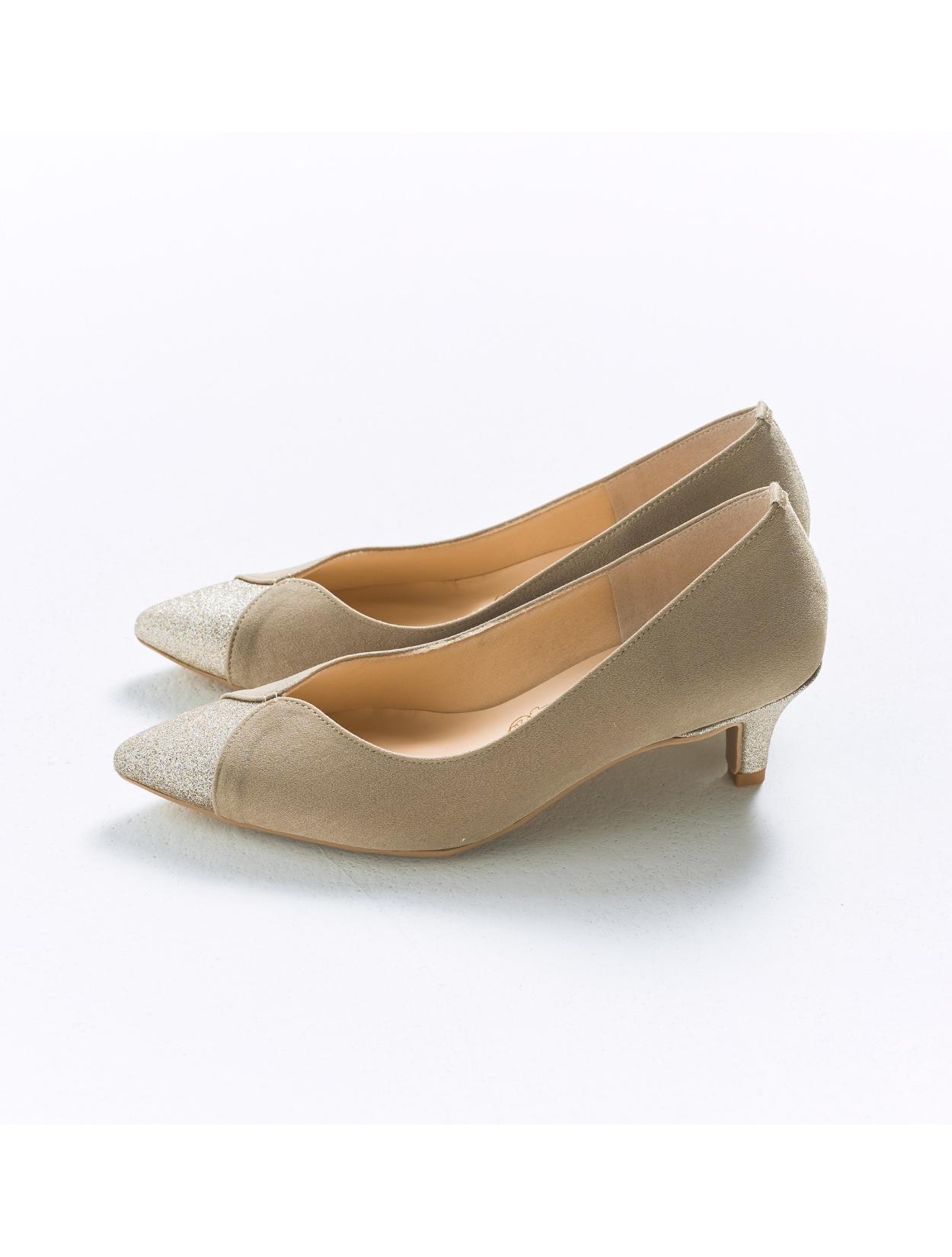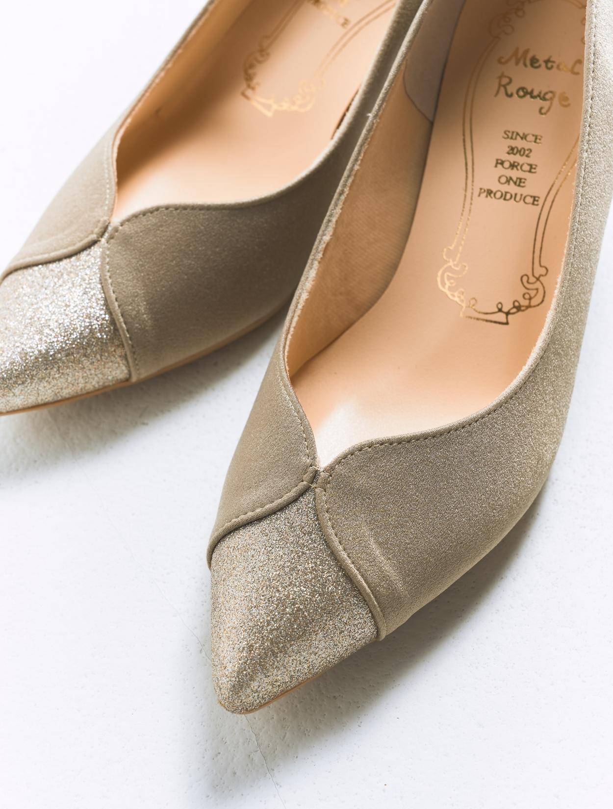 細かいラメとサテンの切り替えは上品な華やかさがあります。スッキリとしたポインテッドトウと細めのヒールは、エレガントなフォーマル感をUP。
