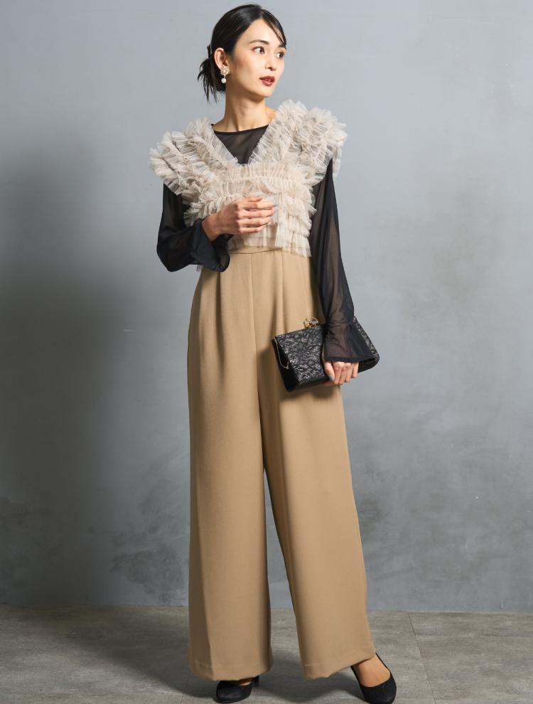 オールインワンパンツ 形はとてもきれいだがもっとフォーマル感のある材質なら良いなと思った(ジョーゼットのような)脇にファスナーのある方が着脱が楽なのではないか。
