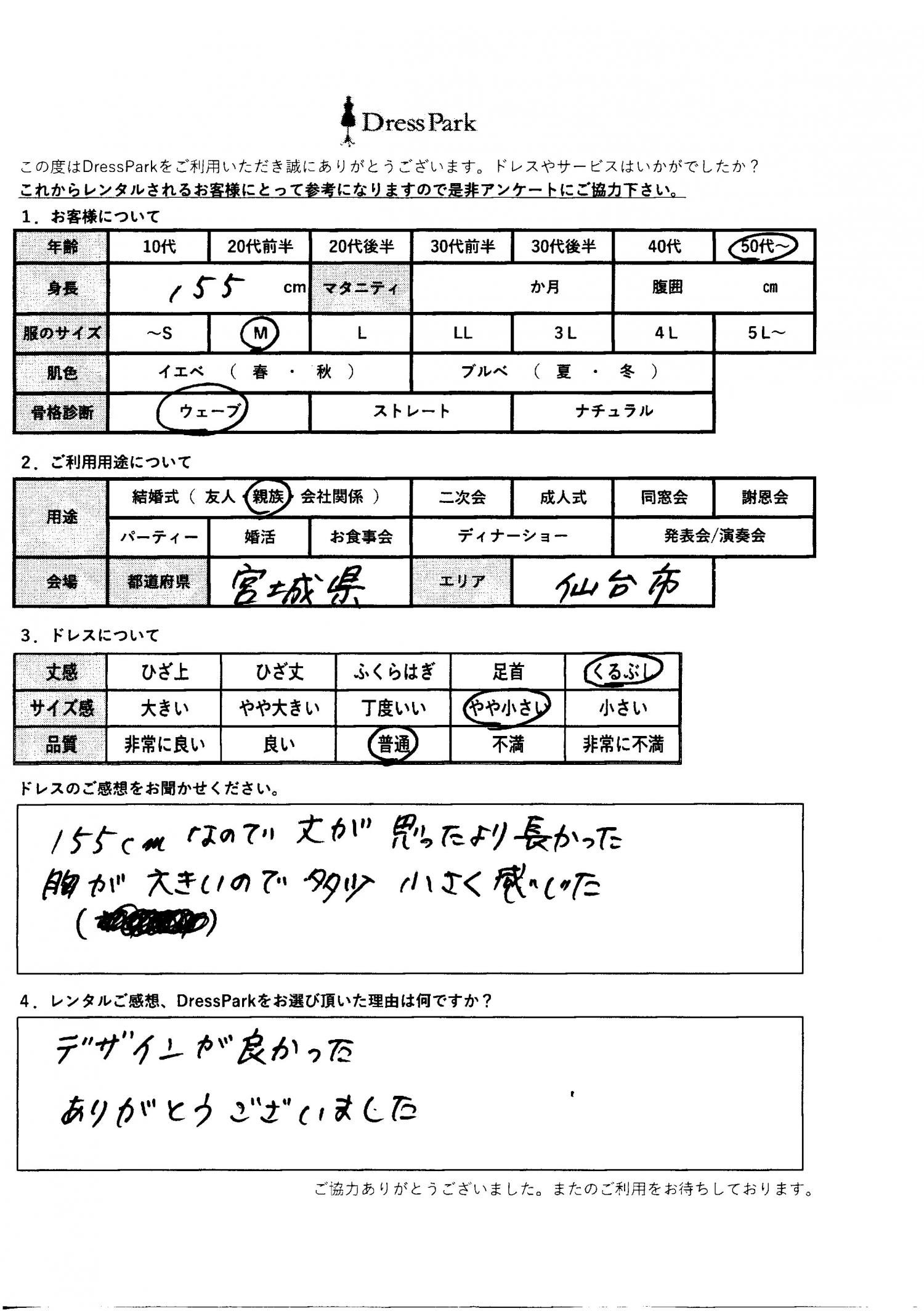 宮城県 Y.T様155㎝ Mサイズ仙台 #50代~#M/L#155~159㎝#結婚式(親族)#宮城県#仙台 ◆レンタルしたドレスはこちら ◆レンタルしたサイズは:M ◆レンタルした日付:2025/02/23 ドレスの着用感 ◆点数: (4点) ◆丈感:くるぶし ◆サイズ感:やや小さい ◆品質:普通 ◆骨格診断:ウェーブ ドレスの感想 155cmなので丈が思ったより長かった。胸が大きいので多少小さく感じた。 レンタルのご感想、DressParkをお選び頂いた理由 デザインが良かった。ありがとうございました。 CUSTOMER REVIEWS お客様の声 気になるカテゴリー別にご利用の感想をチェック! ◆AGE 年代で見る 10代 20代 30代 40代 50代~ ◆SIZE サイズで見る SS/S M/L 大きいサイズLL~ ◆HIGHT 身長で見る 140~149㎝ 150~154㎝ 155~159㎝ 160~164㎝ 165~169㎝ 170㎝以上 ◆マタニティ ~3か月 4~6か月 7~8か月 9~10か月 ◆肌色 イエベ ブルべ ◆骨格診断 ウェーブ ストレート ナチュラル ◆利用シーン 結婚式(友人) 結婚式(親族) 結婚式(会社関係) 二次会 成人式 謝恩会 パーティー その他 CUSTOMER REVIEWS都道府県別お客様の声 都道府県別にのお客様の声をチェック! 北海道 青森県 岩手県 宮城県 秋田県 山形県 福島県 茨城県 栃木県 群馬県 埼玉県 千葉県 東京都 神奈川県 新潟県 富山県 石川県 福井県 山梨県 長野県 岐阜県 静岡県 愛知県 三重県 滋賀県 京都府 大阪府 兵庫県 奈良県 和歌山県 鳥取県 島根県 岡山県 広島県 山口県 徳島県 香川県 愛媛県 高知県 福岡県 佐賀県 長崎県 熊本県 大分県 宮崎県 鹿児島県 沖縄県 CUSTOMER REVIEWSエリア別お客様の声 都道府県別にのお客様の声をチェック! 札幌 仙台 名古屋 軽井沢 金沢 神戸・芦屋 博多 那覇 梅田・新大阪 難波・心斎橋 鎌倉・湘南 横浜・みなとみらい 舞浜・浦安・幕張 大宮・浦和 青山・表参道 六本木・麻布 渋谷・恵比寿 新宿 池袋 銀座・丸の内 お台場・汐留 鹿児島市 郡山市 福島市 東予 甲府・石和 LINEでお問い合わせ このサイトではJavaScriptを使用しています