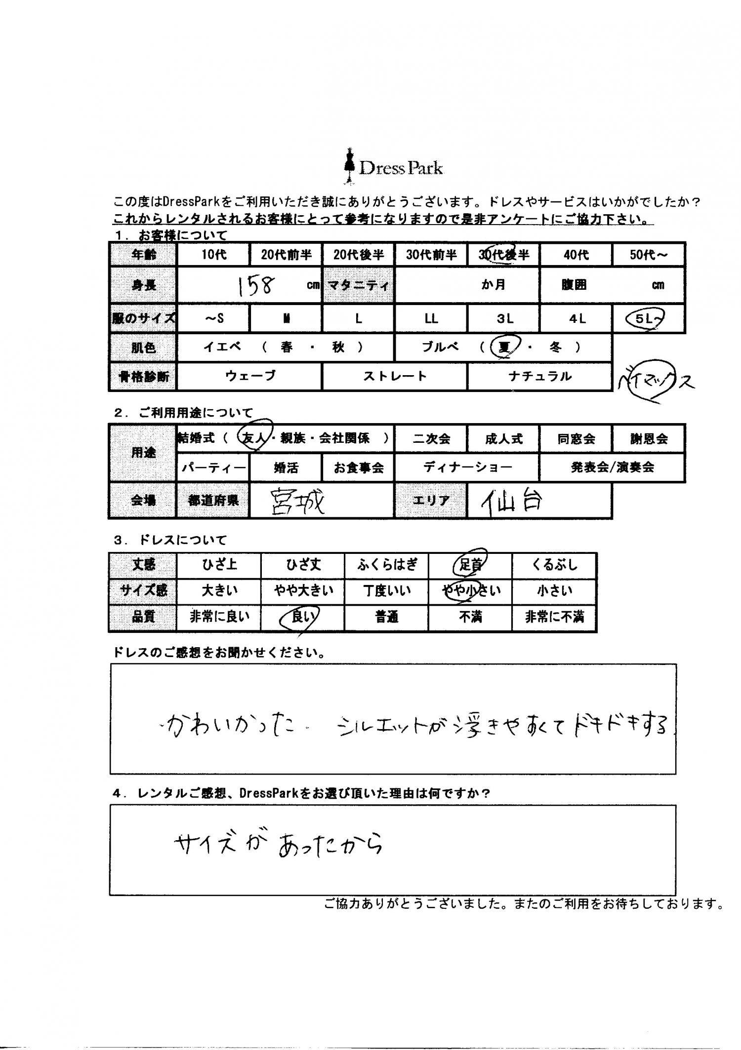 宮城県 R.K様158㎝ 5L~サイズ仙台 #30代#大きいサイズLL~#155~159㎝#結婚式(友人)#宮城県#仙台 ◆レンタルしたドレスはこちら ◆レンタルしたサイズは:5L ◆レンタルした日付:2025/04/19 ドレスの着用感 ◆点数: (4点) ◆丈感:足首 ◆サイズ感:やや小さい ◆品質:良い ◆肌色:ブルべ ドレスの感想 かわいかった。シルエットが浮きやすくてドキドキする。 レンタルのご感想、DressParkをお選び頂いた理由 サイズがあったから。 CUSTOMER REVIEWS お客様の声 気になるカテゴリー別にご利用の感想をチェック! ◆AGE 年代で見る 10代 20代 30代 40代 50代~ ◆SIZE サイズで見る SS/S M/L 大きいサイズLL~ ◆HIGHT 身長で見る 140~149㎝ 150~154㎝ 155~159㎝ 160~164㎝ 165~169㎝ 170㎝以上 ◆マタニティ ~3か月 4~6か月 7~8か月 9~10か月 ◆肌色 イエベ ブルべ ◆骨格診断 ウェーブ ストレート ナチュラル ◆利用シーン 結婚式(友人) 結婚式(親族) 結婚式(会社関係) 二次会 成人式 謝恩会 パーティー その他 CUSTOMER REVIEWS都道府県別お客様の声 都道府県別にのお客様の声をチェック! 北海道 青森県 岩手県 宮城県 秋田県 山形県 福島県 茨城県 栃木県 群馬県 埼玉県 千葉県 東京都 神奈川県 新潟県 富山県 石川県 福井県 山梨県 長野県 岐阜県 静岡県 愛知県 三重県 滋賀県 京都府 大阪府 兵庫県 奈良県 和歌山県 鳥取県 島根県 岡山県 広島県 山口県 徳島県 香川県 愛媛県 高知県 福岡県 佐賀県 長崎県 熊本県 大分県 宮崎県 鹿児島県 沖縄県 CUSTOMER REVIEWSエリア別お客様の声 都道府県別にのお客様の声をチェック! 札幌 仙台 名古屋 軽井沢 金沢 神戸・芦屋 博多 那覇 梅田・新大阪 難波・心斎橋 鎌倉・湘南 横浜・みなとみらい 舞浜・浦安・幕張 大宮・浦和 青山・表参道 六本木・麻布 渋谷・恵比寿 新宿 池袋 銀座・丸の内 お台場・汐留 鹿児島市 郡山市 福島市 東予 甲府・石和 LINEでお問い合わせ このサイトではJavaScriptを使用しています