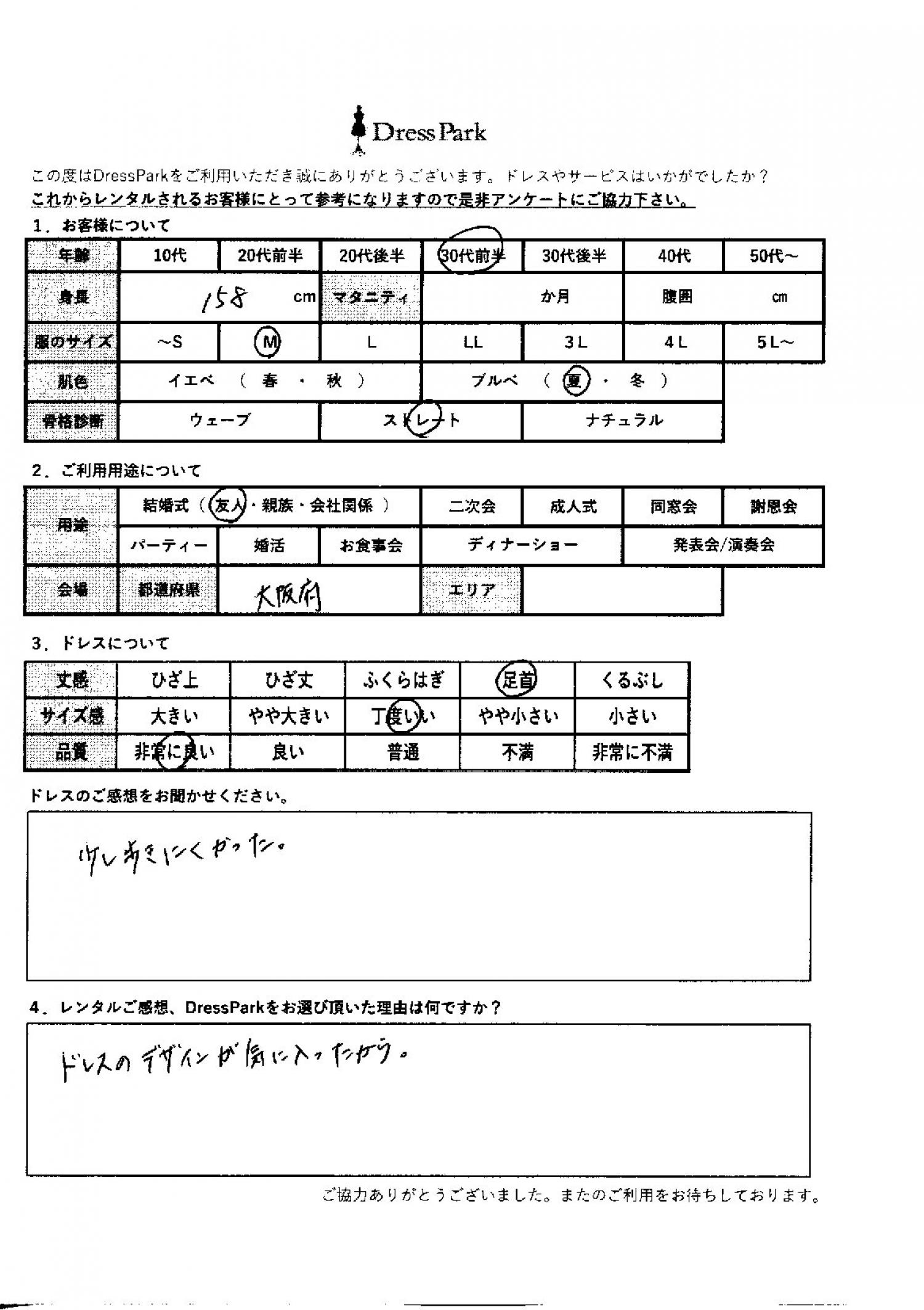 大阪府 M.O様158㎝ Mサイズ #30代#M/L#155~159㎝#結婚式(友人)#大阪府 ◆レンタルしたドレスはこちら ◆レンタルしたサイズは:M ◆レンタルした日付:2025/09/06 ドレスの着用感 ◆点数: (5点) ◆丈感:足首 ◆サイズ感:丁度いい ◆品質:非常に良い ◆肌色:ブルべ ◆骨格診断:ストレート ドレスの感想 少し歩きにくかった。 レンタルのご感想、DressParkをお選び頂いた理由 ドレスのデザインが気に入ったから。 CUSTOMER REVIEWS お客様の声 気になるカテゴリー別にご利用の感想をチェック! ◆AGE 年代で見る 10代 20代 30代 40代 50代~ ◆SIZE サイズで見る SS/S M/L 大きいサイズLL~ ◆HIGHT 身長で見る 140~149㎝ 150~154㎝ 155~159㎝ 160~164㎝ 165~169㎝ 170㎝以上 ◆マタニティ ~3か月 4~6か月 7~8か月 9~10か月 ◆肌色 イエベ ブルべ ◆骨格診断 ウェーブ ストレート ナチュラル ◆利用シーン 結婚式(友人) 結婚式(親族) 結婚式(会社関係) 二次会 成人式 謝恩会 パーティー その他 CUSTOMER REVIEWS都道府県別お客様の声 都道府県別にのお客様の声をチェック! 北海道 青森県 岩手県 宮城県 秋田県 山形県 福島県 茨城県 栃木県 群馬県 埼玉県 千葉県 東京都 神奈川県 新潟県 富山県 石川県 福井県 山梨県 長野県 岐阜県 静岡県 愛知県 三重県 滋賀県 京都府 大阪府 兵庫県 奈良県 和歌山県 鳥取県 島根県 岡山県 広島県 山口県 徳島県 香川県 愛媛県 高知県 福岡県 佐賀県 長崎県 熊本県 大分県 宮崎県 鹿児島県 沖縄県 CUSTOMER REVIEWSエリア別お客様の声 都道府県別にのお客様の声をチェック! 札幌 仙台 名古屋 軽井沢 金沢 神戸・芦屋 博多 那覇 梅田・新大阪 難波・心斎橋 鎌倉・湘南 横浜・みなとみらい 舞浜・浦安・幕張 大宮・浦和 青山・表参道 六本木・麻布 渋谷・恵比寿 新宿 池袋 銀座・丸の内 お台場・汐留 鹿児島市 郡山市 福島市 東予 甲府・石和 LINEでお問い合わせ このサイトではJavaScriptを使用しています