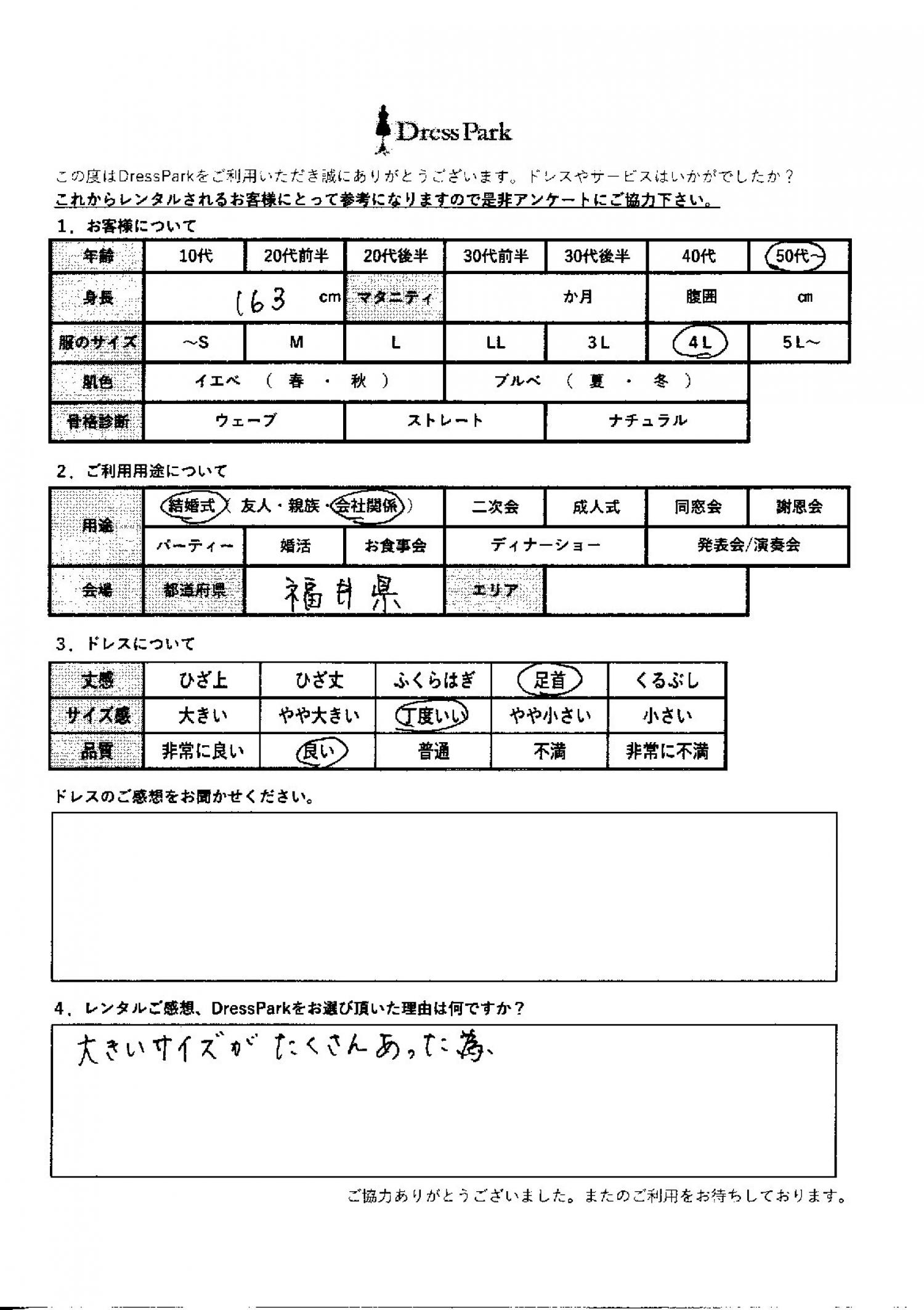 福井県 C.H様163㎝ 4Lサイズ #50代~#大きいサイズLL~#160~164㎝#結婚式(会社関係)#福井県 ◆レンタルしたドレスはこちら ◆レンタルしたサイズは:4L ◆レンタルした日付:2025/09/06 ドレスの着用感 ◆点数: (4点) ◆丈感:足首 ◆サイズ感:丁度いい ◆品質:良い レンタルのご感想、DressParkをお選び頂いた理由 大きいサイズがたくさんあったため。 CUSTOMER REVIEWS お客様の声 気になるカテゴリー別にご利用の感想をチェック! ◆AGE 年代で見る 10代 20代 30代 40代 50代~ ◆SIZE サイズで見る SS/S M/L 大きいサイズLL~ ◆HIGHT 身長で見る 140~149㎝ 150~154㎝ 155~159㎝ 160~164㎝ 165~169㎝ 170㎝以上 ◆マタニティ ~3か月 4~6か月 7~8か月 9~10か月 ◆肌色 イエベ ブルべ ◆骨格診断 ウェーブ ストレート ナチュラル ◆利用シーン 結婚式(友人) 結婚式(親族) 結婚式(会社関係) 二次会 成人式 謝恩会 パーティー その他 CUSTOMER REVIEWS都道府県別お客様の声 都道府県別にのお客様の声をチェック! 北海道 青森県 岩手県 宮城県 秋田県 山形県 福島県 茨城県 栃木県 群馬県 埼玉県 千葉県 東京都 神奈川県 新潟県 富山県 石川県 福井県 山梨県 長野県 岐阜県 静岡県 愛知県 三重県 滋賀県 京都府 大阪府 兵庫県 奈良県 和歌山県 鳥取県 島根県 岡山県 広島県 山口県 徳島県 香川県 愛媛県 高知県 福岡県 佐賀県 長崎県 熊本県 大分県 宮崎県 鹿児島県 沖縄県 CUSTOMER REVIEWSエリア別お客様の声 都道府県別にのお客様の声をチェック! 札幌 仙台 名古屋 軽井沢 金沢 神戸・芦屋 博多 那覇 梅田・新大阪 難波・心斎橋 鎌倉・湘南 横浜・みなとみらい 舞浜・浦安・幕張 大宮・浦和 青山・表参道 六本木・麻布 渋谷・恵比寿 新宿 池袋 銀座・丸の内 お台場・汐留 鹿児島市 郡山市 福島市 東予 甲府・石和 LINEでお問い合わせ このサイトではJavaScriptを使用しています