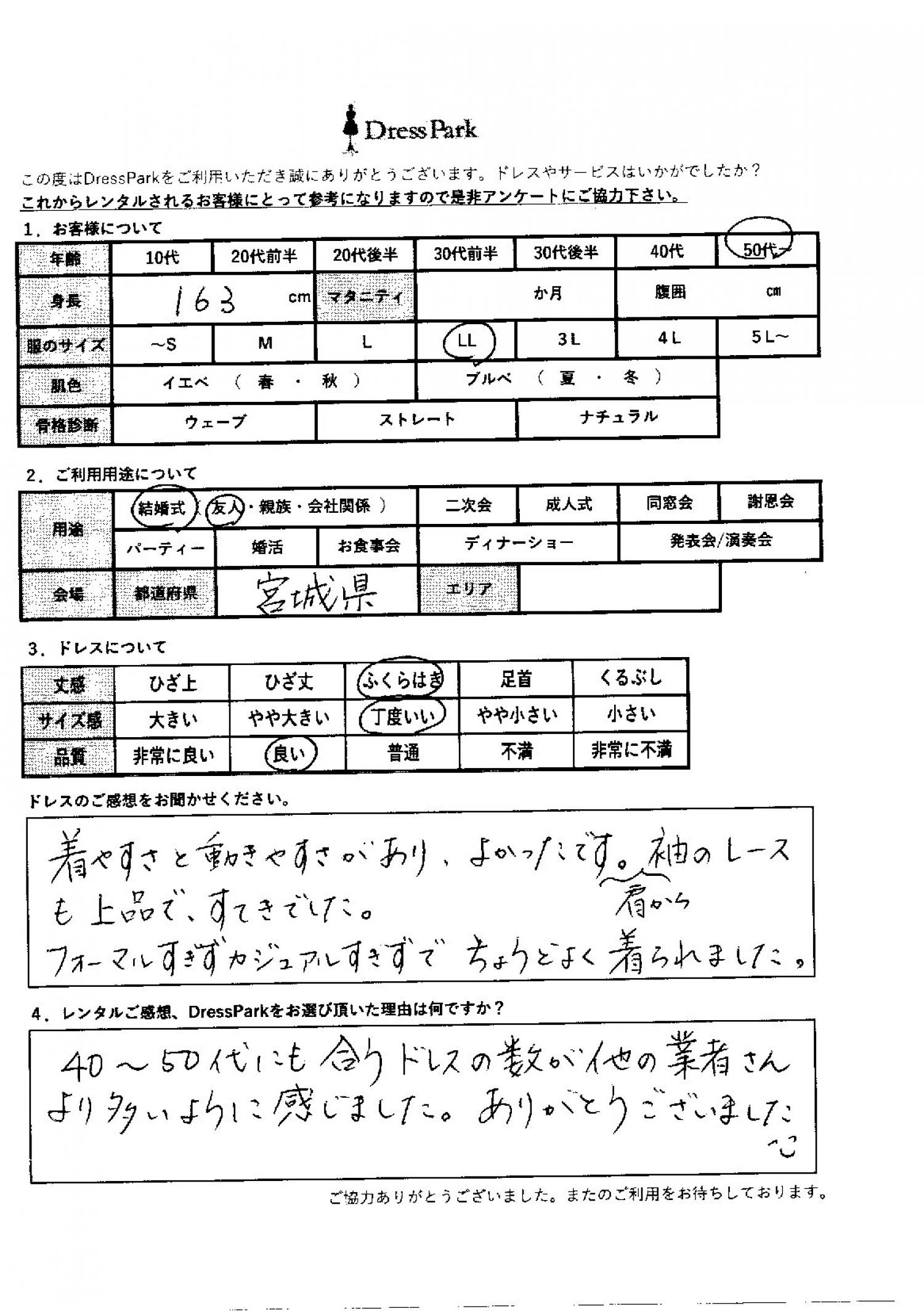 宮城県 N.N様163㎝ LLサイズ #50代~#大きいサイズLL~#160~164㎝#結婚式(友人)#宮城県 ◆レンタルしたドレスはこちら ◆レンタルしたサイズは:LL ◆レンタルした日付:2025/09/14 ドレスの着用感 ◆点数: (4点) ◆丈感:ふくらはぎ ◆サイズ感:丁度いい ◆品質:良い ドレスの感想 気やさと動きやすさがあり良かったです。肩から袖のレースも上品で素敵でした。フォーマルすぎず、カジュアルすぎずでちょうど良く着られました。 レンタルのご感想、DressParkをお選び頂いた理由 40から50代にも合うドレスの種類が他の業者さんより多いように感じました。ありがとうございました。 CUSTOMER REVIEWS お客様の声 気になるカテゴリー別にご利用の感想をチェック! ◆AGE 年代で見る 10代 20代 30代 40代 50代~ ◆SIZE サイズで見る SS/S M/L 大きいサイズLL~ ◆HIGHT 身長で見る 140~149㎝ 150~154㎝ 155~159㎝ 160~164㎝ 165~169㎝ 170㎝以上 ◆マタニティ ~3か月 4~6か月 7~8か月 9~10か月 ◆肌色 イエベ ブルべ ◆骨格診断 ウェーブ ストレート ナチュラル ◆利用シーン 結婚式(友人) 結婚式(親族) 結婚式(会社関係) 二次会 成人式 謝恩会 パーティー その他 CUSTOMER REVIEWS都道府県別お客様の声 都道府県別にのお客様の声をチェック! 北海道 青森県 岩手県 宮城県 秋田県 山形県 福島県 茨城県 栃木県 群馬県 埼玉県 千葉県 東京都 神奈川県 新潟県 富山県 石川県 福井県 山梨県 長野県 岐阜県 静岡県 愛知県 三重県 滋賀県 京都府 大阪府 兵庫県 奈良県 和歌山県 鳥取県 島根県 岡山県 広島県 山口県 徳島県 香川県 愛媛県 高知県 福岡県 佐賀県 長崎県 熊本県 大分県 宮崎県 鹿児島県 沖縄県 CUSTOMER REVIEWSエリア別お客様の声 都道府県別にのお客様の声をチェック! 札幌 仙台 名古屋 軽井沢 金沢 神戸・芦屋 博多 那覇 梅田・新大阪 難波・心斎橋 鎌倉・湘南 横浜・みなとみらい 舞浜・浦安・幕張 大宮・浦和 青山・表参道 六本木・麻布 渋谷・恵比寿 新宿 池袋 銀座・丸の内 お台場・汐留 鹿児島市 郡山市 福島市 東予 甲府・石和 LINEでお問い合わせ このサイトではJavaScriptを使用しています