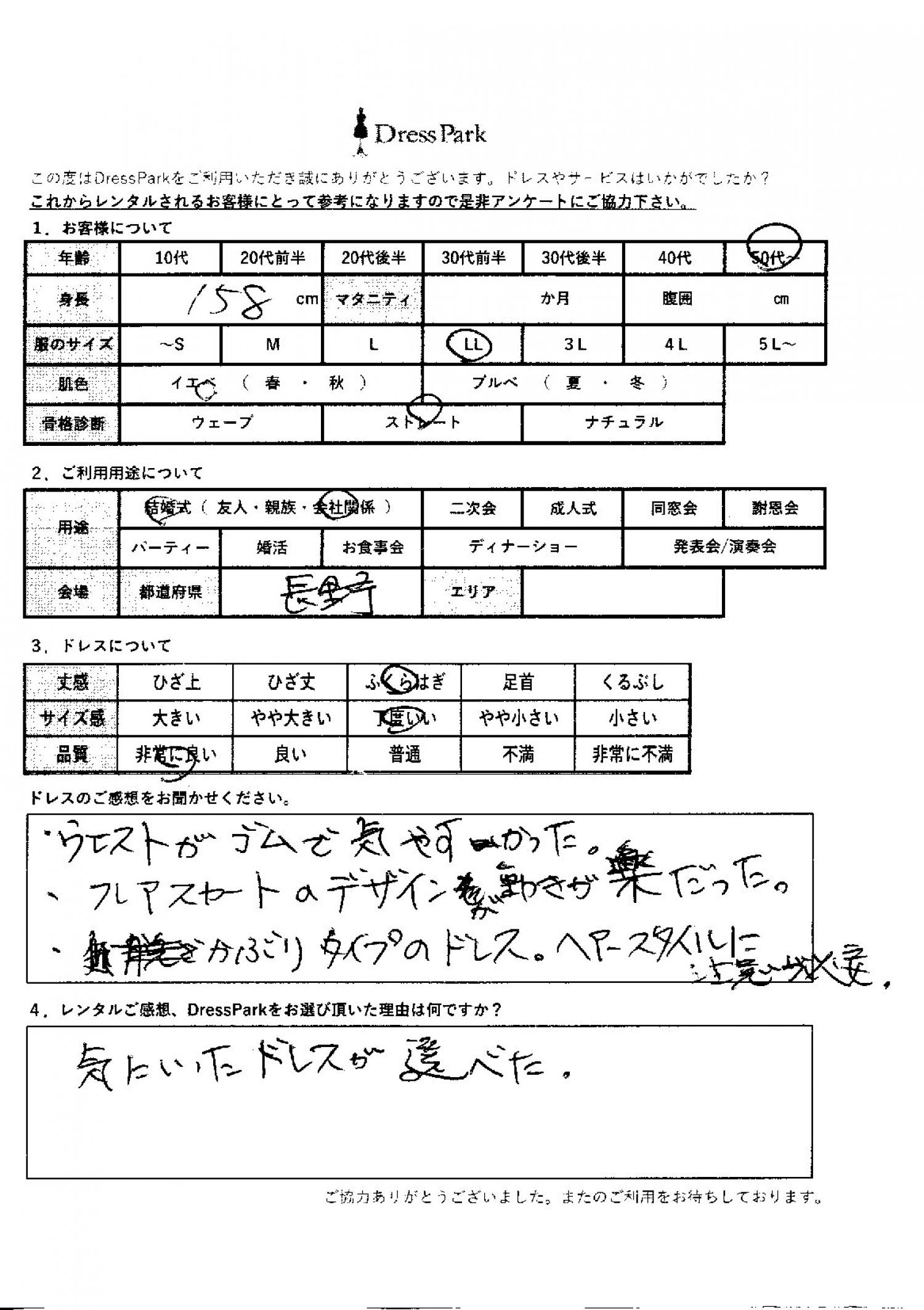 長野県 Y.S様158㎝ LLサイズ #50代~#大きいサイズLL~#155~159㎝#結婚式(会社関係)#長野県 ◆レンタルしたドレスはこちら ◆レンタルしたサイズは:LL ◆レンタルした日付:2025/09/15 ドレスの着用感 ◆点数: (5点) ◆丈感:ふくらはぎ ◆サイズ感:丁度いい ◆品質:非常に良い ◆肌色:イエベ ◆骨格診断:ストレート ドレスの感想 ・ウェストがゴムできやすかった。 ・フレアスカートのデザインが動きが楽だった。 ・かぶりタイプのドレス。ヘアスタイルに注意が必要。 レンタルのご感想、DressParkをお選び頂いた理由 気に入ったドレスが選べた。 CUSTOMER REVIEWS お客様の声 気になるカテゴリー別にご利用の感想をチェック! ◆AGE 年代で見る 10代 20代 30代 40代 50代~ ◆SIZE サイズで見る SS/S M/L 大きいサイズLL~ ◆HIGHT 身長で見る 140~149㎝ 150~154㎝ 155~159㎝ 160~164㎝ 165~169㎝ 170㎝以上 ◆マタニティ ~3か月 4~6か月 7~8か月 9~10か月 ◆肌色 イエベ ブルべ ◆骨格診断 ウェーブ ストレート ナチュラル ◆利用シーン 結婚式(友人) 結婚式(親族) 結婚式(会社関係) 二次会 成人式 謝恩会 パーティー その他 CUSTOMER REVIEWS都道府県別お客様の声 都道府県別にのお客様の声をチェック! 北海道 青森県 岩手県 宮城県 秋田県 山形県 福島県 茨城県 栃木県 群馬県 埼玉県 千葉県 東京都 神奈川県 新潟県 富山県 石川県 福井県 山梨県 長野県 岐阜県 静岡県 愛知県 三重県 滋賀県 京都府 大阪府 兵庫県 奈良県 和歌山県 鳥取県 島根県 岡山県 広島県 山口県 徳島県 香川県 愛媛県 高知県 福岡県 佐賀県 長崎県 熊本県 大分県 宮崎県 鹿児島県 沖縄県 CUSTOMER REVIEWSエリア別お客様の声 都道府県別にのお客様の声をチェック! 札幌 仙台 名古屋 軽井沢 金沢 神戸・芦屋 博多 那覇 梅田・新大阪 難波・心斎橋 鎌倉・湘南 横浜・みなとみらい 舞浜・浦安・幕張 大宮・浦和 青山・表参道 六本木・麻布 渋谷・恵比寿 新宿 池袋 銀座・丸の内 お台場・汐留 鹿児島市 郡山市 福島市 東予 甲府・石和 LINEでお問い合わせ このサイトではJavaScriptを使用しています
