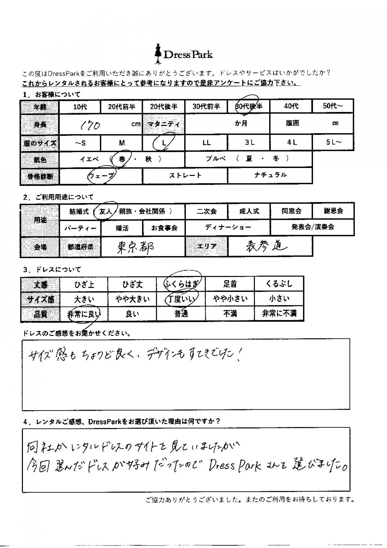 東京都 M.N様170㎝ Lサイズ青山・表参道 #30代#M/L#170㎝以上#結婚式(友人)#東京都#青山・表参道 ◆レンタルしたドレスはこちら ◆レンタルしたサイズは:L ◆レンタルした日付:2025/09/15 ドレスの着用感 ◆点数: (5点) ◆丈感:ふくらはぎ ◆サイズ感:丁度いい ◆品質:非常に良い ◆肌色:イエベ ◆骨格診断:ウェーブ ドレスの感想 サイズ感もちょうど良く、デザインも素敵でした! レンタルのご感想、DressParkをお選び頂いた理由 何社かレンタルドレスのサイトを見ていましたが、今回選んだドレスが好みだったので、ドレスパークさんを選びました。 CUSTOMER REVIEWS お客様の声 気になるカテゴリー別にご利用の感想をチェック! ◆AGE 年代で見る 10代 20代 30代 40代 50代~ ◆SIZE サイズで見る SS/S M/L 大きいサイズLL~ ◆HIGHT 身長で見る 140~149㎝ 150~154㎝ 155~159㎝ 160~164㎝ 165~169㎝ 170㎝以上 ◆マタニティ ~3か月 4~6か月 7~8か月 9~10か月 ◆肌色 イエベ ブルべ ◆骨格診断 ウェーブ ストレート ナチュラル ◆利用シーン 結婚式(友人) 結婚式(親族) 結婚式(会社関係) 二次会 成人式 謝恩会 パーティー その他 CUSTOMER REVIEWS都道府県別お客様の声 都道府県別にのお客様の声をチェック! 北海道 青森県 岩手県 宮城県 秋田県 山形県 福島県 茨城県 栃木県 群馬県 埼玉県 千葉県 東京都 神奈川県 新潟県 富山県 石川県 福井県 山梨県 長野県 岐阜県 静岡県 愛知県 三重県 滋賀県 京都府 大阪府 兵庫県 奈良県 和歌山県 鳥取県 島根県 岡山県 広島県 山口県 徳島県 香川県 愛媛県 高知県 福岡県 佐賀県 長崎県 熊本県 大分県 宮崎県 鹿児島県 沖縄県 CUSTOMER REVIEWSエリア別お客様の声 都道府県別にのお客様の声をチェック! 札幌 仙台 名古屋 軽井沢 金沢 神戸・芦屋 博多 那覇 梅田・新大阪 難波・心斎橋 鎌倉・湘南 横浜・みなとみらい 舞浜・浦安・幕張 大宮・浦和 青山・表参道 六本木・麻布 渋谷・恵比寿 新宿 池袋 銀座・丸の内 お台場・汐留 鹿児島市 郡山市 福島市 東予 甲府・石和 LINEでお問い合わせ このサイトではJavaScriptを使用しています