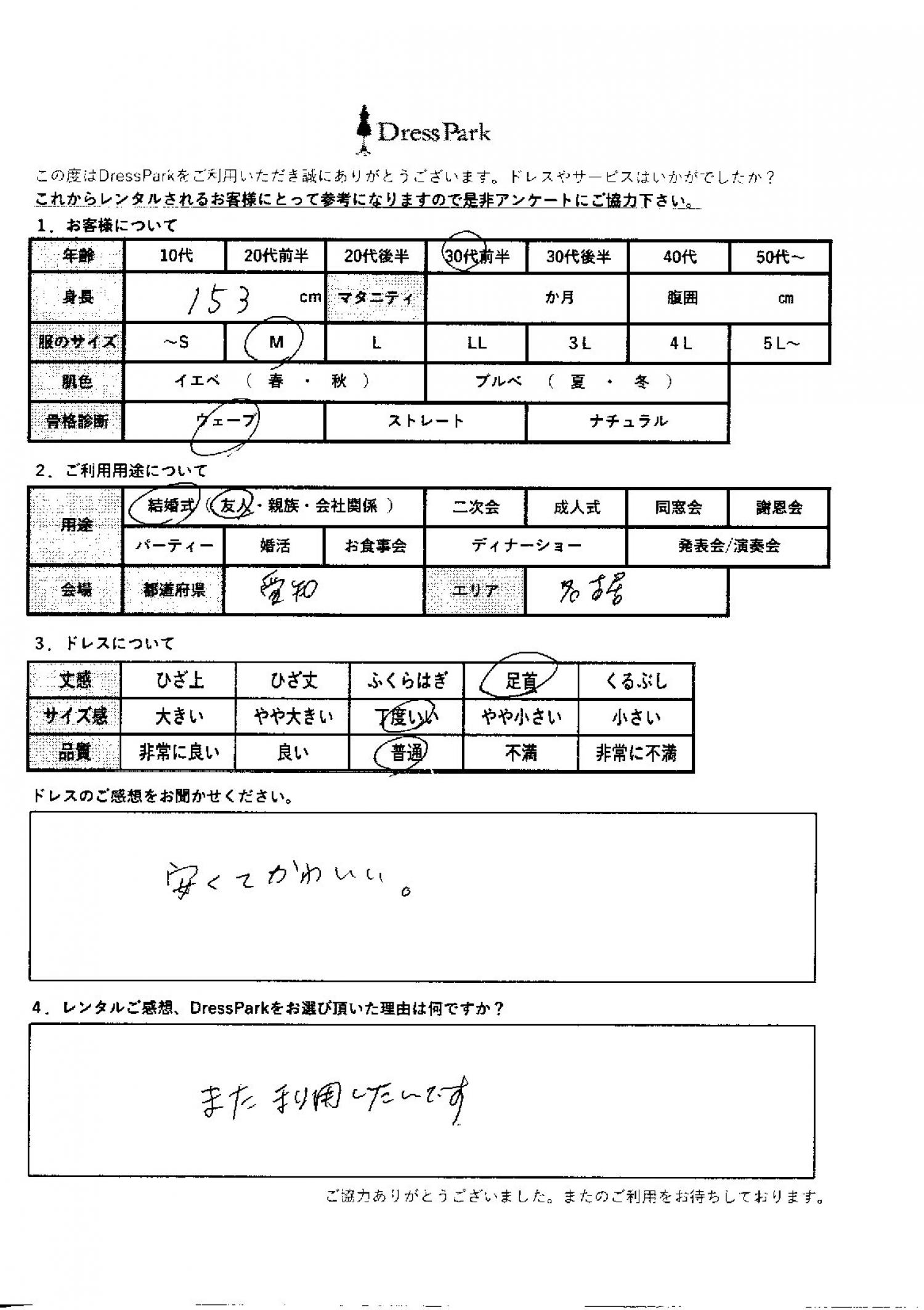 愛知県 S.A様153㎝ Mサイズ名古屋 #30代#M/L#150~154㎝#結婚式(友人)#愛知県#名古屋 ◆レンタルしたドレスはこちら ◆レンタルしたサイズは:M ◆レンタルした日付:2025/09/20 ドレスの着用感 ◆点数: (4点) ◆丈感:足首 ◆サイズ感:丁度いい ◆品質:普通 ◆骨格診断:ウェーブ ドレスの感想 安くてかわいい。 レンタルのご感想、DressParkをお選び頂いた理由 また利用したいです。 CUSTOMER REVIEWS お客様の声 気になるカテゴリー別にご利用の感想をチェック! ◆AGE 年代で見る 10代 20代 30代 40代 50代~ ◆SIZE サイズで見る SS/S M/L 大きいサイズLL~ ◆HIGHT 身長で見る 140~149㎝ 150~154㎝ 155~159㎝ 160~164㎝ 165~169㎝ 170㎝以上 ◆マタニティ ~3か月 4~6か月 7~8か月 9~10か月 ◆肌色 イエベ ブルべ ◆骨格診断 ウェーブ ストレート ナチュラル ◆利用シーン 結婚式(友人) 結婚式(親族) 結婚式(会社関係) 二次会 成人式 謝恩会 パーティー その他 CUSTOMER REVIEWS都道府県別お客様の声 都道府県別にのお客様の声をチェック! 北海道 青森県 岩手県 宮城県 秋田県 山形県 福島県 茨城県 栃木県 群馬県 埼玉県 千葉県 東京都 神奈川県 新潟県 富山県 石川県 福井県 山梨県 長野県 岐阜県 静岡県 愛知県 三重県 滋賀県 京都府 大阪府 兵庫県 奈良県 和歌山県 鳥取県 島根県 岡山県 広島県 山口県 徳島県 香川県 愛媛県 高知県 福岡県 佐賀県 長崎県 熊本県 大分県 宮崎県 鹿児島県 沖縄県 CUSTOMER REVIEWSエリア別お客様の声 都道府県別にのお客様の声をチェック! 札幌 仙台 名古屋 軽井沢 金沢 神戸・芦屋 博多 那覇 梅田・新大阪 難波・心斎橋 鎌倉・湘南 横浜・みなとみらい 舞浜・浦安・幕張 大宮・浦和 青山・表参道 六本木・麻布 渋谷・恵比寿 新宿 池袋 銀座・丸の内 お台場・汐留 鹿児島市 郡山市 福島市 東予 甲府・石和 LINEでお問い合わせ このサイトではJavaScriptを使用しています