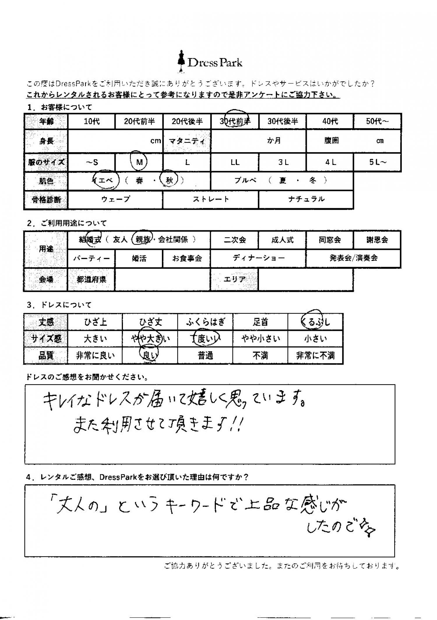 兵庫県 R.Y様0㎝ Mサイズ #30代#M/L#結婚式(親族)#兵庫県 ◆レンタルしたドレスはこちら ◆レンタルしたサイズは:M ◆レンタルした日付:2025/09/20 ドレスの着用感 ◆点数: (5点) ◆丈感:くるぶし ◆サイズ感:丁度いい ◆品質:良い ◆肌色:イエベ ドレスの感想 きれいなドレスが届いて嬉しく思っています。また利用させていただきます! レンタルのご感想、DressParkをお選び頂いた理由 「大人の」と言うキーワードで上品な感じがしたので。 CUSTOMER REVIEWS お客様の声 気になるカテゴリー別にご利用の感想をチェック! ◆AGE 年代で見る 10代 20代 30代 40代 50代~ ◆SIZE サイズで見る SS/S M/L 大きいサイズLL~ ◆HIGHT 身長で見る 140~149㎝ 150~154㎝ 155~159㎝ 160~164㎝ 165~169㎝ 170㎝以上 ◆マタニティ ~3か月 4~6か月 7~8か月 9~10か月 ◆肌色 イエベ ブルべ ◆骨格診断 ウェーブ ストレート ナチュラル ◆利用シーン 結婚式(友人) 結婚式(親族) 結婚式(会社関係) 二次会 成人式 謝恩会 パーティー その他 CUSTOMER REVIEWS都道府県別お客様の声 都道府県別にのお客様の声をチェック! 北海道 青森県 岩手県 宮城県 秋田県 山形県 福島県 茨城県 栃木県 群馬県 埼玉県 千葉県 東京都 神奈川県 新潟県 富山県 石川県 福井県 山梨県 長野県 岐阜県 静岡県 愛知県 三重県 滋賀県 京都府 大阪府 兵庫県 奈良県 和歌山県 鳥取県 島根県 岡山県 広島県 山口県 徳島県 香川県 愛媛県 高知県 福岡県 佐賀県 長崎県 熊本県 大分県 宮崎県 鹿児島県 沖縄県 CUSTOMER REVIEWSエリア別お客様の声 都道府県別にのお客様の声をチェック! 札幌 仙台 名古屋 軽井沢 金沢 神戸・芦屋 博多 那覇 梅田・新大阪 難波・心斎橋 鎌倉・湘南 横浜・みなとみらい 舞浜・浦安・幕張 大宮・浦和 青山・表参道 六本木・麻布 渋谷・恵比寿 新宿 池袋 銀座・丸の内 お台場・汐留 鹿児島市 郡山市 福島市 東予 甲府・石和 LINEでお問い合わせ このサイトではJavaScriptを使用しています