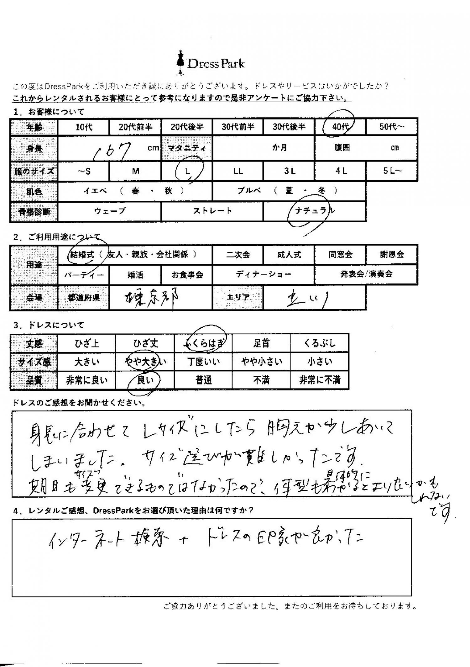 東京都 Y.K様167㎝ Lサイズ #40代#M/L#165~169㎝#結婚式(友人)#東京都 ◆レンタルしたドレスはこちら ◆レンタルしたサイズは:L ◆レンタルした日付:2025/09/20 ドレスの着用感 ◆点数: (4点) ◆丈感:ふくらはぎ ◆サイズ感:やや大きい ◆品質:良い ◆骨格診断:ナチュラル ドレスの感想 身長に合わせてLサイズにしたら胸元が少しあいてしまいました。サイズ選びが難しかったです。期日もサイズ変更できるものではなかったので、体型も具体的にわかると良いかもしれないです。 レンタルのご感想、DressParkをお選び頂いた理由 インターネット検索+ドレスの印象が良かった。 CUSTOMER REVIEWS お客様の声 気になるカテゴリー別にご利用の感想をチェック! ◆AGE 年代で見る 10代 20代 30代 40代 50代~ ◆SIZE サイズで見る SS/S M/L 大きいサイズLL~ ◆HIGHT 身長で見る 140~149㎝ 150~154㎝ 155~159㎝ 160~164㎝ 165~169㎝ 170㎝以上 ◆マタニティ ~3か月 4~6か月 7~8か月 9~10か月 ◆肌色 イエベ ブルべ ◆骨格診断 ウェーブ ストレート ナチュラル ◆利用シーン 結婚式(友人) 結婚式(親族) 結婚式(会社関係) 二次会 成人式 謝恩会 パーティー その他 CUSTOMER REVIEWS都道府県別お客様の声 都道府県別にのお客様の声をチェック! 北海道 青森県 岩手県 宮城県 秋田県 山形県 福島県 茨城県 栃木県 群馬県 埼玉県 千葉県 東京都 神奈川県 新潟県 富山県 石川県 福井県 山梨県 長野県 岐阜県 静岡県 愛知県 三重県 滋賀県 京都府 大阪府 兵庫県 奈良県 和歌山県 鳥取県 島根県 岡山県 広島県 山口県 徳島県 香川県 愛媛県 高知県 福岡県 佐賀県 長崎県 熊本県 大分県 宮崎県 鹿児島県 沖縄県 CUSTOMER REVIEWSエリア別お客様の声 都道府県別にのお客様の声をチェック! 札幌 仙台 名古屋 軽井沢 金沢 神戸・芦屋 博多 那覇 梅田・新大阪 難波・心斎橋 鎌倉・湘南 横浜・みなとみらい 舞浜・浦安・幕張 大宮・浦和 青山・表参道 六本木・麻布 渋谷・恵比寿 新宿 池袋 銀座・丸の内 お台場・汐留 鹿児島市 郡山市 福島市 東予 甲府・石和 LINEでお問い合わせ このサイトではJavaScriptを使用しています