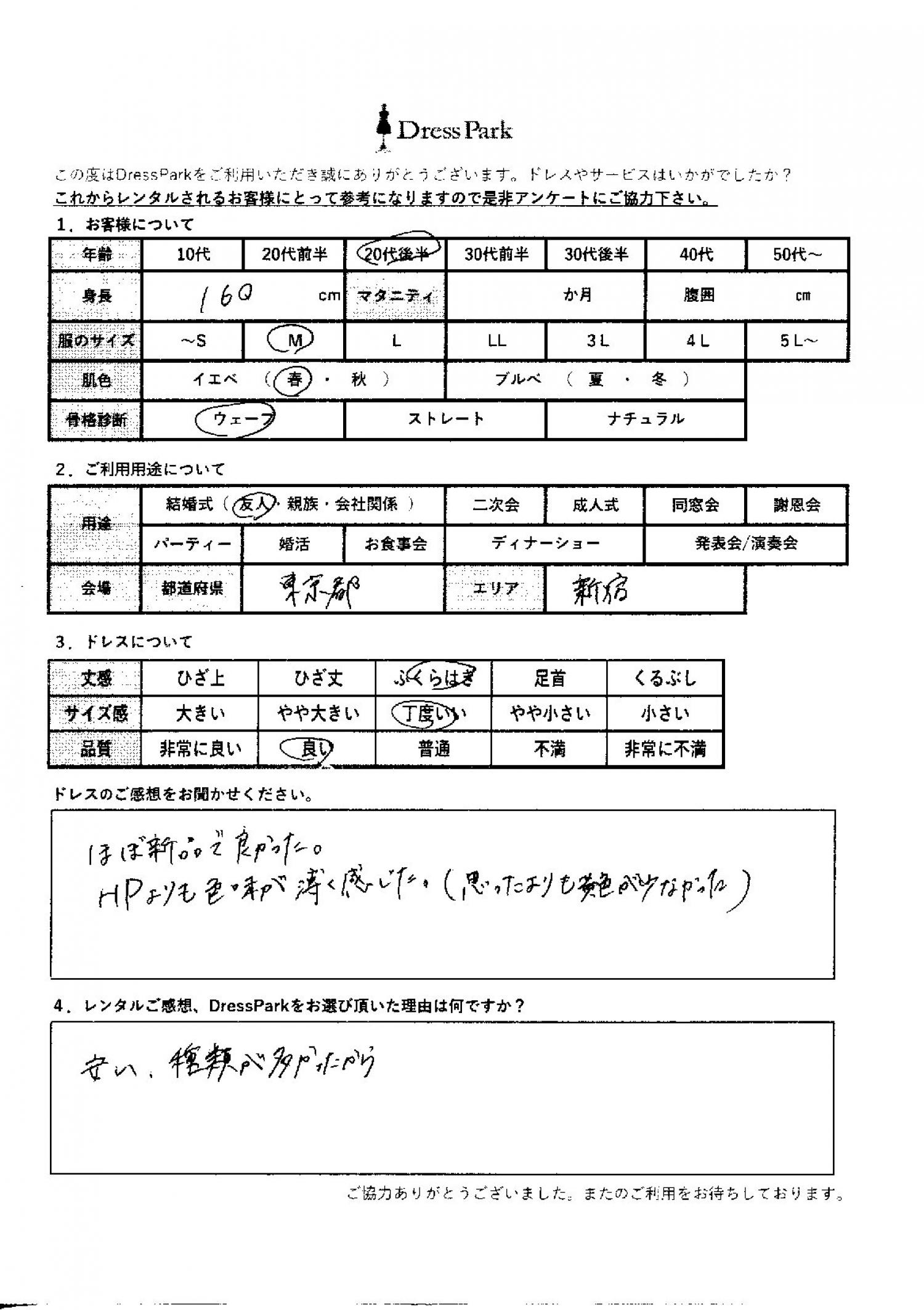 東京都 J.N様160㎝ Mサイズ新宿 #20代#M/L#160~164㎝#結婚式(友人)#東京都#新宿 ◆レンタルしたドレスはこちら ◆レンタルしたサイズは:M ◆レンタルした日付:2025/09/20 ドレスの着用感 ◆点数: (4点) ◆丈感:ふくらはぎ ◆サイズ感:丁度いい ◆品質:良い ◆肌色:イエベ ◆骨格診断:ウェーブ ドレスの感想 ほぼ新品でよかった。ホームページよりも色味が薄く感じた。(思ったよりも黄味が少なかった。) レンタルのご感想、DressParkをお選び頂いた理由 安い、種類が多かったから。 CUSTOMER REVIEWS お客様の声 気になるカテゴリー別にご利用の感想をチェック! ◆AGE 年代で見る 10代 20代 30代 40代 50代~ ◆SIZE サイズで見る SS/S M/L 大きいサイズLL~ ◆HIGHT 身長で見る 140~149㎝ 150~154㎝ 155~159㎝ 160~164㎝ 165~169㎝ 170㎝以上 ◆マタニティ ~3か月 4~6か月 7~8か月 9~10か月 ◆肌色 イエベ ブルべ ◆骨格診断 ウェーブ ストレート ナチュラル ◆利用シーン 結婚式(友人) 結婚式(親族) 結婚式(会社関係) 二次会 成人式 謝恩会 パーティー その他 CUSTOMER REVIEWS都道府県別お客様の声 都道府県別にのお客様の声をチェック! 北海道 青森県 岩手県 宮城県 秋田県 山形県 福島県 茨城県 栃木県 群馬県 埼玉県 千葉県 東京都 神奈川県 新潟県 富山県 石川県 福井県 山梨県 長野県 岐阜県 静岡県 愛知県 三重県 滋賀県 京都府 大阪府 兵庫県 奈良県 和歌山県 鳥取県 島根県 岡山県 広島県 山口県 徳島県 香川県 愛媛県 高知県 福岡県 佐賀県 長崎県 熊本県 大分県 宮崎県 鹿児島県 沖縄県 CUSTOMER REVIEWSエリア別お客様の声 都道府県別にのお客様の声をチェック! 札幌 仙台 名古屋 軽井沢 金沢 神戸・芦屋 博多 那覇 梅田・新大阪 難波・心斎橋 鎌倉・湘南 横浜・みなとみらい 舞浜・浦安・幕張 大宮・浦和 青山・表参道 六本木・麻布 渋谷・恵比寿 新宿 池袋 銀座・丸の内 お台場・汐留 鹿児島市 郡山市 福島市 東予 甲府・石和 LINEでお問い合わせ このサイトではJavaScriptを使用しています