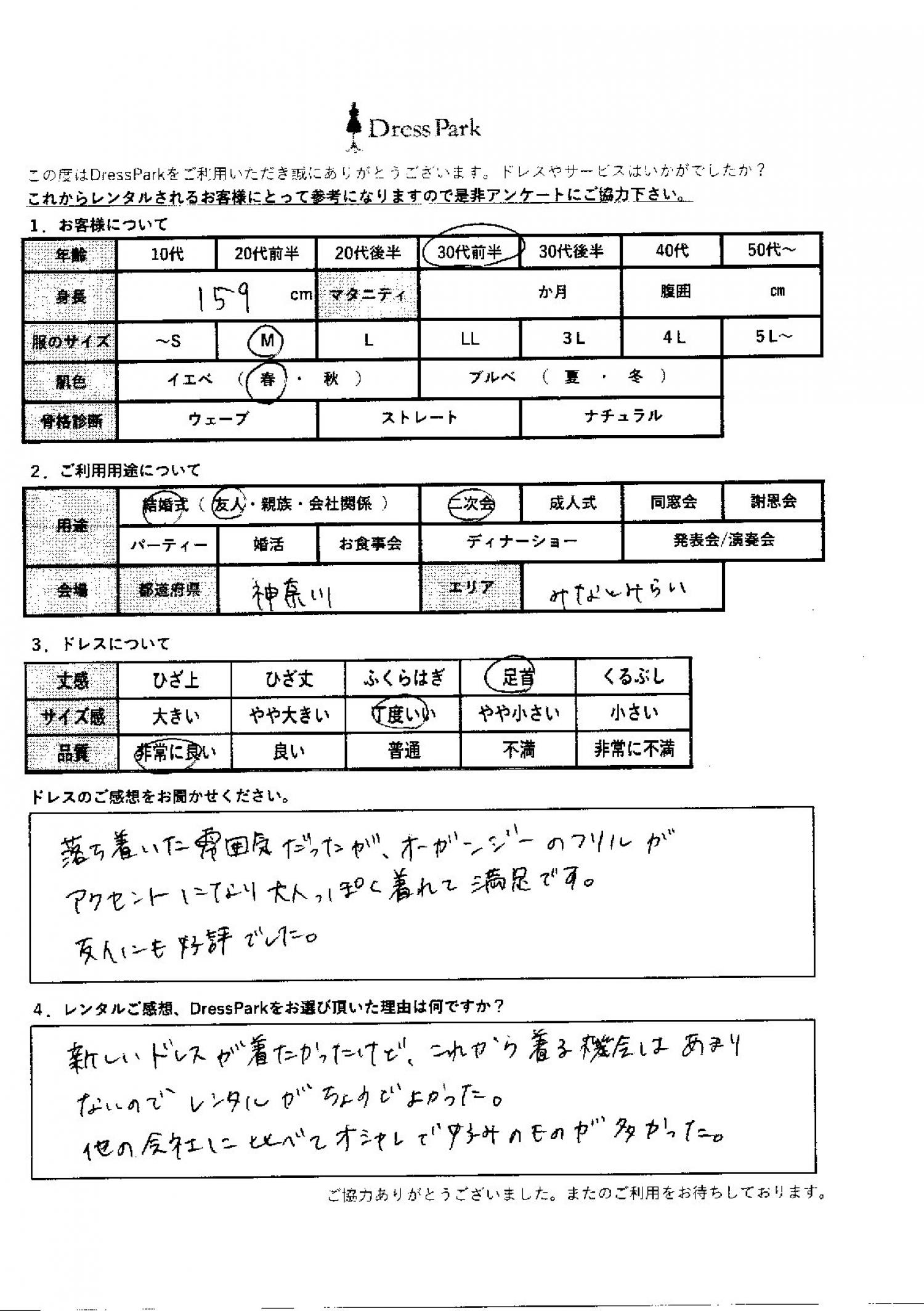 神奈川県 M.T様159㎝ Mサイズ横浜・みなとみらい #30代#M/L#155~159㎝#結婚式(友人)#神奈川県#横浜・みなとみらい ◆レンタルしたドレスはこちら ◆レンタルしたサイズは:M ◆レンタルした日付:2025/09/20 ドレスの着用感 ◆点数: (5点) ◆丈感:足首 ◆サイズ感:丁度いい ◆品質:非常に良い ◆肌色:イエベ ドレスの感想 落ち着いた雰囲気だったが、オーガンジーのフリルがアクセントになり、大人っぽく着られて満足です。友人にも好評でした。 レンタルのご感想、DressParkをお選び頂いた理由 新しいドレスが着たかったけど、これから着る機会はあまりないので、レンタルがちょうど良かった。他の会社に比べておしゃれで好みのものが多かった。 CUSTOMER REVIEWS お客様の声 気になるカテゴリー別にご利用の感想をチェック! ◆AGE 年代で見る 10代 20代 30代 40代 50代~ ◆SIZE サイズで見る SS/S M/L 大きいサイズLL~ ◆HIGHT 身長で見る 140~149㎝ 150~154㎝ 155~159㎝ 160~164㎝ 165~169㎝ 170㎝以上 ◆マタニティ ~3か月 4~6か月 7~8か月 9~10か月 ◆肌色 イエベ ブルべ ◆骨格診断 ウェーブ ストレート ナチュラル ◆利用シーン 結婚式(友人) 結婚式(親族) 結婚式(会社関係) 二次会 成人式 謝恩会 パーティー その他 CUSTOMER REVIEWS都道府県別お客様の声 都道府県別にのお客様の声をチェック! 北海道 青森県 岩手県 宮城県 秋田県 山形県 福島県 茨城県 栃木県 群馬県 埼玉県 千葉県 東京都 神奈川県 新潟県 富山県 石川県 福井県 山梨県 長野県 岐阜県 静岡県 愛知県 三重県 滋賀県 京都府 大阪府 兵庫県 奈良県 和歌山県 鳥取県 島根県 岡山県 広島県 山口県 徳島県 香川県 愛媛県 高知県 福岡県 佐賀県 長崎県 熊本県 大分県 宮崎県 鹿児島県 沖縄県 CUSTOMER REVIEWSエリア別お客様の声 都道府県別にのお客様の声をチェック! 札幌 仙台 名古屋 軽井沢 金沢 神戸・芦屋 博多 那覇 梅田・新大阪 難波・心斎橋 鎌倉・湘南 横浜・みなとみらい 舞浜・浦安・幕張 大宮・浦和 青山・表参道 六本木・麻布 渋谷・恵比寿 新宿 池袋 銀座・丸の内 お台場・汐留 鹿児島市 郡山市 福島市 東予 甲府・石和 LINEでお問い合わせ このサイトではJavaScriptを使用しています