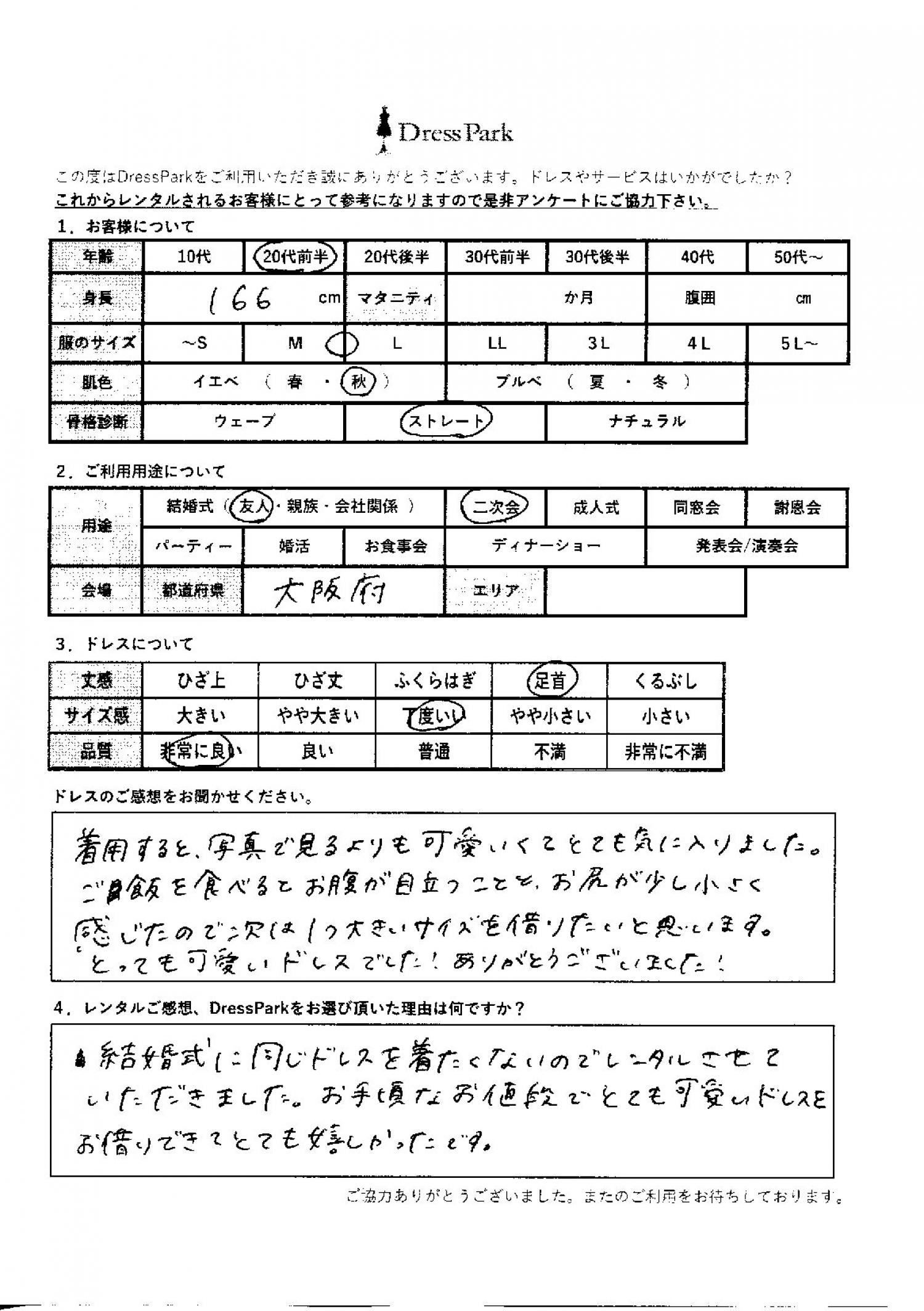 着用すると、写真で見るよりも可愛くてとても気に入りました。ご飯を食べるとお腹が目立つこと、お尻が少し小さく感じたので、次は1つ大きいサイズを借りたいと思います。とってもかわいいドレスでした!ありがとうございました!