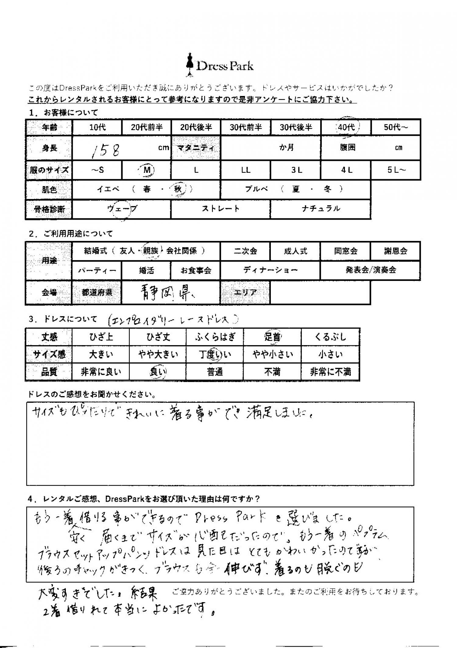 もう1着安く借りることができるので、ドレスパークを選びました。届くまでサイズが心配だったので。もう1着のペップラムブラウスセットアップパンツドレスは見た目はとても可愛かったのですが、後ろのチャックがきつくブラウスも全く伸びず、着るのも脱ぐのも大変すぎでした。結果2着借り入れて本当によかったです。