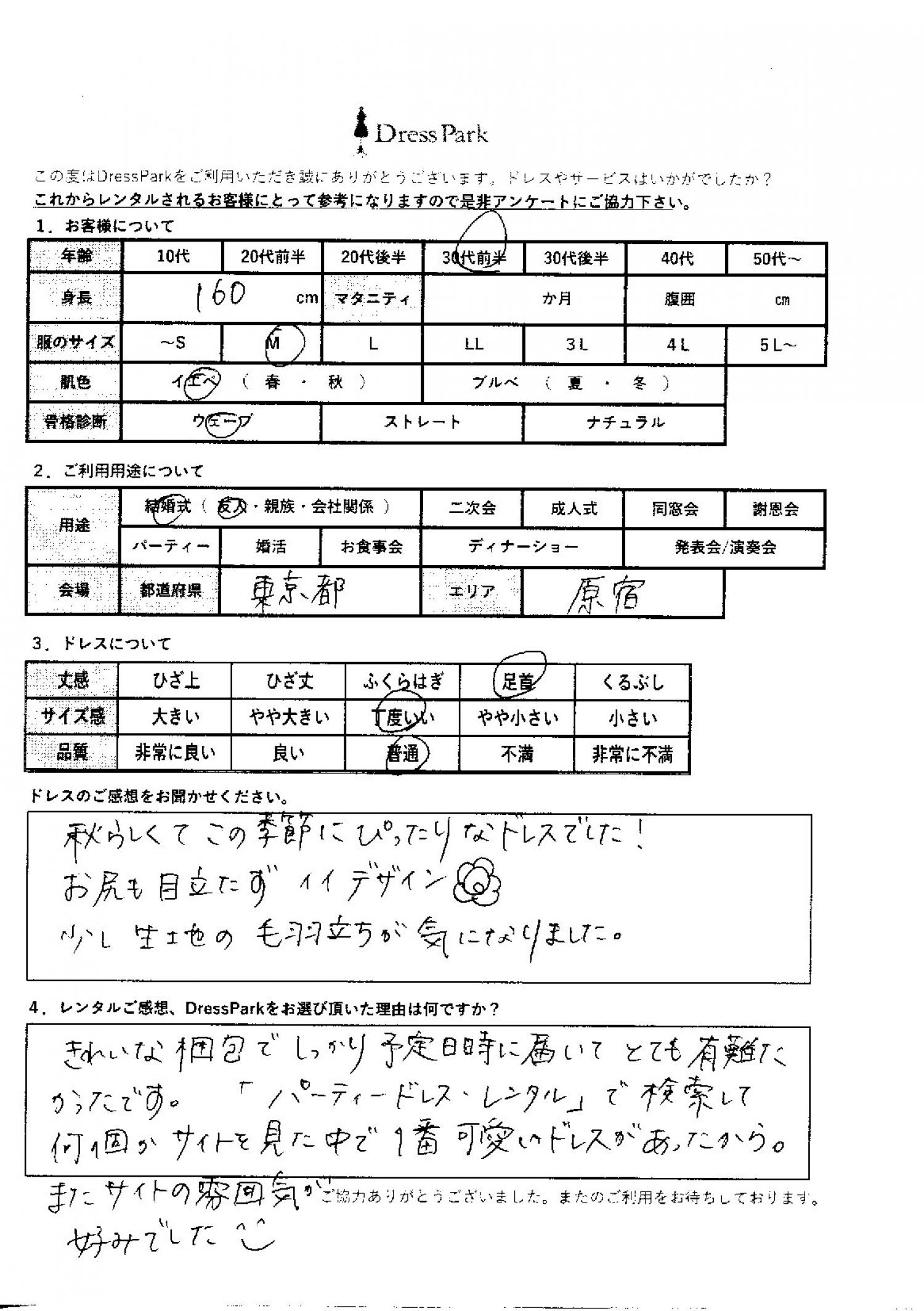 秋らしくて、この季節にぴったりなドレスでした!お尻も目立たず、良いデザイン◎少し生地の毛羽立ちが気になりました。