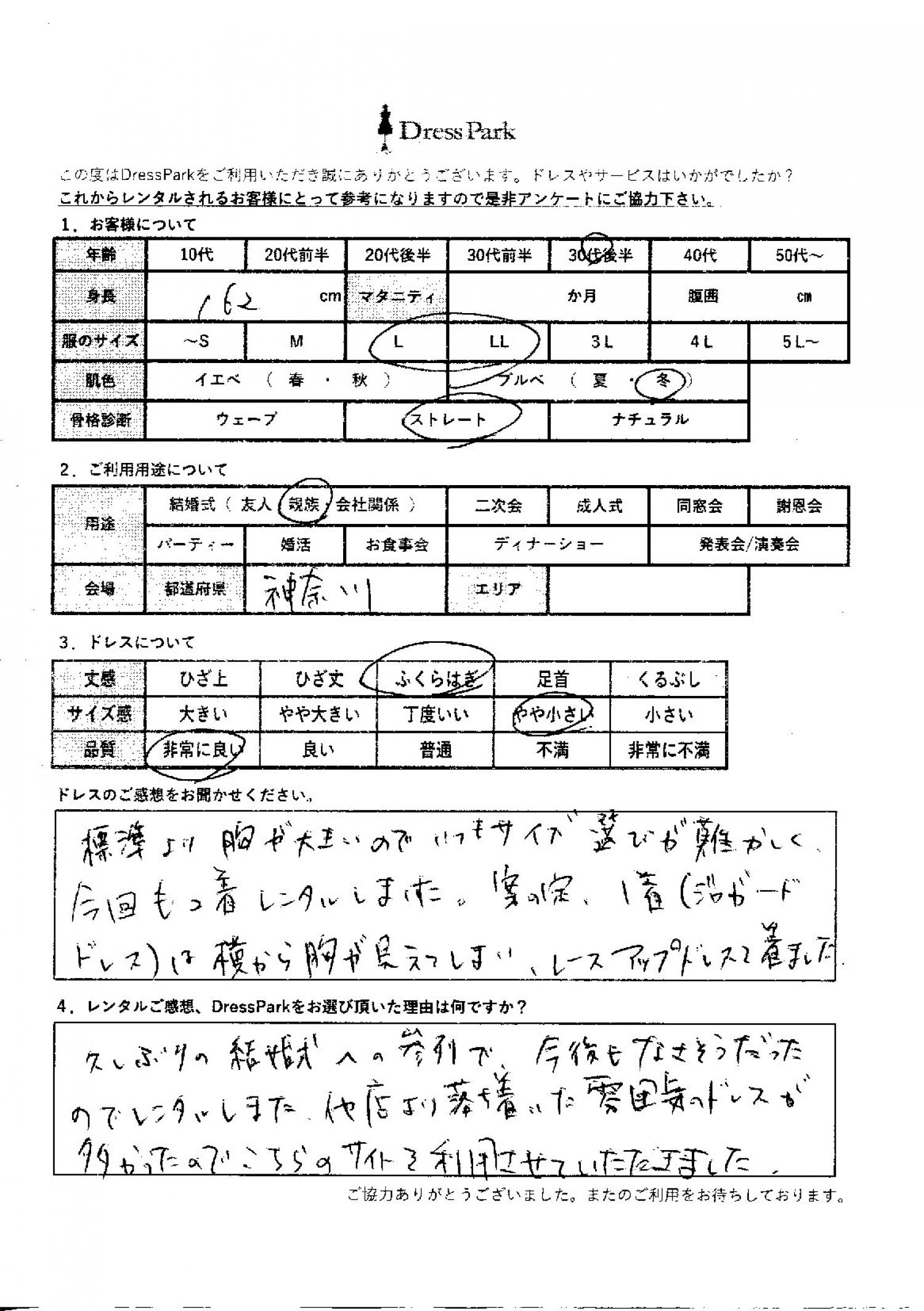 久しぶりの結婚式への参列で今後もなさそうだったので、レンタルしました。他店より落ち着いた雰囲気のドレスが多かったので、こちらのサイトを利用させていただきました。