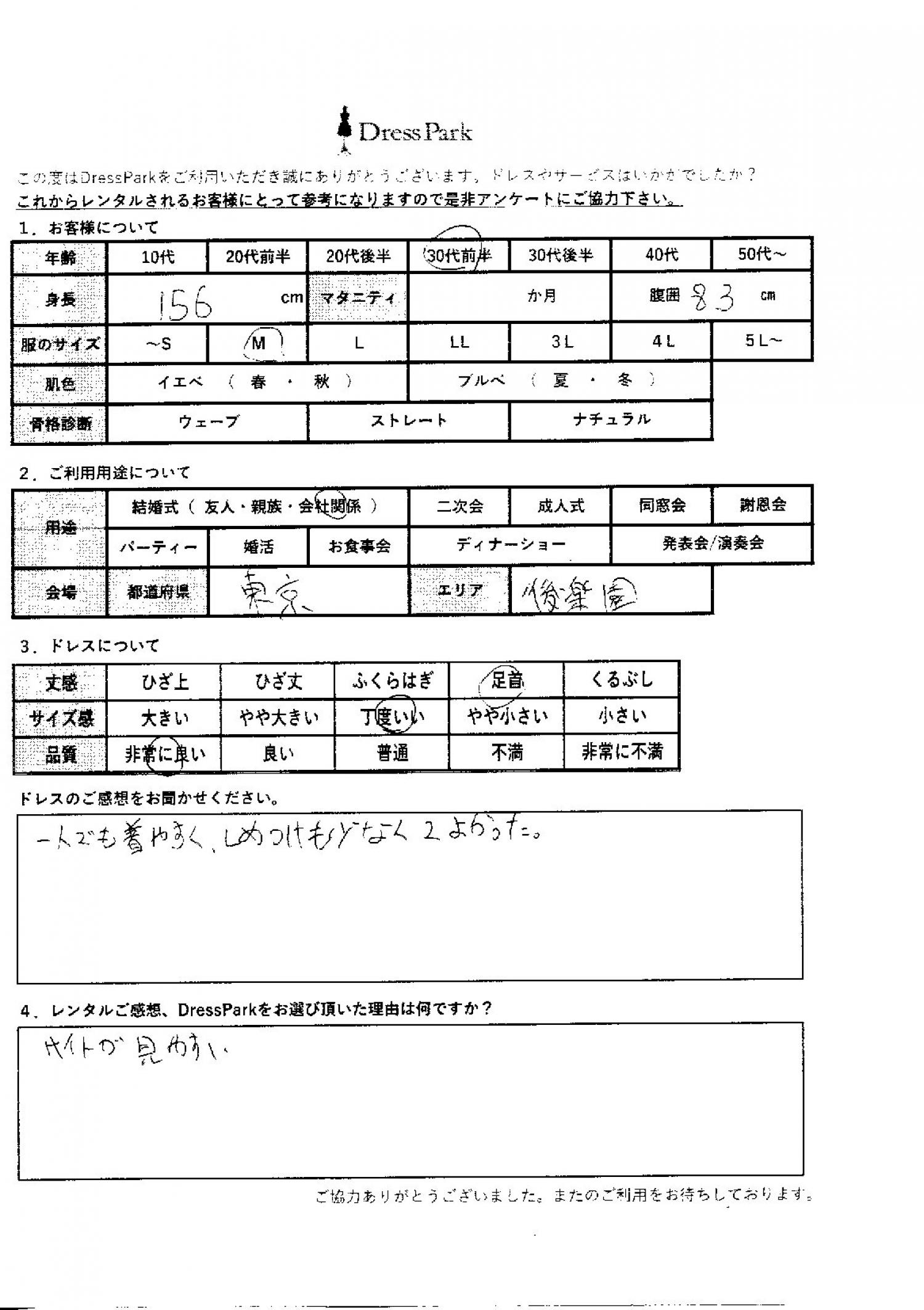 東京都 M.S様156㎝ Mサイズ #30代#M/L#155~159㎝#結婚式(会社関係)#東京都 ◆レンタルしたドレスはこちら ◆レンタルしたサイズは:M ◆レンタルした日付:2025/09/22 ドレスの着用感 ◆点数: (5点) ◆丈感:足首 ◆サイズ感:丁度いい ◆品質:非常に良い ドレスの感想 1人でも着やすく、締め付けも少なく良かった。 レンタルのご感想、DressParkをお選び頂いた理由 サイトが見やすい CUSTOMER REVIEWS お客様の声 気になるカテゴリー別にご利用の感想をチェック! ◆AGE 年代で見る 10代 20代 30代 40代 50代~ ◆SIZE サイズで見る SS/S M/L 大きいサイズLL~ ◆HIGHT 身長で見る 140~149㎝ 150~154㎝ 155~159㎝ 160~164㎝ 165~169㎝ 170㎝以上 ◆マタニティ ~3か月 4~6か月 7~8か月 9~10か月 ◆肌色 イエベ ブルべ ◆骨格診断 ウェーブ ストレート ナチュラル ◆利用シーン 結婚式(友人) 結婚式(親族) 結婚式(会社関係) 二次会 成人式 謝恩会 パーティー その他 CUSTOMER REVIEWS都道府県別お客様の声 都道府県別にのお客様の声をチェック! 北海道 青森県 岩手県 宮城県 秋田県 山形県 福島県 茨城県 栃木県 群馬県 埼玉県 千葉県 東京都 神奈川県 新潟県 富山県 石川県 福井県 山梨県 長野県 岐阜県 静岡県 愛知県 三重県 滋賀県 京都府 大阪府 兵庫県 奈良県 和歌山県 鳥取県 島根県 岡山県 広島県 山口県 徳島県 香川県 愛媛県 高知県 福岡県 佐賀県 長崎県 熊本県 大分県 宮崎県 鹿児島県 沖縄県 CUSTOMER REVIEWSエリア別お客様の声 都道府県別にのお客様の声をチェック! 札幌 仙台 名古屋 軽井沢 金沢 神戸・芦屋 博多 那覇 梅田・新大阪 難波・心斎橋 鎌倉・湘南 横浜・みなとみらい 舞浜・浦安・幕張 大宮・浦和 青山・表参道 六本木・麻布 渋谷・恵比寿 新宿 池袋 銀座・丸の内 お台場・汐留 鹿児島市 郡山市 福島市 東予 甲府・石和 LINEでお問い合わせ このサイトではJavaScriptを使用しています