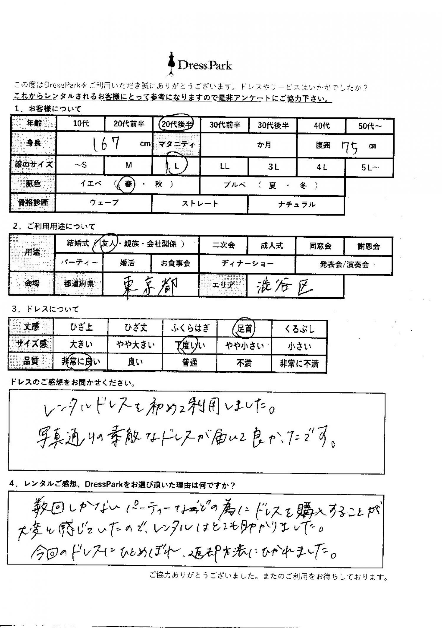 東京都 K.Y様167㎝ Lサイズ渋谷・恵比寿 #20代#M/L#165~169㎝#結婚式(友人)#東京都#渋谷・恵比寿 ◆レンタルしたドレスはこちら ◆レンタルしたサイズは:L ◆レンタルした日付:2025/09/22 ドレスの着用感 ◆点数: (5点) ◆丈感:足首 ◆サイズ感:丁度いい ◆品質:非常に良い ◆肌色:イエベ ドレスの感想 レンタルドレスを初めて利用しました。写真通りの素敵なドレスが届いてよかったです。 レンタルのご感想、DressParkをお選び頂いた理由 数回しか着ないパーティーなどのためにドレスを購入することが大変と感じていたので、レンタルはとても助かりました。 今回のドレスに一目惚れ、返却方法に惹かれました。 CUSTOMER REVIEWS お客様の声 気になるカテゴリー別にご利用の感想をチェック! ◆AGE 年代で見る 10代 20代 30代 40代 50代~ ◆SIZE サイズで見る SS/S M/L 大きいサイズLL~ ◆HIGHT 身長で見る 140~149㎝ 150~154㎝ 155~159㎝ 160~164㎝ 165~169㎝ 170㎝以上 ◆マタニティ ~3か月 4~6か月 7~8か月 9~10か月 ◆肌色 イエベ ブルべ ◆骨格診断 ウェーブ ストレート ナチュラル ◆利用シーン 結婚式(友人) 結婚式(親族) 結婚式(会社関係) 二次会 成人式 謝恩会 パーティー その他 CUSTOMER REVIEWS都道府県別お客様の声 都道府県別にのお客様の声をチェック! 北海道 青森県 岩手県 宮城県 秋田県 山形県 福島県 茨城県 栃木県 群馬県 埼玉県 千葉県 東京都 神奈川県 新潟県 富山県 石川県 福井県 山梨県 長野県 岐阜県 静岡県 愛知県 三重県 滋賀県 京都府 大阪府 兵庫県 奈良県 和歌山県 鳥取県 島根県 岡山県 広島県 山口県 徳島県 香川県 愛媛県 高知県 福岡県 佐賀県 長崎県 熊本県 大分県 宮崎県 鹿児島県 沖縄県 CUSTOMER REVIEWSエリア別お客様の声 都道府県別にのお客様の声をチェック! 札幌 仙台 名古屋 軽井沢 金沢 神戸・芦屋 博多 那覇 梅田・新大阪 難波・心斎橋 鎌倉・湘南 横浜・みなとみらい 舞浜・浦安・幕張 大宮・浦和 青山・表参道 六本木・麻布 渋谷・恵比寿 新宿 池袋 銀座・丸の内 お台場・汐留 鹿児島市 郡山市 福島市 東予 甲府・石和 LINEでお問い合わせ このサイトではJavaScriptを使用しています