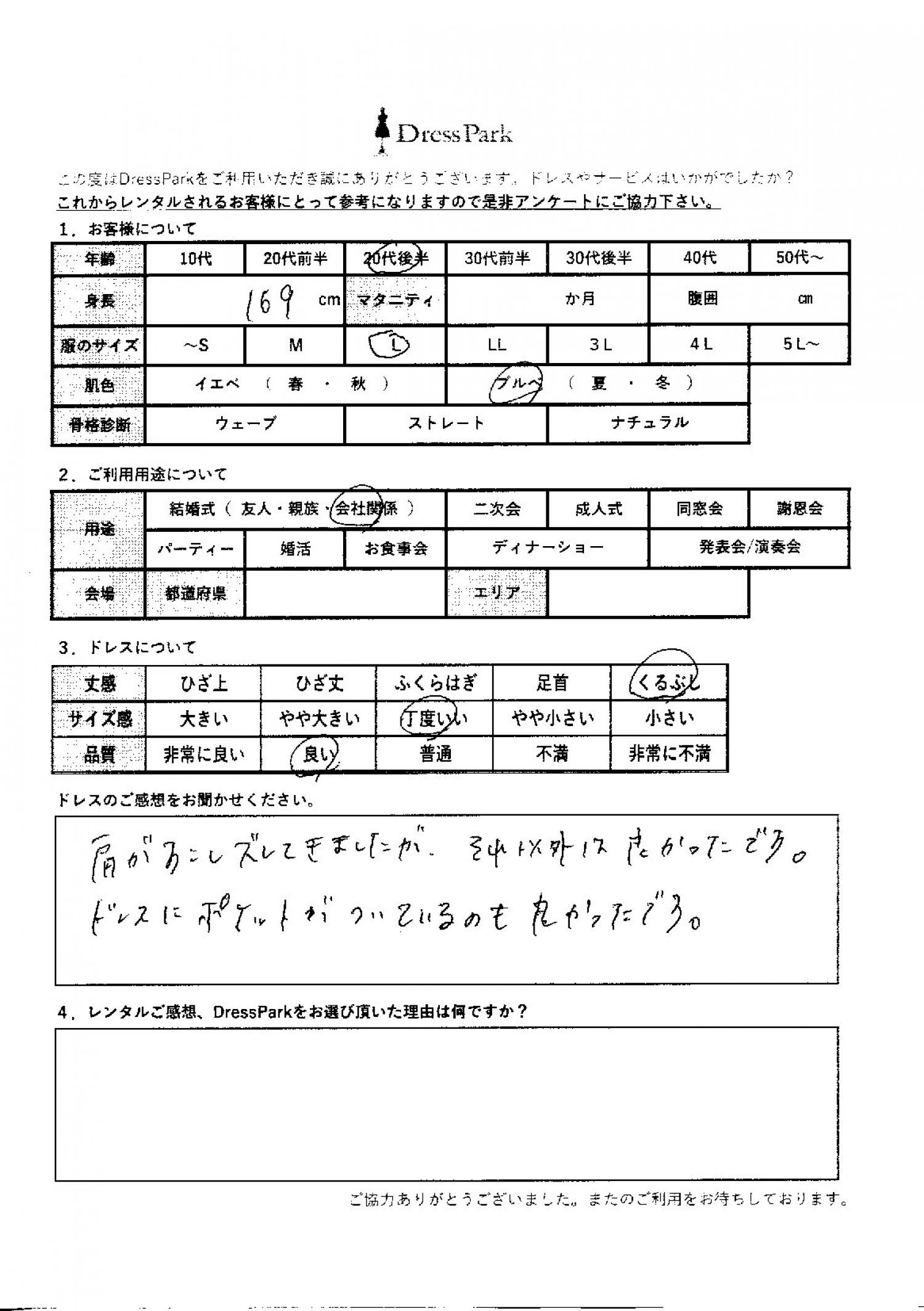 兵庫県 A.F様169㎝ Lサイズ #20代#M/L#165~169㎝#結婚式(会社関係)#兵庫県 ◆レンタルしたドレスはこちら ◆レンタルしたサイズは:L ◆レンタルした日付:2025/09/21 ドレスの着用感 ◆点数: (4点) ◆丈感:くるぶし ◆サイズ感:丁度いい ◆品質:良い ◆肌色:ブルべ ドレスの感想 肩が少しずれてきましたが、それ以外は良かったです。ドレスにポケットが付いているのもよかったです。 CUSTOMER REVIEWS お客様の声 気になるカテゴリー別にご利用の感想をチェック! ◆AGE 年代で見る 10代 20代 30代 40代 50代~ ◆SIZE サイズで見る SS/S M/L 大きいサイズLL~ ◆HIGHT 身長で見る 140~149㎝ 150~154㎝ 155~159㎝ 160~164㎝ 165~169㎝ 170㎝以上 ◆マタニティ ~3か月 4~6か月 7~8か月 9~10か月 ◆肌色 イエベ ブルべ ◆骨格診断 ウェーブ ストレート ナチュラル ◆利用シーン 結婚式(友人) 結婚式(親族) 結婚式(会社関係) 二次会 成人式 謝恩会 パーティー その他 CUSTOMER REVIEWS都道府県別お客様の声 都道府県別にのお客様の声をチェック! 北海道 青森県 岩手県 宮城県 秋田県 山形県 福島県 茨城県 栃木県 群馬県 埼玉県 千葉県 東京都 神奈川県 新潟県 富山県 石川県 福井県 山梨県 長野県 岐阜県 静岡県 愛知県 三重県 滋賀県 京都府 大阪府 兵庫県 奈良県 和歌山県 鳥取県 島根県 岡山県 広島県 山口県 徳島県 香川県 愛媛県 高知県 福岡県 佐賀県 長崎県 熊本県 大分県 宮崎県 鹿児島県 沖縄県 CUSTOMER REVIEWSエリア別お客様の声 都道府県別にのお客様の声をチェック! 札幌 仙台 名古屋 軽井沢 金沢 神戸・芦屋 博多 那覇 梅田・新大阪 難波・心斎橋 鎌倉・湘南 横浜・みなとみらい 舞浜・浦安・幕張 大宮・浦和 青山・表参道 六本木・麻布 渋谷・恵比寿 新宿 池袋 銀座・丸の内 お台場・汐留 鹿児島市 郡山市 福島市 東予 甲府・石和 LINEでお問い合わせ このサイトではJavaScriptを使用しています