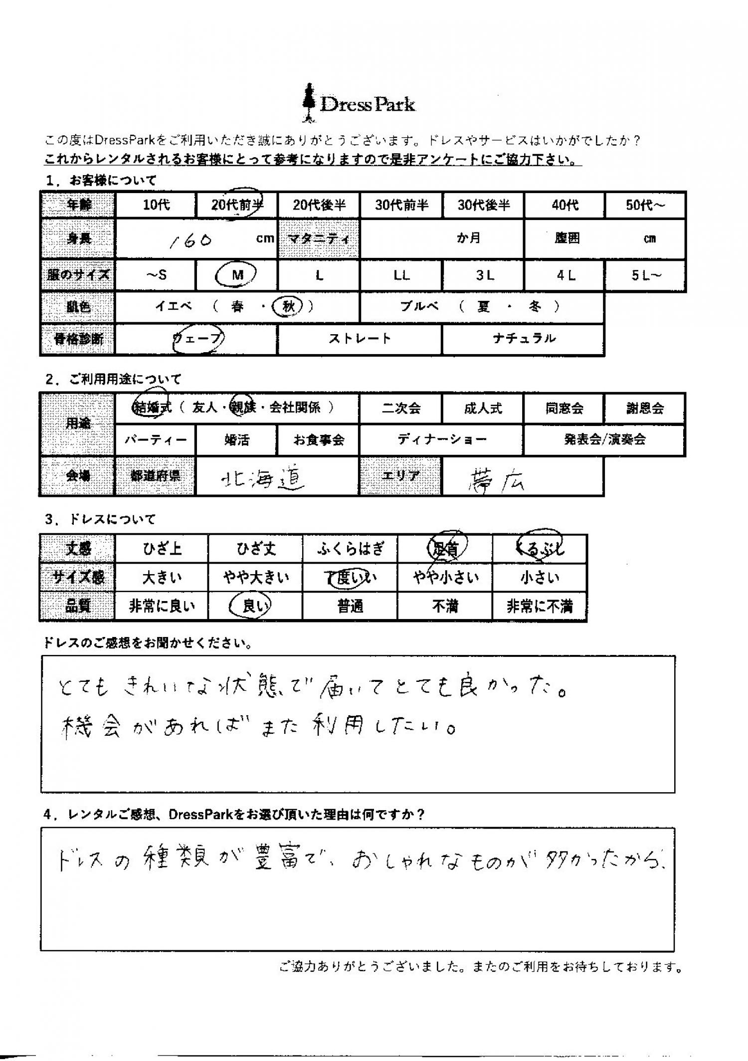 北海道 F.Y様160㎝ Mサイズ #20代#M/L#160~164㎝#結婚式(親族)#北海道 ◆レンタルしたドレスはこちら ◆レンタルしたサイズは:M ◆レンタルした日付:2025/09/20 ドレスの着用感 ◆点数: (5点) ◆丈感:くるぶし ◆サイズ感:丁度いい ◆品質:良い ◆肌色:イエベ ◆骨格診断:ウェーブ ドレスの感想 とてもきれいな状態で届いてとても良かった。機会があればまた利用したい。 レンタルのご感想、DressParkをお選び頂いた理由 ドレスの種類が豊富で、おしゃれなものが多かったから。 CUSTOMER REVIEWS お客様の声 気になるカテゴリー別にご利用の感想をチェック! ◆AGE 年代で見る 10代 20代 30代 40代 50代~ ◆SIZE サイズで見る SS/S M/L 大きいサイズLL~ ◆HIGHT 身長で見る 140~149㎝ 150~154㎝ 155~159㎝ 160~164㎝ 165~169㎝ 170㎝以上 ◆マタニティ ~3か月 4~6か月 7~8か月 9~10か月 ◆肌色 イエベ ブルべ ◆骨格診断 ウェーブ ストレート ナチュラル ◆利用シーン 結婚式(友人) 結婚式(親族) 結婚式(会社関係) 二次会 成人式 謝恩会 パーティー その他 CUSTOMER REVIEWS都道府県別お客様の声 都道府県別にのお客様の声をチェック! 北海道 青森県 岩手県 宮城県 秋田県 山形県 福島県 茨城県 栃木県 群馬県 埼玉県 千葉県 東京都 神奈川県 新潟県 富山県 石川県 福井県 山梨県 長野県 岐阜県 静岡県 愛知県 三重県 滋賀県 京都府 大阪府 兵庫県 奈良県 和歌山県 鳥取県 島根県 岡山県 広島県 山口県 徳島県 香川県 愛媛県 高知県 福岡県 佐賀県 長崎県 熊本県 大分県 宮崎県 鹿児島県 沖縄県 CUSTOMER REVIEWSエリア別お客様の声 都道府県別にのお客様の声をチェック! 札幌 仙台 名古屋 軽井沢 金沢 神戸・芦屋 博多 那覇 梅田・新大阪 難波・心斎橋 鎌倉・湘南 横浜・みなとみらい 舞浜・浦安・幕張 大宮・浦和 青山・表参道 六本木・麻布 渋谷・恵比寿 新宿 池袋 銀座・丸の内 お台場・汐留 鹿児島市 郡山市 福島市 東予 甲府・石和 LINEでお問い合わせ このサイトではJavaScriptを使用しています