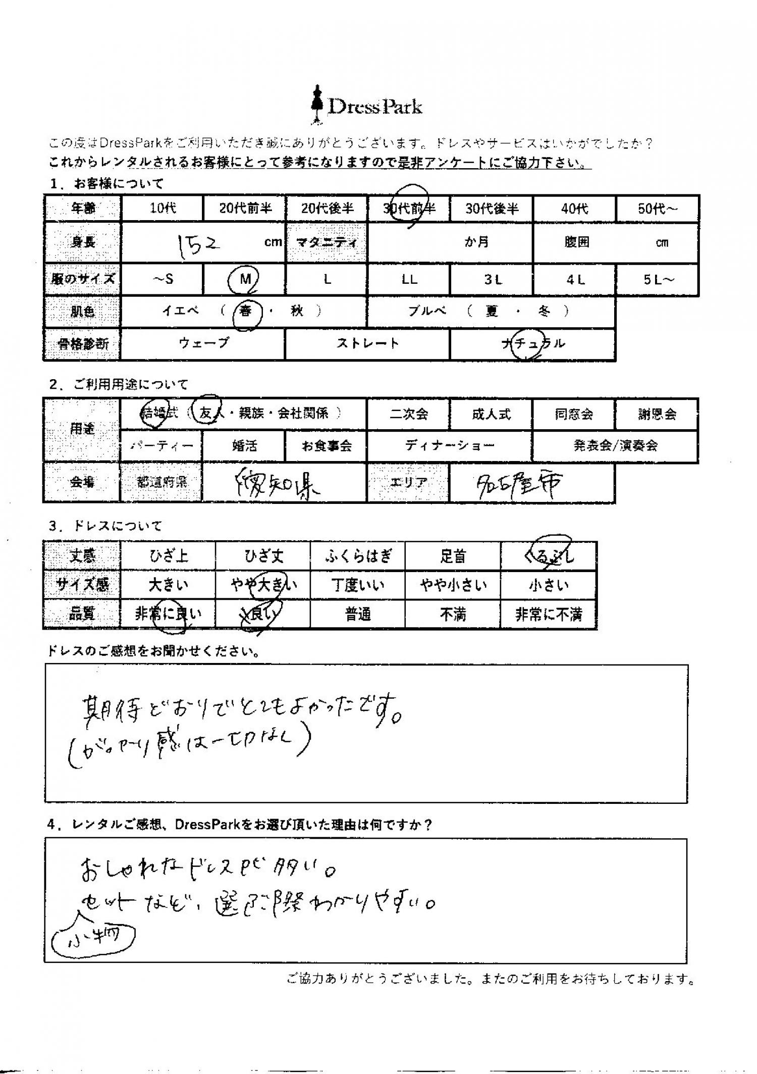 愛知県 M.T様152㎝ Mサイズ名古屋 #30代#M/L#150~154㎝#結婚式(友人)#愛知県#名古屋 ◆レンタルしたドレスはこちら ◆レンタルしたサイズは:M ◆レンタルした日付:2025/09/23 ドレスの着用感 ◆点数: (5点) ◆丈感:くるぶし ◆サイズ感:やや大きい ◆品質:非常に良い ◆肌色:イエベ ◆骨格診断:ナチュラル ドレスの感想 期待通りでとても良かったです。(がっかり感は一切なく) レンタルのご感想、DressParkをお選び頂いた理由 おしゃれなドレスが多い。小物セットなど選ぶ際わかりやすい。 CUSTOMER REVIEWS お客様の声 気になるカテゴリー別にご利用の感想をチェック! ◆AGE 年代で見る 10代 20代 30代 40代 50代~ ◆SIZE サイズで見る SS/S M/L 大きいサイズLL~ ◆HIGHT 身長で見る 140~149㎝ 150~154㎝ 155~159㎝ 160~164㎝ 165~169㎝ 170㎝以上 ◆マタニティ ~3か月 4~6か月 7~8か月 9~10か月 ◆肌色 イエベ ブルべ ◆骨格診断 ウェーブ ストレート ナチュラル ◆利用シーン 結婚式(友人) 結婚式(親族) 結婚式(会社関係) 二次会 成人式 謝恩会 パーティー その他 CUSTOMER REVIEWS都道府県別お客様の声 都道府県別にのお客様の声をチェック! 北海道 青森県 岩手県 宮城県 秋田県 山形県 福島県 茨城県 栃木県 群馬県 埼玉県 千葉県 東京都 神奈川県 新潟県 富山県 石川県 福井県 山梨県 長野県 岐阜県 静岡県 愛知県 三重県 滋賀県 京都府 大阪府 兵庫県 奈良県 和歌山県 鳥取県 島根県 岡山県 広島県 山口県 徳島県 香川県 愛媛県 高知県 福岡県 佐賀県 長崎県 熊本県 大分県 宮崎県 鹿児島県 沖縄県 CUSTOMER REVIEWSエリア別お客様の声 都道府県別にのお客様の声をチェック! 札幌 仙台 名古屋 軽井沢 金沢 神戸・芦屋 博多 那覇 梅田・新大阪 難波・心斎橋 鎌倉・湘南 横浜・みなとみらい 舞浜・浦安・幕張 大宮・浦和 青山・表参道 六本木・麻布 渋谷・恵比寿 新宿 池袋 銀座・丸の内 お台場・汐留 鹿児島市 郡山市 福島市 東予 甲府・石和 LINEでお問い合わせ このサイトではJavaScriptを使用しています
