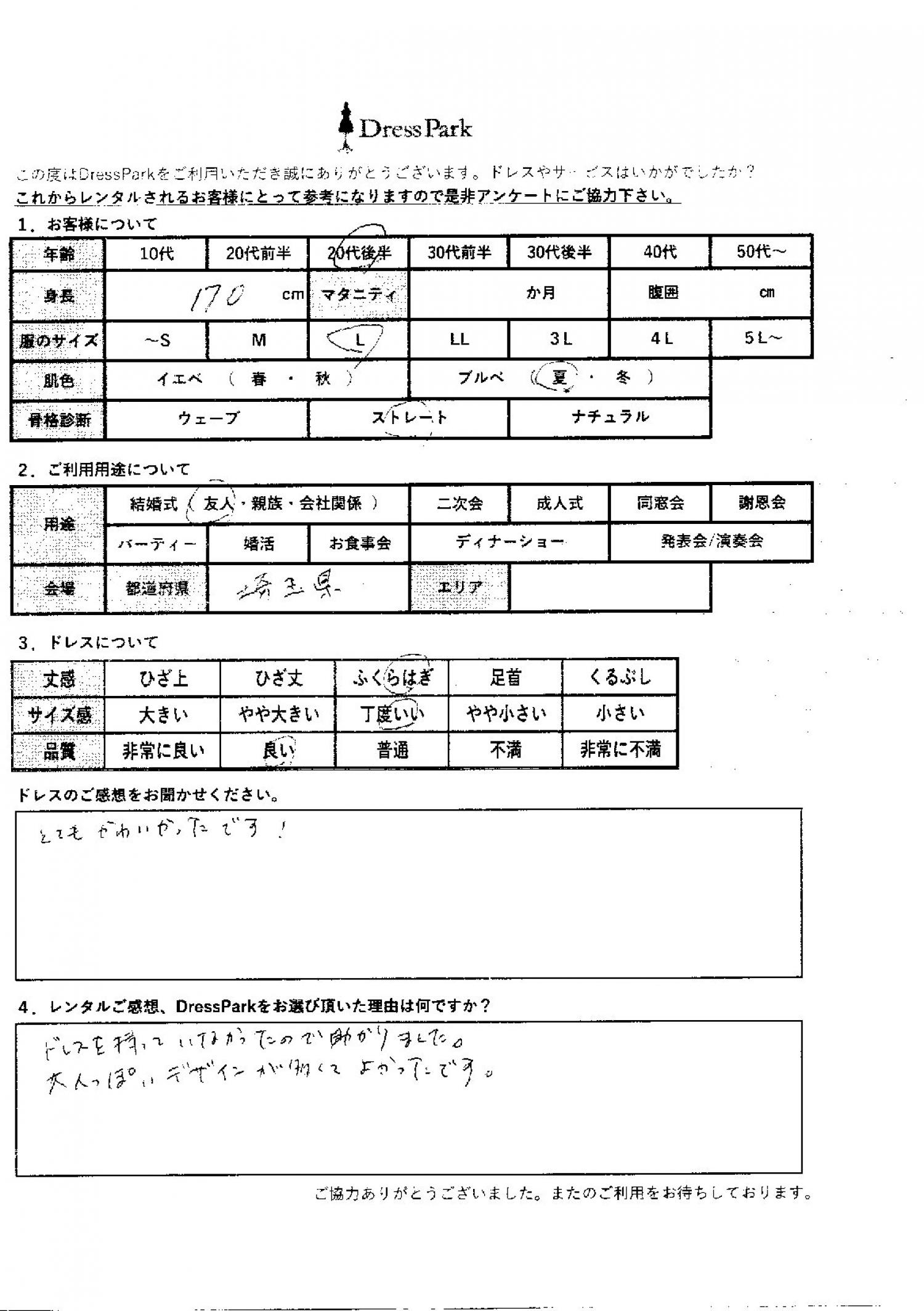 埼玉県 H.M様170㎝ Lサイズ #20代#M/L#170㎝以上#結婚式(友人)#埼玉県 ◆レンタルしたドレスはこちら ◆レンタルしたサイズは:L ◆レンタルした日付:2025/09/23 ドレスの着用感 ◆点数: (4点) ◆丈感:ふくらはぎ ◆サイズ感:丁度いい ◆品質:良い ◆肌色:ブルべ ◆骨格診断:ストレート ドレスの感想 とても可愛かったです! レンタルのご感想、DressParkをお選び頂いた理由 ドレスを持っていなかったので、助かりました。大人っぽいデザインが多くてよかったです。 CUSTOMER REVIEWS お客様の声 気になるカテゴリー別にご利用の感想をチェック! ◆AGE 年代で見る 10代 20代 30代 40代 50代~ ◆SIZE サイズで見る SS/S M/L 大きいサイズLL~ ◆HIGHT 身長で見る 140~149㎝ 150~154㎝ 155~159㎝ 160~164㎝ 165~169㎝ 170㎝以上 ◆マタニティ ~3か月 4~6か月 7~8か月 9~10か月 ◆肌色 イエベ ブルべ ◆骨格診断 ウェーブ ストレート ナチュラル ◆利用シーン 結婚式(友人) 結婚式(親族) 結婚式(会社関係) 二次会 成人式 謝恩会 パーティー その他 CUSTOMER REVIEWS都道府県別お客様の声 都道府県別にのお客様の声をチェック! 北海道 青森県 岩手県 宮城県 秋田県 山形県 福島県 茨城県 栃木県 群馬県 埼玉県 千葉県 東京都 神奈川県 新潟県 富山県 石川県 福井県 山梨県 長野県 岐阜県 静岡県 愛知県 三重県 滋賀県 京都府 大阪府 兵庫県 奈良県 和歌山県 鳥取県 島根県 岡山県 広島県 山口県 徳島県 香川県 愛媛県 高知県 福岡県 佐賀県 長崎県 熊本県 大分県 宮崎県 鹿児島県 沖縄県 CUSTOMER REVIEWSエリア別お客様の声 都道府県別にのお客様の声をチェック! 札幌 仙台 名古屋 軽井沢 金沢 神戸・芦屋 博多 那覇 梅田・新大阪 難波・心斎橋 鎌倉・湘南 横浜・みなとみらい 舞浜・浦安・幕張 大宮・浦和 青山・表参道 六本木・麻布 渋谷・恵比寿 新宿 池袋 銀座・丸の内 お台場・汐留 鹿児島市 郡山市 福島市 東予 甲府・石和 LINEでお問い合わせ このサイトではJavaScriptを使用しています