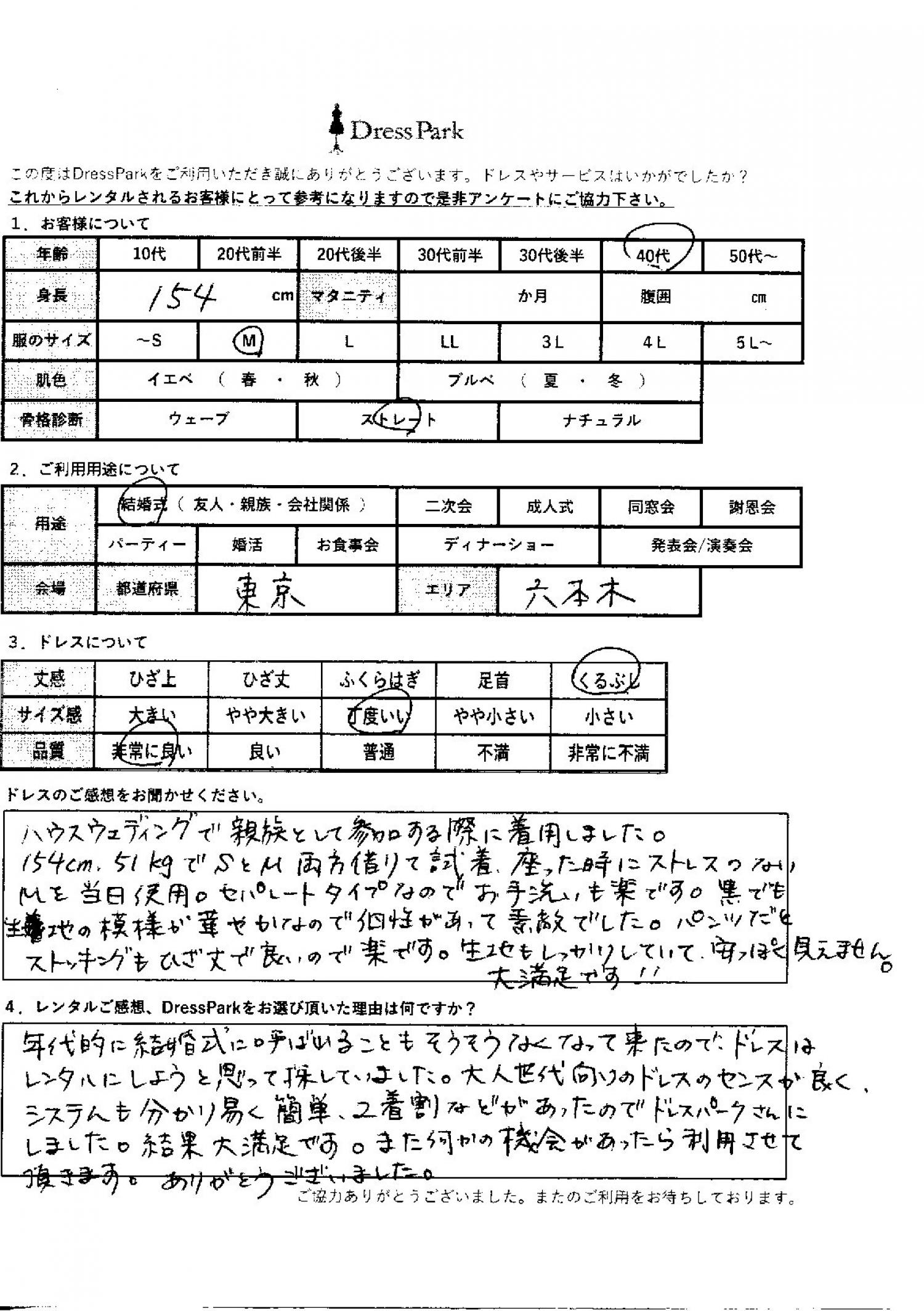 東京都 S.M様154㎝ Mサイズ六本木・麻布 #40代#M/L#150~154㎝#結婚式(親族)#東京都#六本木・麻布 ◆レンタルしたドレスはこちら ◆レンタルしたサイズは:M ◆レンタルした日付:2025/09/26 ドレスの着用感 ◆点数: (5点) ◆丈感:くるぶし ◆サイズ感:丁度いい ◆品質:非常に良い ◆骨格診断:ストレート ドレスの感想 ハウスウェディングで親族として参加する際に着用しました。154cm51kgで、SサイズとMサイズ両方借りて試着。座った時にストレスのないMサイズを当日使用。セパレートタイプなのでお手洗いも楽です。黒でも生地の模様が華やかなので、個性があって素敵だ。した。パンツだとストッキングも膝丈で良いので楽です。生地もしっかりしていて安っぽく見えません。大満足です!! レンタルのご感想、DressParkをお選び頂いた理由 年代的に結婚式に呼ばれることもそうそうなくなってきたので、ドレスはレンタルしようと思って探していました。大人世代向けのドレスのセンスが良く、システムもわかりやすく簡単。2着割等があったので、ドレスパークさんにしました。結果大満足です。また何か機会があったら利用させていただきます。ありがとうございました。 CUSTOMER REVIEWS お客様の声 気になるカテゴリー別にご利用の感想をチェック! ◆AGE 年代で見る 10代 20代 30代 40代 50代~ ◆SIZE サイズで見る SS/S M/L 大きいサイズLL~ ◆HIGHT 身長で見る 140~149㎝ 150~154㎝ 155~159㎝ 160~164㎝ 165~169㎝ 170㎝以上 ◆マタニティ ~3か月 4~6か月 7~8か月 9~10か月 ◆肌色 イエベ ブルべ ◆骨格診断 ウェーブ ストレート ナチュラル ◆利用シーン 結婚式(友人) 結婚式(親族) 結婚式(会社関係) 二次会 成人式 謝恩会 パーティー その他 CUSTOMER REVIEWS都道府県別お客様の声 都道府県別にのお客様の声をチェック! 北海道 青森県 岩手県 宮城県 秋田県 山形県 福島県 茨城県 栃木県 群馬県 埼玉県 千葉県 東京都 神奈川県 新潟県 富山県 石川県 福井県 山梨県 長野県 岐阜県 静岡県 愛知県 三重県 滋賀県 京都府 大阪府 兵庫県 奈良県 和歌山県 鳥取県 島根県 岡山県 広島県 山口県 徳島県 香川県 愛媛県 高知県 福岡県 佐賀県 長崎県 熊本県 大分県 宮崎県 鹿児島県 沖縄県 CUSTOMER REVIEWSエリア別お客様の声 都道府県別にのお客様の声をチェック! 札幌 仙台 名古屋 軽井沢 金沢 神戸・芦屋 博多 那覇 梅田・新大阪 難波・心斎橋 鎌倉・湘南 横浜・みなとみらい 舞浜・浦安・幕張 大宮・浦和 青山・表参道 六本木・麻布 渋谷・恵比寿 新宿 池袋 銀座・丸の内 お台場・汐留 鹿児島市 郡山市 福島市 東予 甲府・石和 LINEでお問い合わせ このサイトではJavaScriptを使用しています