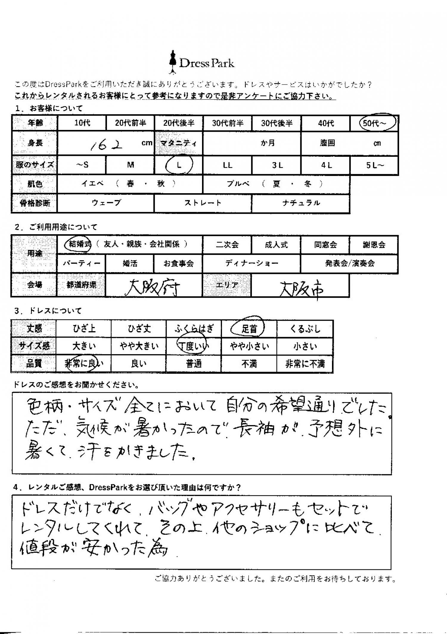 大阪府 K.M様162㎝ Lサイズ #50代~#M/L#160~164㎝#結婚式(親族)#大阪府 ◆レンタルしたドレスはこちら ◆レンタルしたサイズは:L ◆レンタルした日付:2025/09/27 ドレスの着用感 ◆点数: (5点) ◆丈感:足首 ◆サイズ感:丁度いい ◆品質:非常に良い ドレスの感想 色柄、サイズ全てにおいて、自分の希望通りでした。ただ、気候が暑かったので、長袖が予想外に暑くて汗をかきました。 レンタルのご感想、DressParkをお選び頂いた理由 ドレスだけでなく、バッグやアクセサリーもセットでレンタルしてくれて、その上他のショップに比べて値段が安かったため。 CUSTOMER REVIEWS お客様の声 気になるカテゴリー別にご利用の感想をチェック! ◆AGE 年代で見る 10代 20代 30代 40代 50代~ ◆SIZE サイズで見る SS/S M/L 大きいサイズLL~ ◆HIGHT 身長で見る 140~149㎝ 150~154㎝ 155~159㎝ 160~164㎝ 165~169㎝ 170㎝以上 ◆マタニティ ~3か月 4~6か月 7~8か月 9~10か月 ◆肌色 イエベ ブルべ ◆骨格診断 ウェーブ ストレート ナチュラル ◆利用シーン 結婚式(友人) 結婚式(親族) 結婚式(会社関係) 二次会 成人式 謝恩会 パーティー その他 CUSTOMER REVIEWS都道府県別お客様の声 都道府県別にのお客様の声をチェック! 北海道 青森県 岩手県 宮城県 秋田県 山形県 福島県 茨城県 栃木県 群馬県 埼玉県 千葉県 東京都 神奈川県 新潟県 富山県 石川県 福井県 山梨県 長野県 岐阜県 静岡県 愛知県 三重県 滋賀県 京都府 大阪府 兵庫県 奈良県 和歌山県 鳥取県 島根県 岡山県 広島県 山口県 徳島県 香川県 愛媛県 高知県 福岡県 佐賀県 長崎県 熊本県 大分県 宮崎県 鹿児島県 沖縄県 CUSTOMER REVIEWSエリア別お客様の声 都道府県別にのお客様の声をチェック! 札幌 仙台 名古屋 軽井沢 金沢 神戸・芦屋 博多 那覇 梅田・新大阪 難波・心斎橋 鎌倉・湘南 横浜・みなとみらい 舞浜・浦安・幕張 大宮・浦和 青山・表参道 六本木・麻布 渋谷・恵比寿 新宿 池袋 銀座・丸の内 お台場・汐留 鹿児島市 郡山市 福島市 東予 甲府・石和 LINEでお問い合わせ このサイトではJavaScriptを使用しています