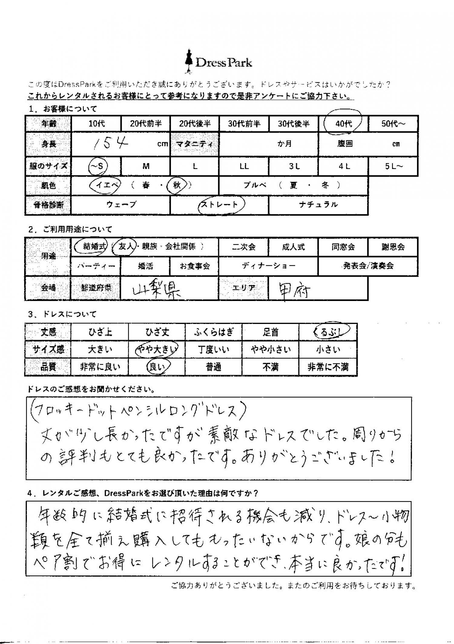 山梨県 A.K様154㎝ ~Sサイズ甲府・石和 #40代#M/L#150~154㎝#結婚式(友人)#山梨県#甲府・石和 ◆レンタルしたドレスはこちら ◆レンタルしたサイズは:M ◆レンタルした日付:2025/09/27 ドレスの着用感 ◆点数: (5点) ◆丈感:くるぶし ◆サイズ感:やや大きい ◆品質:良い ◆肌色:イエベ ◆骨格診断:ストレート ドレスの感想 丈が少し長かったですが、素敵なドレスでした。周りからの評判もとても良かったです。ありがとうございました! レンタルのご感想、DressParkをお選び頂いた理由 年齢的に結婚式に招待される機会も減り、ドレスから小物類を全て揃え、購入してももったいないからです。娘の分もペア割で、お得にレンタルすることができ、本当に良かったです! CUSTOMER REVIEWS お客様の声 気になるカテゴリー別にご利用の感想をチェック! ◆AGE 年代で見る 10代 20代 30代 40代 50代~ ◆SIZE サイズで見る SS/S M/L 大きいサイズLL~ ◆HIGHT 身長で見る 140~149㎝ 150~154㎝ 155~159㎝ 160~164㎝ 165~169㎝ 170㎝以上 ◆マタニティ ~3か月 4~6か月 7~8か月 9~10か月 ◆肌色 イエベ ブルべ ◆骨格診断 ウェーブ ストレート ナチュラル ◆利用シーン 結婚式(友人) 結婚式(親族) 結婚式(会社関係) 二次会 成人式 謝恩会 パーティー その他 CUSTOMER REVIEWS都道府県別お客様の声 都道府県別にのお客様の声をチェック! 北海道 青森県 岩手県 宮城県 秋田県 山形県 福島県 茨城県 栃木県 群馬県 埼玉県 千葉県 東京都 神奈川県 新潟県 富山県 石川県 福井県 山梨県 長野県 岐阜県 静岡県 愛知県 三重県 滋賀県 京都府 大阪府 兵庫県 奈良県 和歌山県 鳥取県 島根県 岡山県 広島県 山口県 徳島県 香川県 愛媛県 高知県 福岡県 佐賀県 長崎県 熊本県 大分県 宮崎県 鹿児島県 沖縄県 CUSTOMER REVIEWSエリア別お客様の声 都道府県別にのお客様の声をチェック! 札幌 仙台 名古屋 軽井沢 金沢 神戸・芦屋 博多 那覇 梅田・新大阪 難波・心斎橋 鎌倉・湘南 横浜・みなとみらい 舞浜・浦安・幕張 大宮・浦和 青山・表参道 六本木・麻布 渋谷・恵比寿 新宿 池袋 銀座・丸の内 お台場・汐留 鹿児島市 郡山市 福島市 東予 甲府・石和 LINEでお問い合わせ このサイトではJavaScriptを使用しています