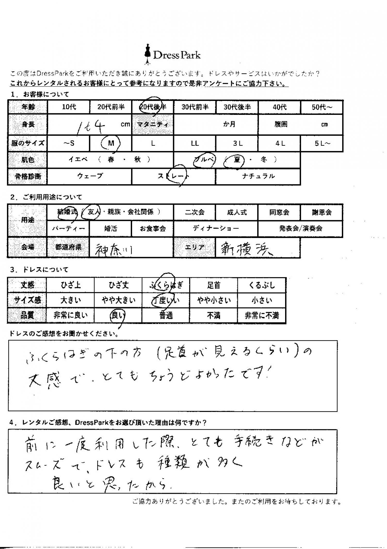 神奈川県 Y.N様164㎝ Mサイズ横浜・みなとみらい #20代#M/L#160~164㎝#結婚式(友人)#神奈川県#横浜・みなとみらい ◆レンタルしたドレスはこちら ◆レンタルしたサイズは:M ◆レンタルした日付:2025/09/27 ドレスの着用感 ◆点数: (4点) ◆丈感:ふくらはぎ ◆サイズ感:丁度いい ◆品質:良い ◆肌色:ブルべ ◆骨格診断:ストレート ドレスの感想 ふくらはぎの下の方(足首が見える位)の丈で、とてもちょうど良かったです! レンタルのご感想、DressParkをお選び頂いた理由 前に1度利用した際、とても手続き等がスムーズで、ドレスも種類が多く良いと思ったから。 CUSTOMER REVIEWS お客様の声 気になるカテゴリー別にご利用の感想をチェック! ◆AGE 年代で見る 10代 20代 30代 40代 50代~ ◆SIZE サイズで見る SS/S M/L 大きいサイズLL~ ◆HIGHT 身長で見る 140~149㎝ 150~154㎝ 155~159㎝ 160~164㎝ 165~169㎝ 170㎝以上 ◆マタニティ ~3か月 4~6か月 7~8か月 9~10か月 ◆肌色 イエベ ブルべ ◆骨格診断 ウェーブ ストレート ナチュラル ◆利用シーン 結婚式(友人) 結婚式(親族) 結婚式(会社関係) 二次会 成人式 謝恩会 パーティー その他 CUSTOMER REVIEWS都道府県別お客様の声 都道府県別にのお客様の声をチェック! 北海道 青森県 岩手県 宮城県 秋田県 山形県 福島県 茨城県 栃木県 群馬県 埼玉県 千葉県 東京都 神奈川県 新潟県 富山県 石川県 福井県 山梨県 長野県 岐阜県 静岡県 愛知県 三重県 滋賀県 京都府 大阪府 兵庫県 奈良県 和歌山県 鳥取県 島根県 岡山県 広島県 山口県 徳島県 香川県 愛媛県 高知県 福岡県 佐賀県 長崎県 熊本県 大分県 宮崎県 鹿児島県 沖縄県 CUSTOMER REVIEWSエリア別お客様の声 都道府県別にのお客様の声をチェック! 札幌 仙台 名古屋 軽井沢 金沢 神戸・芦屋 博多 那覇 梅田・新大阪 難波・心斎橋 鎌倉・湘南 横浜・みなとみらい 舞浜・浦安・幕張 大宮・浦和 青山・表参道 六本木・麻布 渋谷・恵比寿 新宿 池袋 銀座・丸の内 お台場・汐留 鹿児島市 郡山市 福島市 東予 甲府・石和 LINEでお問い合わせ このサイトではJavaScriptを使用しています