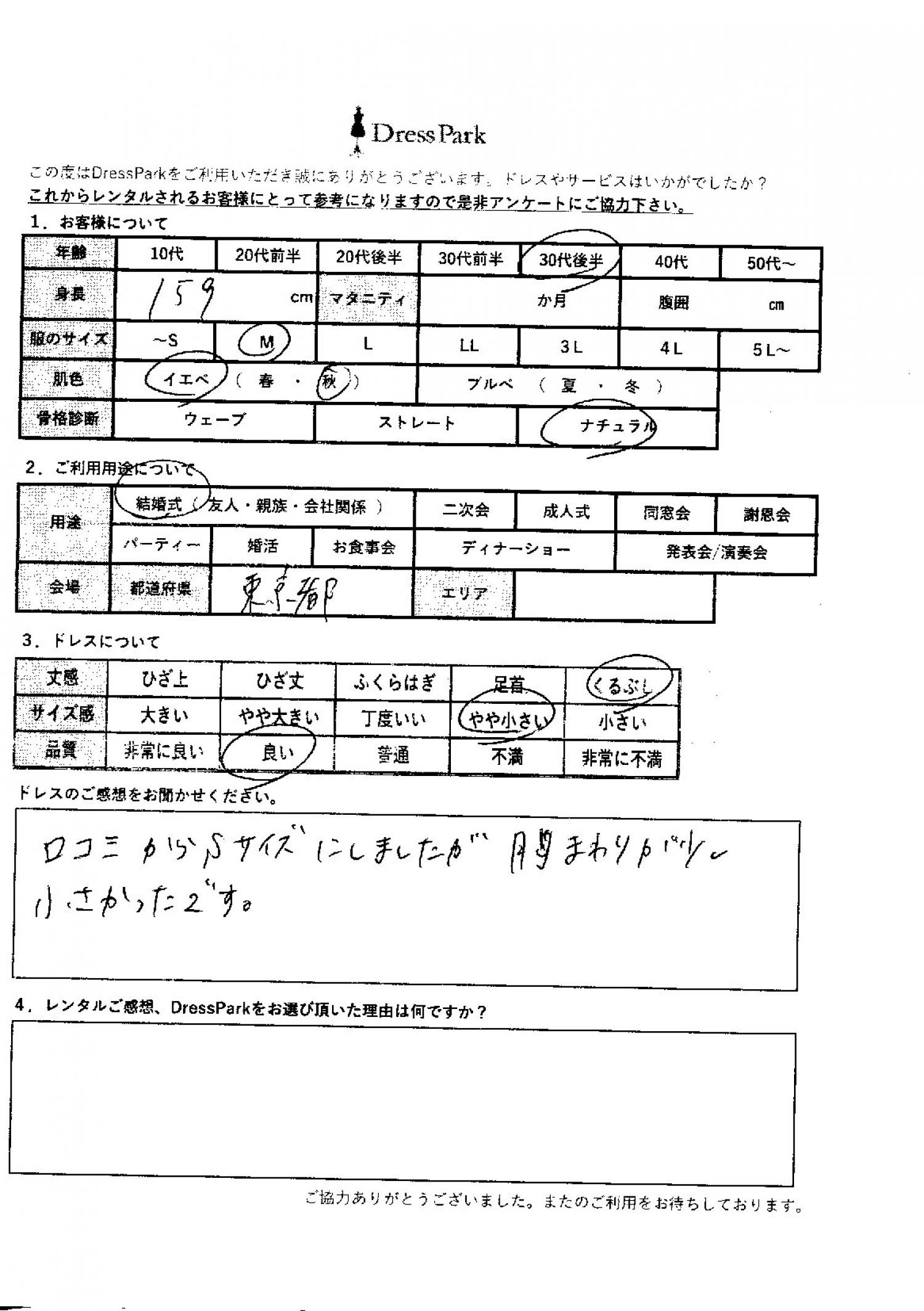 東京都 T.K様159㎝ Mサイズ #30代#M/L#155~159㎝#結婚式(友人)#東京都 ◆レンタルしたドレスはこちら ◆レンタルしたサイズは:S ◆レンタルした日付:2025/09/27 ドレスの着用感 ◆点数: (4点) ◆丈感:くるぶし ◆サイズ感:やや小さい ◆品質:良い ◆肌色:イエベ ◆骨格診断:ナチュラル ドレスの感想 口コミからSサイズにしましたが、胸回りが少し小さかったです。 CUSTOMER REVIEWS お客様の声 気になるカテゴリー別にご利用の感想をチェック! ◆AGE 年代で見る 10代 20代 30代 40代 50代~ ◆SIZE サイズで見る SS/S M/L 大きいサイズLL~ ◆HIGHT 身長で見る 140~149㎝ 150~154㎝ 155~159㎝ 160~164㎝ 165~169㎝ 170㎝以上 ◆マタニティ ~3か月 4~6か月 7~8か月 9~10か月 ◆肌色 イエベ ブルべ ◆骨格診断 ウェーブ ストレート ナチュラル ◆利用シーン 結婚式(友人) 結婚式(親族) 結婚式(会社関係) 二次会 成人式 謝恩会 パーティー その他 CUSTOMER REVIEWS都道府県別お客様の声 都道府県別にのお客様の声をチェック! 北海道 青森県 岩手県 宮城県 秋田県 山形県 福島県 茨城県 栃木県 群馬県 埼玉県 千葉県 東京都 神奈川県 新潟県 富山県 石川県 福井県 山梨県 長野県 岐阜県 静岡県 愛知県 三重県 滋賀県 京都府 大阪府 兵庫県 奈良県 和歌山県 鳥取県 島根県 岡山県 広島県 山口県 徳島県 香川県 愛媛県 高知県 福岡県 佐賀県 長崎県 熊本県 大分県 宮崎県 鹿児島県 沖縄県 CUSTOMER REVIEWSエリア別お客様の声 都道府県別にのお客様の声をチェック! 札幌 仙台 名古屋 軽井沢 金沢 神戸・芦屋 博多 那覇 梅田・新大阪 難波・心斎橋 鎌倉・湘南 横浜・みなとみらい 舞浜・浦安・幕張 大宮・浦和 青山・表参道 六本木・麻布 渋谷・恵比寿 新宿 池袋 銀座・丸の内 お台場・汐留 鹿児島市 郡山市 福島市 東予 甲府・石和 LINEでお問い合わせ このサイトではJavaScriptを使用しています