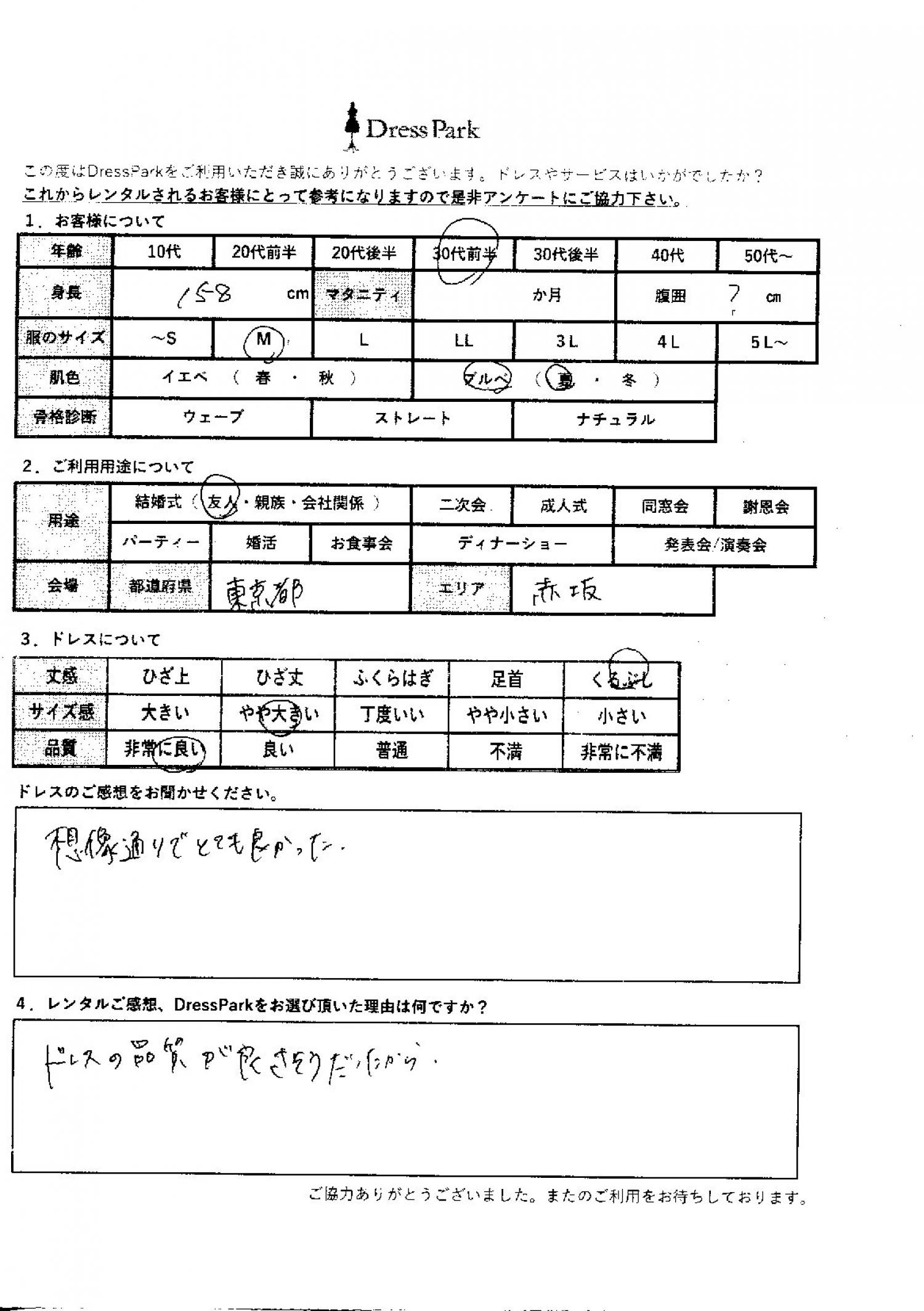 東京都 M.T様158㎝ Mサイズ六本木・麻布 #30代#M/L#155~159㎝#結婚式(友人)#東京都#六本木・麻布 ◆レンタルしたドレスはこちら ◆レンタルしたサイズは:M ◆レンタルした日付:2025/09/27 ドレスの着用感 ◆点数: (5点) ◆丈感:くるぶし ◆サイズ感:やや大きい ◆品質:非常に良い ◆肌色:ブルべ ドレスの感想 想像通りでとても良かった。 レンタルのご感想、DressParkをお選び頂いた理由 ドレスの品質が良さそうだったから。 CUSTOMER REVIEWS お客様の声 気になるカテゴリー別にご利用の感想をチェック! ◆AGE 年代で見る 10代 20代 30代 40代 50代~ ◆SIZE サイズで見る SS/S M/L 大きいサイズLL~ ◆HIGHT 身長で見る 140~149㎝ 150~154㎝ 155~159㎝ 160~164㎝ 165~169㎝ 170㎝以上 ◆マタニティ ~3か月 4~6か月 7~8か月 9~10か月 ◆肌色 イエベ ブルべ ◆骨格診断 ウェーブ ストレート ナチュラル ◆利用シーン 結婚式(友人) 結婚式(親族) 結婚式(会社関係) 二次会 成人式 謝恩会 パーティー その他 CUSTOMER REVIEWS都道府県別お客様の声 都道府県別にのお客様の声をチェック! 北海道 青森県 岩手県 宮城県 秋田県 山形県 福島県 茨城県 栃木県 群馬県 埼玉県 千葉県 東京都 神奈川県 新潟県 富山県 石川県 福井県 山梨県 長野県 岐阜県 静岡県 愛知県 三重県 滋賀県 京都府 大阪府 兵庫県 奈良県 和歌山県 鳥取県 島根県 岡山県 広島県 山口県 徳島県 香川県 愛媛県 高知県 福岡県 佐賀県 長崎県 熊本県 大分県 宮崎県 鹿児島県 沖縄県 CUSTOMER REVIEWSエリア別お客様の声 都道府県別にのお客様の声をチェック! 札幌 仙台 名古屋 軽井沢 金沢 神戸・芦屋 博多 那覇 梅田・新大阪 難波・心斎橋 鎌倉・湘南 横浜・みなとみらい 舞浜・浦安・幕張 大宮・浦和 青山・表参道 六本木・麻布 渋谷・恵比寿 新宿 池袋 銀座・丸の内 お台場・汐留 鹿児島市 郡山市 福島市 東予 甲府・石和 LINEでお問い合わせ このサイトではJavaScriptを使用しています