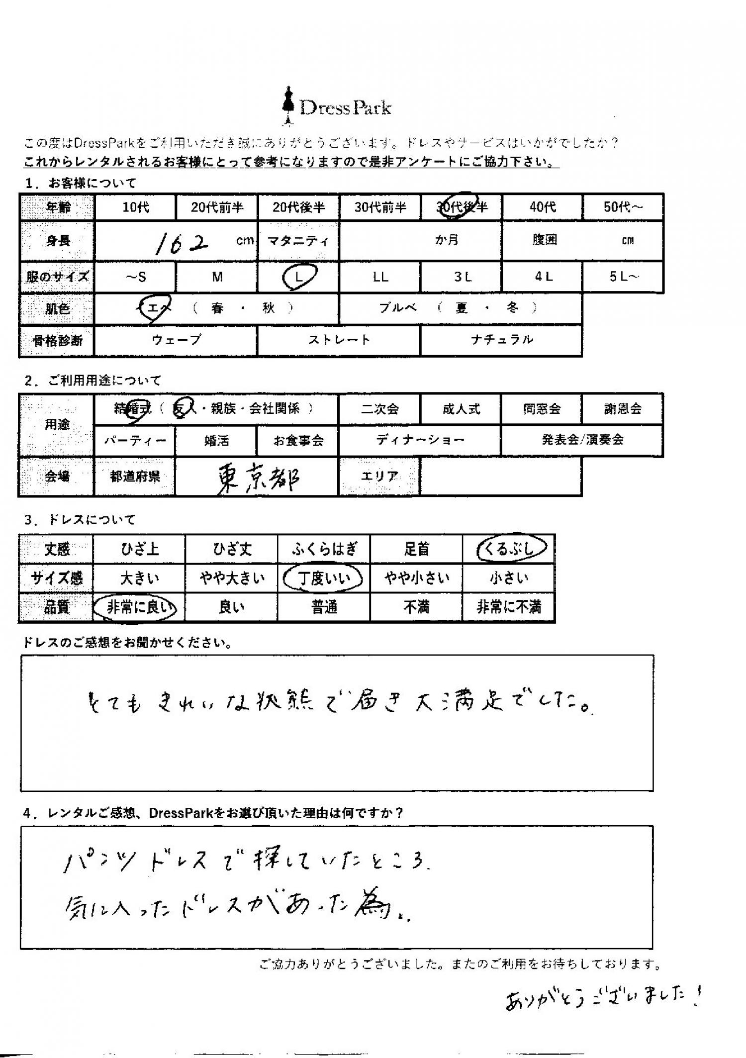東京都 M.O様162㎝ Lサイズ #30代#M/L#160~164㎝#結婚式(友人)#東京都 ◆レンタルしたドレスはこちら ◆レンタルしたサイズは:L ◆レンタルした日付:2025/09/28 ドレスの着用感 ◆点数: (5点) ◆丈感:くるぶし ◆サイズ感:丁度いい ◆品質:非常に良い ◆肌色:イエベ ドレスの感想 とてもきれいな状態で届き大満足でした。 レンタルのご感想、DressParkをお選び頂いた理由 パンツドレスで探していたところ、気に入ったドレスがあったため。ありがとうございました! CUSTOMER REVIEWS お客様の声 気になるカテゴリー別にご利用の感想をチェック! ◆AGE 年代で見る 10代 20代 30代 40代 50代~ ◆SIZE サイズで見る SS/S M/L 大きいサイズLL~ ◆HIGHT 身長で見る 140~149㎝ 150~154㎝ 155~159㎝ 160~164㎝ 165~169㎝ 170㎝以上 ◆マタニティ ~3か月 4~6か月 7~8か月 9~10か月 ◆肌色 イエベ ブルべ ◆骨格診断 ウェーブ ストレート ナチュラル ◆利用シーン 結婚式(友人) 結婚式(親族) 結婚式(会社関係) 二次会 成人式 謝恩会 パーティー その他 CUSTOMER REVIEWS都道府県別お客様の声 都道府県別にのお客様の声をチェック! 北海道 青森県 岩手県 宮城県 秋田県 山形県 福島県 茨城県 栃木県 群馬県 埼玉県 千葉県 東京都 神奈川県 新潟県 富山県 石川県 福井県 山梨県 長野県 岐阜県 静岡県 愛知県 三重県 滋賀県 京都府 大阪府 兵庫県 奈良県 和歌山県 鳥取県 島根県 岡山県 広島県 山口県 徳島県 香川県 愛媛県 高知県 福岡県 佐賀県 長崎県 熊本県 大分県 宮崎県 鹿児島県 沖縄県 CUSTOMER REVIEWSエリア別お客様の声 都道府県別にのお客様の声をチェック! 札幌 仙台 名古屋 軽井沢 金沢 神戸・芦屋 博多 那覇 梅田・新大阪 難波・心斎橋 鎌倉・湘南 横浜・みなとみらい 舞浜・浦安・幕張 大宮・浦和 青山・表参道 六本木・麻布 渋谷・恵比寿 新宿 池袋 銀座・丸の内 お台場・汐留 鹿児島市 郡山市 福島市 東予 甲府・石和 LINEでお問い合わせ このサイトではJavaScriptを使用しています