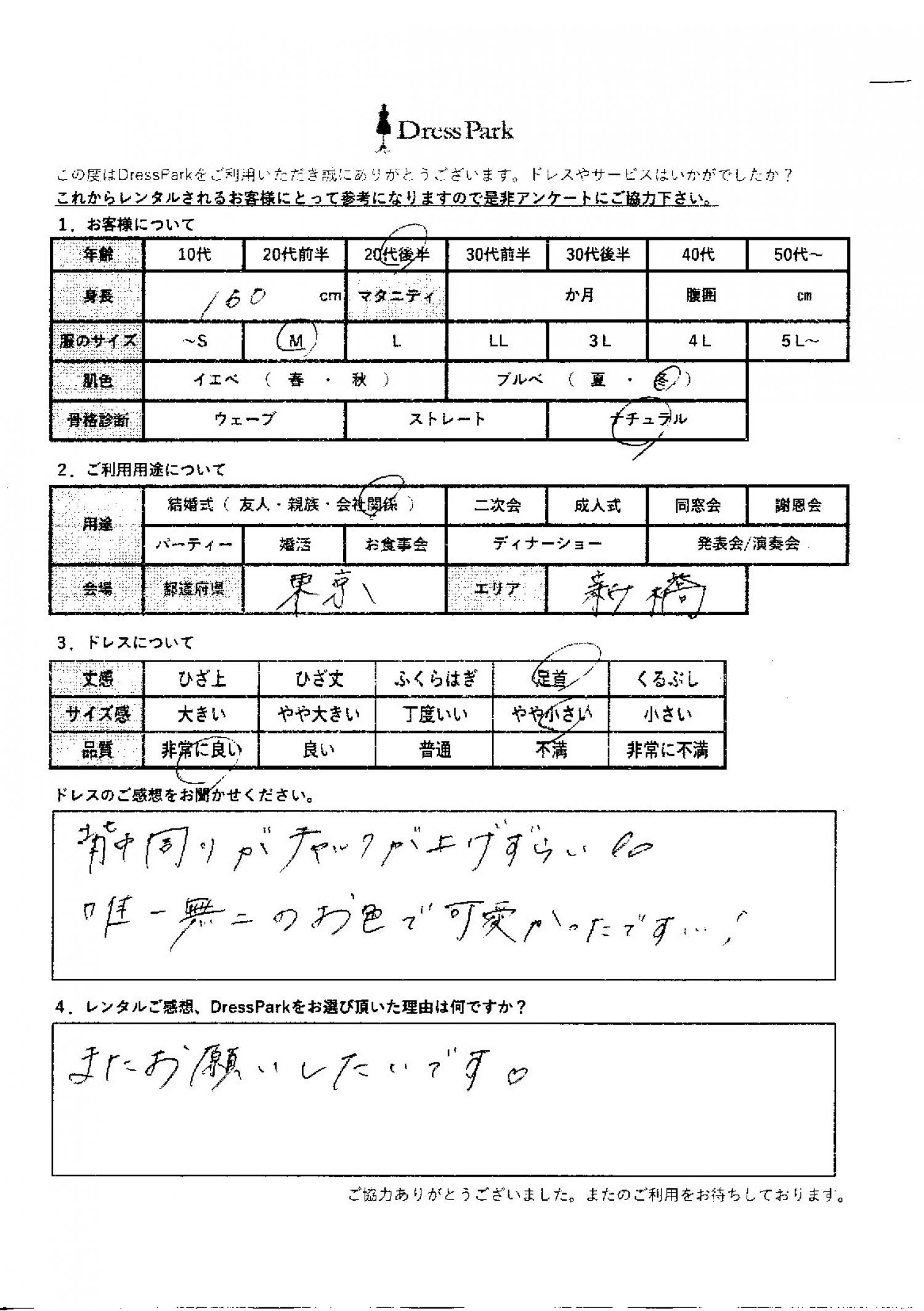 東京都 Y.M様160㎝ Mサイズ銀座・丸の内 #20代#M/L#160~164㎝#結婚式(会社関係)#東京都#銀座・丸の内 ◆レンタルしたドレスはこちら ◆レンタルしたサイズは:M ◆レンタルした日付:2025/09/28 ドレスの着用感 ◆点数: (5点) ◆丈感:足首 ◆サイズ感:やや小さい ◆品質:非常に良い ◆肌色:ブルべ ◆骨格診断:ナチュラル ドレスの感想 背中周りがチャックが上げづらい。唯一無二のお色で可愛かったです! レンタルのご感想、DressParkをお選び頂いた理由 またお願いしたいです♡ CUSTOMER REVIEWS お客様の声 気になるカテゴリー別にご利用の感想をチェック! ◆AGE 年代で見る 10代 20代 30代 40代 50代~ ◆SIZE サイズで見る SS/S M/L 大きいサイズLL~ ◆HIGHT 身長で見る 140~149㎝ 150~154㎝ 155~159㎝ 160~164㎝ 165~169㎝ 170㎝以上 ◆マタニティ ~3か月 4~6か月 7~8か月 9~10か月 ◆肌色 イエベ ブルべ ◆骨格診断 ウェーブ ストレート ナチュラル ◆利用シーン 結婚式(友人) 結婚式(親族) 結婚式(会社関係) 二次会 成人式 謝恩会 パーティー その他 CUSTOMER REVIEWS都道府県別お客様の声 都道府県別にのお客様の声をチェック! 北海道 青森県 岩手県 宮城県 秋田県 山形県 福島県 茨城県 栃木県 群馬県 埼玉県 千葉県 東京都 神奈川県 新潟県 富山県 石川県 福井県 山梨県 長野県 岐阜県 静岡県 愛知県 三重県 滋賀県 京都府 大阪府 兵庫県 奈良県 和歌山県 鳥取県 島根県 岡山県 広島県 山口県 徳島県 香川県 愛媛県 高知県 福岡県 佐賀県 長崎県 熊本県 大分県 宮崎県 鹿児島県 沖縄県 CUSTOMER REVIEWSエリア別お客様の声 都道府県別にのお客様の声をチェック! 札幌 仙台 名古屋 軽井沢 金沢 神戸・芦屋 博多 那覇 梅田・新大阪 難波・心斎橋 鎌倉・湘南 横浜・みなとみらい 舞浜・浦安・幕張 大宮・浦和 青山・表参道 六本木・麻布 渋谷・恵比寿 新宿 池袋 銀座・丸の内 お台場・汐留 鹿児島市 郡山市 福島市 東予 甲府・石和 LINEでお問い合わせ このサイトではJavaScriptを使用しています