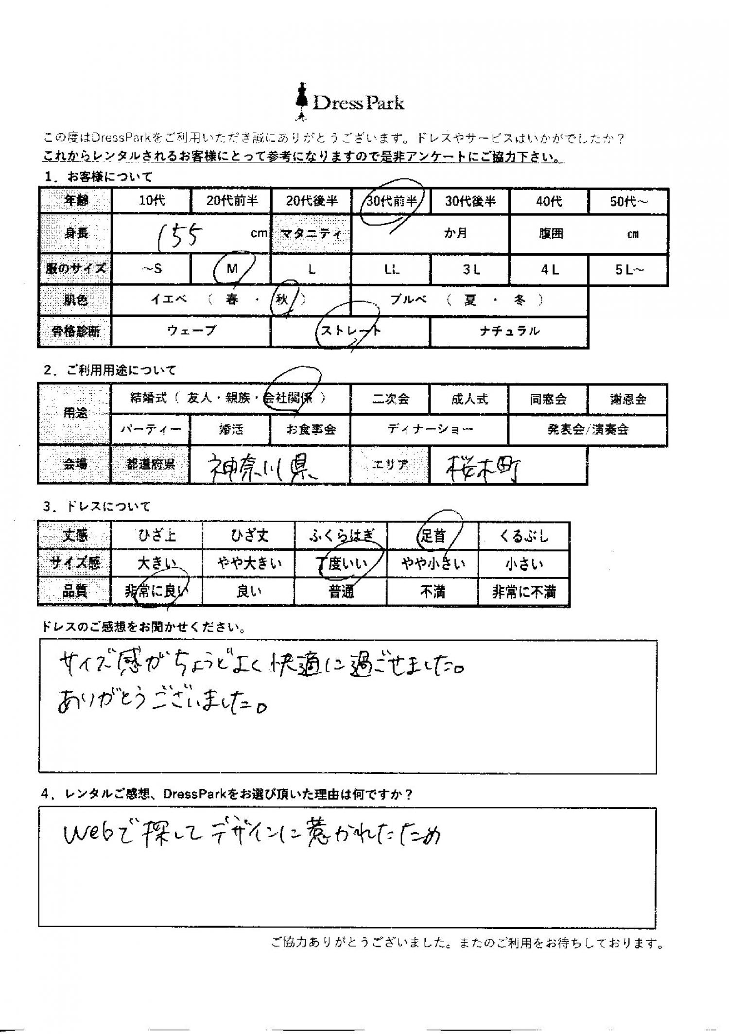 神奈川県 T.M様155㎝ Mサイズ #30代#M/L#155~159㎝#結婚式(会社関係)#神奈川県 ◆レンタルしたドレスはこちら ◆レンタルしたサイズは:M ◆レンタルした日付:2025/09/28 ドレスの着用感 ◆点数: (5点) ◆丈感:足首 ◆サイズ感:丁度いい ◆品質:非常に良い ◆肌色:イエベ ◆骨格診断:ストレート ドレスの感想 サイズ感がちょうど良く、快適に過ごせました。ありがとうございました。 レンタルのご感想、DressParkをお選び頂いた理由 ウェブで探してデザインに惹かれたため。 CUSTOMER REVIEWS お客様の声 気になるカテゴリー別にご利用の感想をチェック! ◆AGE 年代で見る 10代 20代 30代 40代 50代~ ◆SIZE サイズで見る SS/S M/L 大きいサイズLL~ ◆HIGHT 身長で見る 140~149㎝ 150~154㎝ 155~159㎝ 160~164㎝ 165~169㎝ 170㎝以上 ◆マタニティ ~3か月 4~6か月 7~8か月 9~10か月 ◆肌色 イエベ ブルべ ◆骨格診断 ウェーブ ストレート ナチュラル ◆利用シーン 結婚式(友人) 結婚式(親族) 結婚式(会社関係) 二次会 成人式 謝恩会 パーティー その他 CUSTOMER REVIEWS都道府県別お客様の声 都道府県別にのお客様の声をチェック! 北海道 青森県 岩手県 宮城県 秋田県 山形県 福島県 茨城県 栃木県 群馬県 埼玉県 千葉県 東京都 神奈川県 新潟県 富山県 石川県 福井県 山梨県 長野県 岐阜県 静岡県 愛知県 三重県 滋賀県 京都府 大阪府 兵庫県 奈良県 和歌山県 鳥取県 島根県 岡山県 広島県 山口県 徳島県 香川県 愛媛県 高知県 福岡県 佐賀県 長崎県 熊本県 大分県 宮崎県 鹿児島県 沖縄県 CUSTOMER REVIEWSエリア別お客様の声 都道府県別にのお客様の声をチェック! 札幌 仙台 名古屋 軽井沢 金沢 神戸・芦屋 博多 那覇 梅田・新大阪 難波・心斎橋 鎌倉・湘南 横浜・みなとみらい 舞浜・浦安・幕張 大宮・浦和 青山・表参道 六本木・麻布 渋谷・恵比寿 新宿 池袋 銀座・丸の内 お台場・汐留 鹿児島市 郡山市 福島市 東予 甲府・石和 LINEでお問い合わせ このサイトではJavaScriptを使用しています