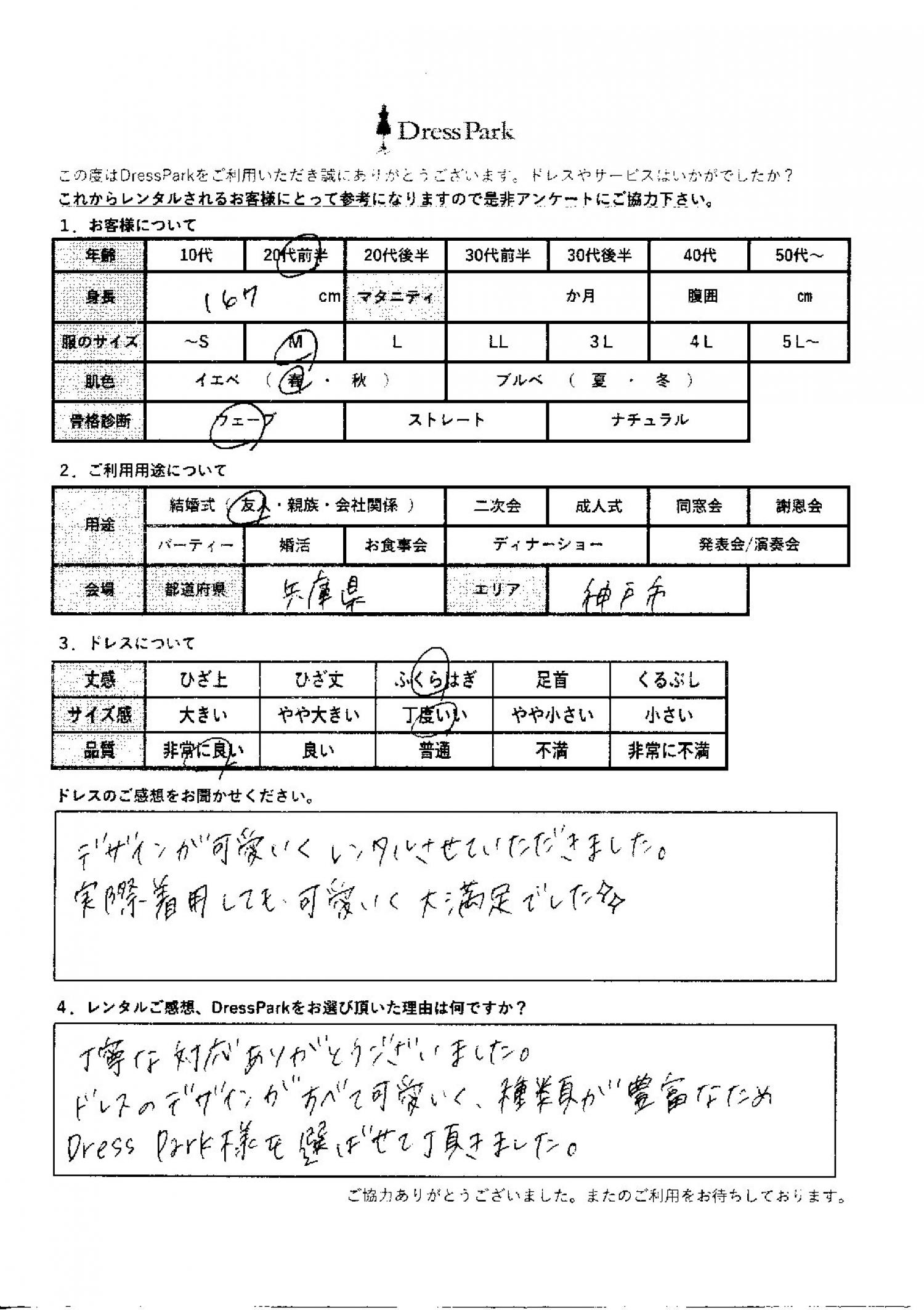 兵庫県 Y.H様167㎝ Mサイズ神戸・芦屋 #20代#M/L#165~169㎝#結婚式(友人)#兵庫県#神戸・芦屋 ◆レンタルしたドレスはこちら ◆レンタルしたサイズは:M ◆レンタルした日付:2025/09/28 ドレスの着用感 ◆点数: (5点) ◆丈感:ふくらはぎ ◆サイズ感:丁度いい ◆品質:非常に良い ◆肌色:イエベ ◆骨格診断:ウェーブ ドレスの感想 デザインが可愛くレンタルさせていただきました。実際着用しても可愛く大満足でした。 レンタルのご感想、DressParkをお選び頂いた理由 丁寧な対応ありがとうございました。ドレスのデザインが全て可愛く、種類が豊富なため、ドレスパーク様を選ばせていただきました。 CUSTOMER REVIEWS お客様の声 気になるカテゴリー別にご利用の感想をチェック! ◆AGE 年代で見る 10代 20代 30代 40代 50代~ ◆SIZE サイズで見る SS/S M/L 大きいサイズLL~ ◆HIGHT 身長で見る 140~149㎝ 150~154㎝ 155~159㎝ 160~164㎝ 165~169㎝ 170㎝以上 ◆マタニティ ~3か月 4~6か月 7~8か月 9~10か月 ◆肌色 イエベ ブルべ ◆骨格診断 ウェーブ ストレート ナチュラル ◆利用シーン 結婚式(友人) 結婚式(親族) 結婚式(会社関係) 二次会 成人式 謝恩会 パーティー その他 CUSTOMER REVIEWS都道府県別お客様の声 都道府県別にのお客様の声をチェック! 北海道 青森県 岩手県 宮城県 秋田県 山形県 福島県 茨城県 栃木県 群馬県 埼玉県 千葉県 東京都 神奈川県 新潟県 富山県 石川県 福井県 山梨県 長野県 岐阜県 静岡県 愛知県 三重県 滋賀県 京都府 大阪府 兵庫県 奈良県 和歌山県 鳥取県 島根県 岡山県 広島県 山口県 徳島県 香川県 愛媛県 高知県 福岡県 佐賀県 長崎県 熊本県 大分県 宮崎県 鹿児島県 沖縄県 CUSTOMER REVIEWSエリア別お客様の声 都道府県別にのお客様の声をチェック! 札幌 仙台 名古屋 軽井沢 金沢 神戸・芦屋 博多 那覇 梅田・新大阪 難波・心斎橋 鎌倉・湘南 横浜・みなとみらい 舞浜・浦安・幕張 大宮・浦和 青山・表参道 六本木・麻布 渋谷・恵比寿 新宿 池袋 銀座・丸の内 お台場・汐留 鹿児島市 郡山市 福島市 東予 甲府・石和 LINEでお問い合わせ このサイトではJavaScriptを使用しています