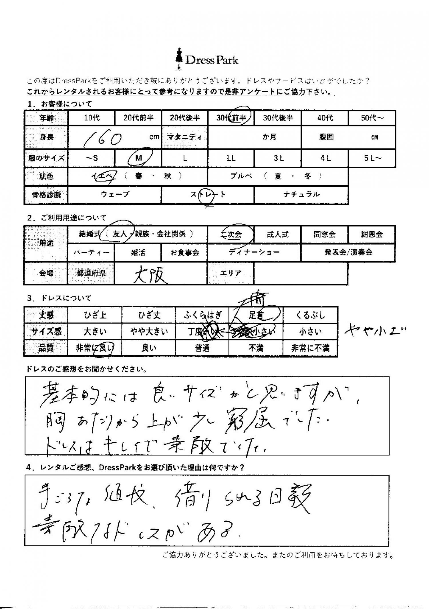 大阪府 H.N様160㎝ Mサイズ #30代#M/L#160~164㎝#結婚式(友人)#大阪府 ◆レンタルしたドレスはこちら ◆レンタルしたサイズは:M ◆レンタルした日付:2025/09/28 ドレスの着用感 ◆点数: (5点) ◆丈感:足首 ◆サイズ感:やや小さい ◆品質:非常に良い ◆肌色:イエベ ◆骨格診断:ストレート ドレスの感想 基本的には良いサイズかと思いますが、胸あたりから上が少し窮屈でした。ドレスは綺麗で素敵でした。 レンタルのご感想、DressParkをお選び頂いた理由 手ごろな値段、借りられる日数、素敵なドレスがある。 CUSTOMER REVIEWS お客様の声 気になるカテゴリー別にご利用の感想をチェック! ◆AGE 年代で見る 10代 20代 30代 40代 50代~ ◆SIZE サイズで見る SS/S M/L 大きいサイズLL~ ◆HIGHT 身長で見る 140~149㎝ 150~154㎝ 155~159㎝ 160~164㎝ 165~169㎝ 170㎝以上 ◆マタニティ ~3か月 4~6か月 7~8か月 9~10か月 ◆肌色 イエベ ブルべ ◆骨格診断 ウェーブ ストレート ナチュラル ◆利用シーン 結婚式(友人) 結婚式(親族) 結婚式(会社関係) 二次会 成人式 謝恩会 パーティー その他 CUSTOMER REVIEWS都道府県別お客様の声 都道府県別にのお客様の声をチェック! 北海道 青森県 岩手県 宮城県 秋田県 山形県 福島県 茨城県 栃木県 群馬県 埼玉県 千葉県 東京都 神奈川県 新潟県 富山県 石川県 福井県 山梨県 長野県 岐阜県 静岡県 愛知県 三重県 滋賀県 京都府 大阪府 兵庫県 奈良県 和歌山県 鳥取県 島根県 岡山県 広島県 山口県 徳島県 香川県 愛媛県 高知県 福岡県 佐賀県 長崎県 熊本県 大分県 宮崎県 鹿児島県 沖縄県 CUSTOMER REVIEWSエリア別お客様の声 都道府県別にのお客様の声をチェック! 札幌 仙台 名古屋 軽井沢 金沢 神戸・芦屋 博多 那覇 梅田・新大阪 難波・心斎橋 鎌倉・湘南 横浜・みなとみらい 舞浜・浦安・幕張 大宮・浦和 青山・表参道 六本木・麻布 渋谷・恵比寿 新宿 池袋 銀座・丸の内 お台場・汐留 鹿児島市 郡山市 福島市 東予 甲府・石和 LINEでお問い合わせ このサイトではJavaScriptを使用しています