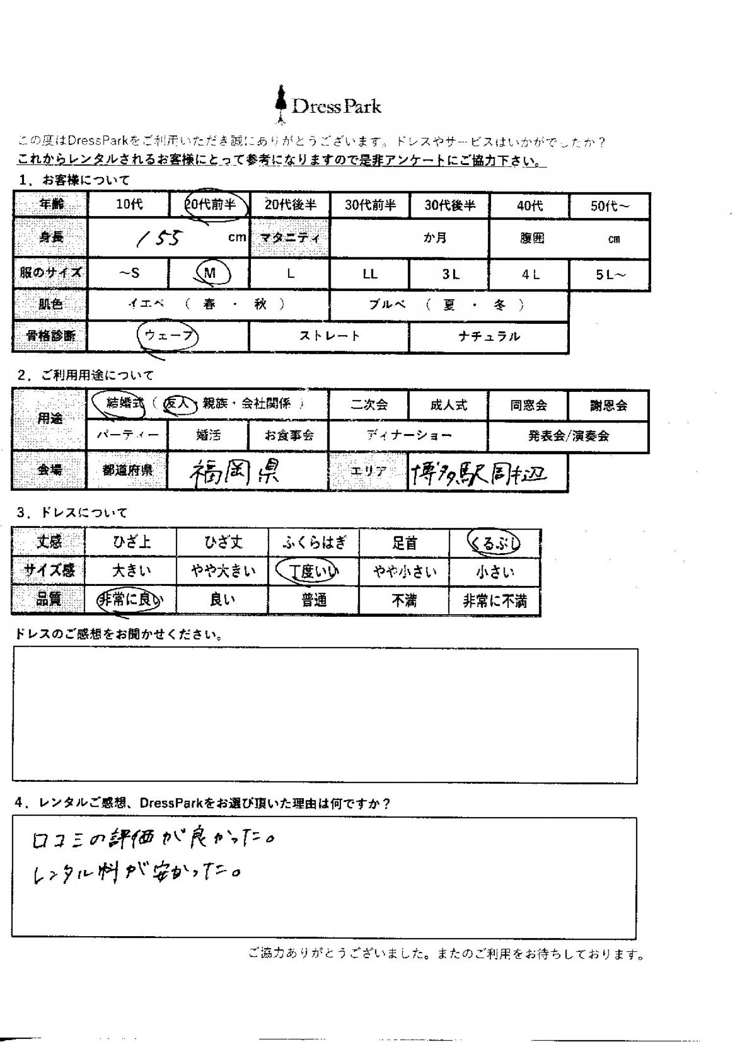福岡県 A.K様155㎝ Mサイズ博多 #20代#M/L#155~159㎝#結婚式(友人)#福岡県#博多 ◆レンタルしたドレスはこちら ◆レンタルしたサイズは:M ◆レンタルした日付:2025/09/27 ドレスの着用感 ◆点数: (5点) ◆丈感:くるぶし ◆サイズ感:丁度いい ◆品質:非常に良い ◆骨格診断:ウェーブ レンタルのご感想、DressParkをお選び頂いた理由 口コミの評価が良かった。レンタル料が安かった。 CUSTOMER REVIEWS お客様の声 気になるカテゴリー別にご利用の感想をチェック! ◆AGE 年代で見る 10代 20代 30代 40代 50代~ ◆SIZE サイズで見る SS/S M/L 大きいサイズLL~ ◆HIGHT 身長で見る 140~149㎝ 150~154㎝ 155~159㎝ 160~164㎝ 165~169㎝ 170㎝以上 ◆マタニティ ~3か月 4~6か月 7~8か月 9~10か月 ◆肌色 イエベ ブルべ ◆骨格診断 ウェーブ ストレート ナチュラル ◆利用シーン 結婚式(友人) 結婚式(親族) 結婚式(会社関係) 二次会 成人式 謝恩会 パーティー その他 CUSTOMER REVIEWS都道府県別お客様の声 都道府県別にのお客様の声をチェック! 北海道 青森県 岩手県 宮城県 秋田県 山形県 福島県 茨城県 栃木県 群馬県 埼玉県 千葉県 東京都 神奈川県 新潟県 富山県 石川県 福井県 山梨県 長野県 岐阜県 静岡県 愛知県 三重県 滋賀県 京都府 大阪府 兵庫県 奈良県 和歌山県 鳥取県 島根県 岡山県 広島県 山口県 徳島県 香川県 愛媛県 高知県 福岡県 佐賀県 長崎県 熊本県 大分県 宮崎県 鹿児島県 沖縄県 CUSTOMER REVIEWSエリア別お客様の声 都道府県別にのお客様の声をチェック! 札幌 仙台 名古屋 軽井沢 金沢 神戸・芦屋 博多 那覇 梅田・新大阪 難波・心斎橋 鎌倉・湘南 横浜・みなとみらい 舞浜・浦安・幕張 大宮・浦和 青山・表参道 六本木・麻布 渋谷・恵比寿 新宿 池袋 銀座・丸の内 お台場・汐留 鹿児島市 郡山市 福島市 東予 甲府・石和 LINEでお問い合わせ このサイトではJavaScriptを使用しています