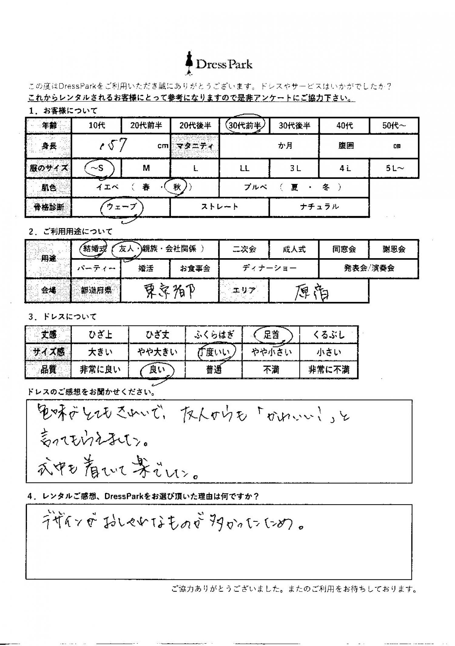 東京都 M.K様157㎝ ~Sサイズ青山・表参道 #30代#SS/S#155~159㎝#結婚式(友人)#東京都#青山・表参道 ◆レンタルしたドレスはこちら ◆レンタルしたサイズは:M ◆レンタルした日付:2025/09/28 ドレスの着用感 ◆点数: (4点) ◆丈感:足首 ◆サイズ感:丁度いい ◆品質:良い ◆肌色:イエベ ◆骨格診断:ウェーブ ドレスの感想 色味がとても綺麗で、友人からも「かわいい!」と言ってもらえました。式中も着ていて楽でした。 レンタルのご感想、DressParkをお選び頂いた理由 デザインがおしゃれなものが多かったため。 CUSTOMER REVIEWS お客様の声 気になるカテゴリー別にご利用の感想をチェック! ◆AGE 年代で見る 10代 20代 30代 40代 50代~ ◆SIZE サイズで見る SS/S M/L 大きいサイズLL~ ◆HIGHT 身長で見る 140~149㎝ 150~154㎝ 155~159㎝ 160~164㎝ 165~169㎝ 170㎝以上 ◆マタニティ ~3か月 4~6か月 7~8か月 9~10か月 ◆肌色 イエベ ブルべ ◆骨格診断 ウェーブ ストレート ナチュラル ◆利用シーン 結婚式(友人) 結婚式(親族) 結婚式(会社関係) 二次会 成人式 謝恩会 パーティー その他 CUSTOMER REVIEWS都道府県別お客様の声 都道府県別にのお客様の声をチェック! 北海道 青森県 岩手県 宮城県 秋田県 山形県 福島県 茨城県 栃木県 群馬県 埼玉県 千葉県 東京都 神奈川県 新潟県 富山県 石川県 福井県 山梨県 長野県 岐阜県 静岡県 愛知県 三重県 滋賀県 京都府 大阪府 兵庫県 奈良県 和歌山県 鳥取県 島根県 岡山県 広島県 山口県 徳島県 香川県 愛媛県 高知県 福岡県 佐賀県 長崎県 熊本県 大分県 宮崎県 鹿児島県 沖縄県 CUSTOMER REVIEWSエリア別お客様の声 都道府県別にのお客様の声をチェック! 札幌 仙台 名古屋 軽井沢 金沢 神戸・芦屋 博多 那覇 梅田・新大阪 難波・心斎橋 鎌倉・湘南 横浜・みなとみらい 舞浜・浦安・幕張 大宮・浦和 青山・表参道 六本木・麻布 渋谷・恵比寿 新宿 池袋 銀座・丸の内 お台場・汐留 鹿児島市 郡山市 福島市 東予 甲府・石和 LINEでお問い合わせ このサイトではJavaScriptを使用しています