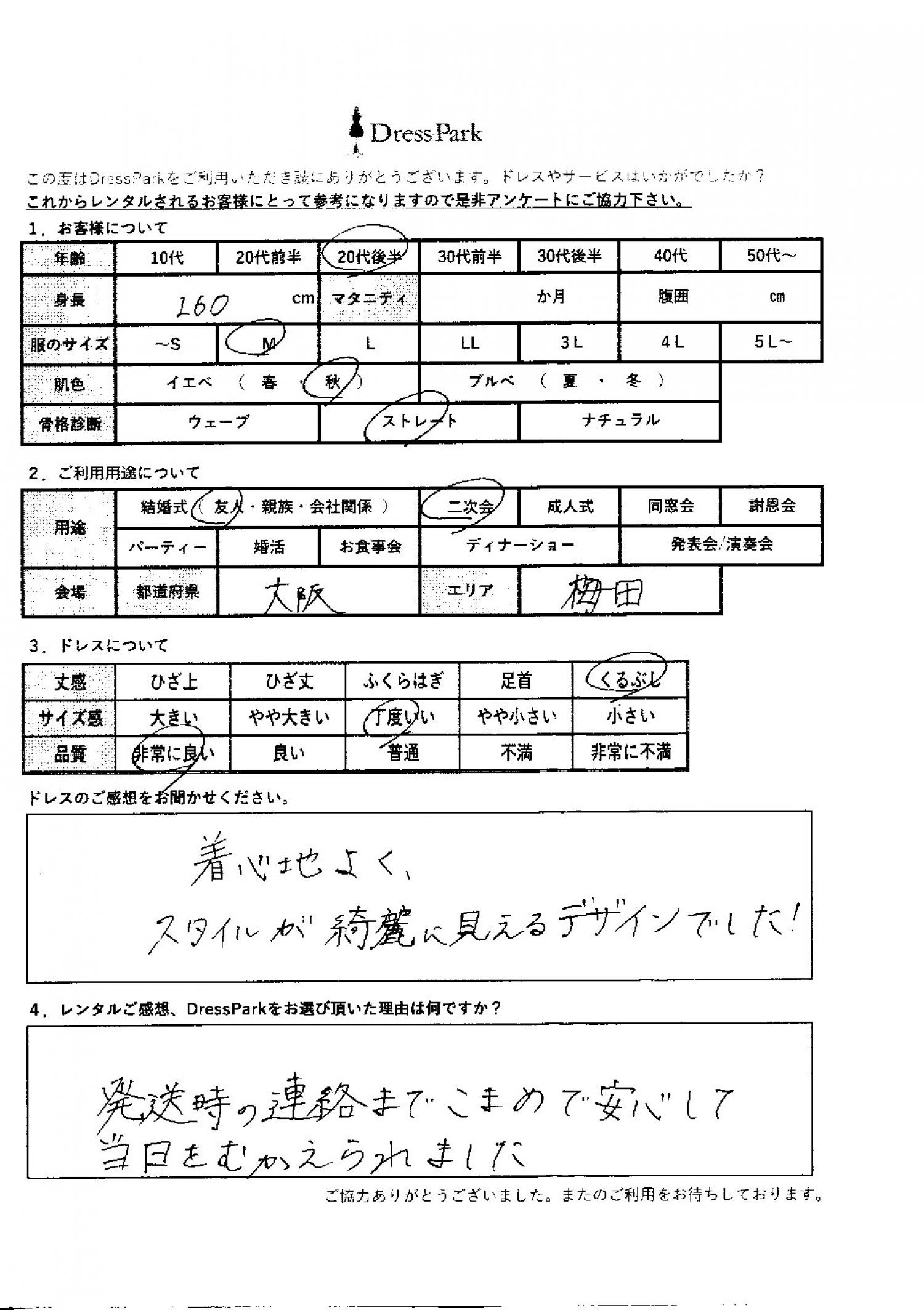 大阪府 Y.S様160㎝ Mサイズ梅田・新大阪 #20代#M/L#160~164㎝#結婚式(友人)#大阪府#梅田・新大阪 ◆レンタルしたドレスはこちら ◆レンタルしたサイズは:M ◆レンタルした日付:2025/10/04 ドレスの着用感 ◆点数: (5点) ◆丈感:くるぶし ◆サイズ感:丁度いい ◆品質:非常に良い ◆肌色:イエベ ◆骨格診断:ストレート ドレスの感想 着心地よくスタイルがきれいに見えるデザインでした! レンタルのご感想、DressParkをお選び頂いた理由 発送時の連絡までこまめで安心して当日を迎えられました。 CUSTOMER REVIEWS お客様の声 気になるカテゴリー別にご利用の感想をチェック! ◆AGE 年代で見る 10代 20代 30代 40代 50代~ ◆SIZE サイズで見る SS/S M/L 大きいサイズLL~ ◆HIGHT 身長で見る 140~149㎝ 150~154㎝ 155~159㎝ 160~164㎝ 165~169㎝ 170㎝以上 ◆マタニティ ~3か月 4~6か月 7~8か月 9~10か月 ◆肌色 イエベ ブルべ ◆骨格診断 ウェーブ ストレート ナチュラル ◆利用シーン 結婚式(友人) 結婚式(親族) 結婚式(会社関係) 二次会 成人式 謝恩会 パーティー その他 CUSTOMER REVIEWS都道府県別お客様の声 都道府県別にのお客様の声をチェック! 北海道 青森県 岩手県 宮城県 秋田県 山形県 福島県 茨城県 栃木県 群馬県 埼玉県 千葉県 東京都 神奈川県 新潟県 富山県 石川県 福井県 山梨県 長野県 岐阜県 静岡県 愛知県 三重県 滋賀県 京都府 大阪府 兵庫県 奈良県 和歌山県 鳥取県 島根県 岡山県 広島県 山口県 徳島県 香川県 愛媛県 高知県 福岡県 佐賀県 長崎県 熊本県 大分県 宮崎県 鹿児島県 沖縄県 CUSTOMER REVIEWSエリア別お客様の声 都道府県別にのお客様の声をチェック! 札幌 仙台 名古屋 軽井沢 金沢 神戸・芦屋 博多 那覇 梅田・新大阪 難波・心斎橋 鎌倉・湘南 横浜・みなとみらい 舞浜・浦安・幕張 大宮・浦和 青山・表参道 六本木・麻布 渋谷・恵比寿 新宿 池袋 銀座・丸の内 お台場・汐留 鹿児島市 郡山市 福島市 東予 甲府・石和 LINEでお問い合わせ このサイトではJavaScriptを使用しています