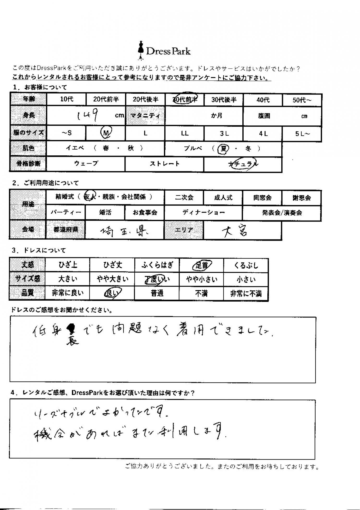 埼玉県 Y.A様149㎝ Mサイズ大宮・浦和 #30代#M/L#140~149㎝#結婚式(友人)#埼玉県#大宮・浦和 ◆レンタルしたドレスはこちら ◆レンタルしたサイズは:M ◆レンタルした日付:2025/10/04 ドレスの着用感 ◆点数: (4点) ◆丈感:足首 ◆サイズ感:丁度いい ◆品質:良い ◆肌色:ブルべ ◆骨格診断:ナチュラル ドレスの感想 低身長でも問題なく着用できました。 レンタルのご感想、DressParkをお選び頂いた理由 リーズナブルでよかったです。機会があればまた利用します。 CUSTOMER REVIEWS お客様の声 気になるカテゴリー別にご利用の感想をチェック! ◆AGE 年代で見る 10代 20代 30代 40代 50代~ ◆SIZE サイズで見る SS/S M/L 大きいサイズLL~ ◆HIGHT 身長で見る 140~149㎝ 150~154㎝ 155~159㎝ 160~164㎝ 165~169㎝ 170㎝以上 ◆マタニティ ~3か月 4~6か月 7~8か月 9~10か月 ◆肌色 イエベ ブルべ ◆骨格診断 ウェーブ ストレート ナチュラル ◆利用シーン 結婚式(友人) 結婚式(親族) 結婚式(会社関係) 二次会 成人式 謝恩会 パーティー その他 CUSTOMER REVIEWS都道府県別お客様の声 都道府県別にのお客様の声をチェック! 北海道 青森県 岩手県 宮城県 秋田県 山形県 福島県 茨城県 栃木県 群馬県 埼玉県 千葉県 東京都 神奈川県 新潟県 富山県 石川県 福井県 山梨県 長野県 岐阜県 静岡県 愛知県 三重県 滋賀県 京都府 大阪府 兵庫県 奈良県 和歌山県 鳥取県 島根県 岡山県 広島県 山口県 徳島県 香川県 愛媛県 高知県 福岡県 佐賀県 長崎県 熊本県 大分県 宮崎県 鹿児島県 沖縄県 CUSTOMER REVIEWSエリア別お客様の声 都道府県別にのお客様の声をチェック! 札幌 仙台 名古屋 軽井沢 金沢 神戸・芦屋 博多 那覇 梅田・新大阪 難波・心斎橋 鎌倉・湘南 横浜・みなとみらい 舞浜・浦安・幕張 大宮・浦和 青山・表参道 六本木・麻布 渋谷・恵比寿 新宿 池袋 銀座・丸の内 お台場・汐留 鹿児島市 郡山市 福島市 東予 甲府・石和 LINEでお問い合わせ このサイトではJavaScriptを使用しています