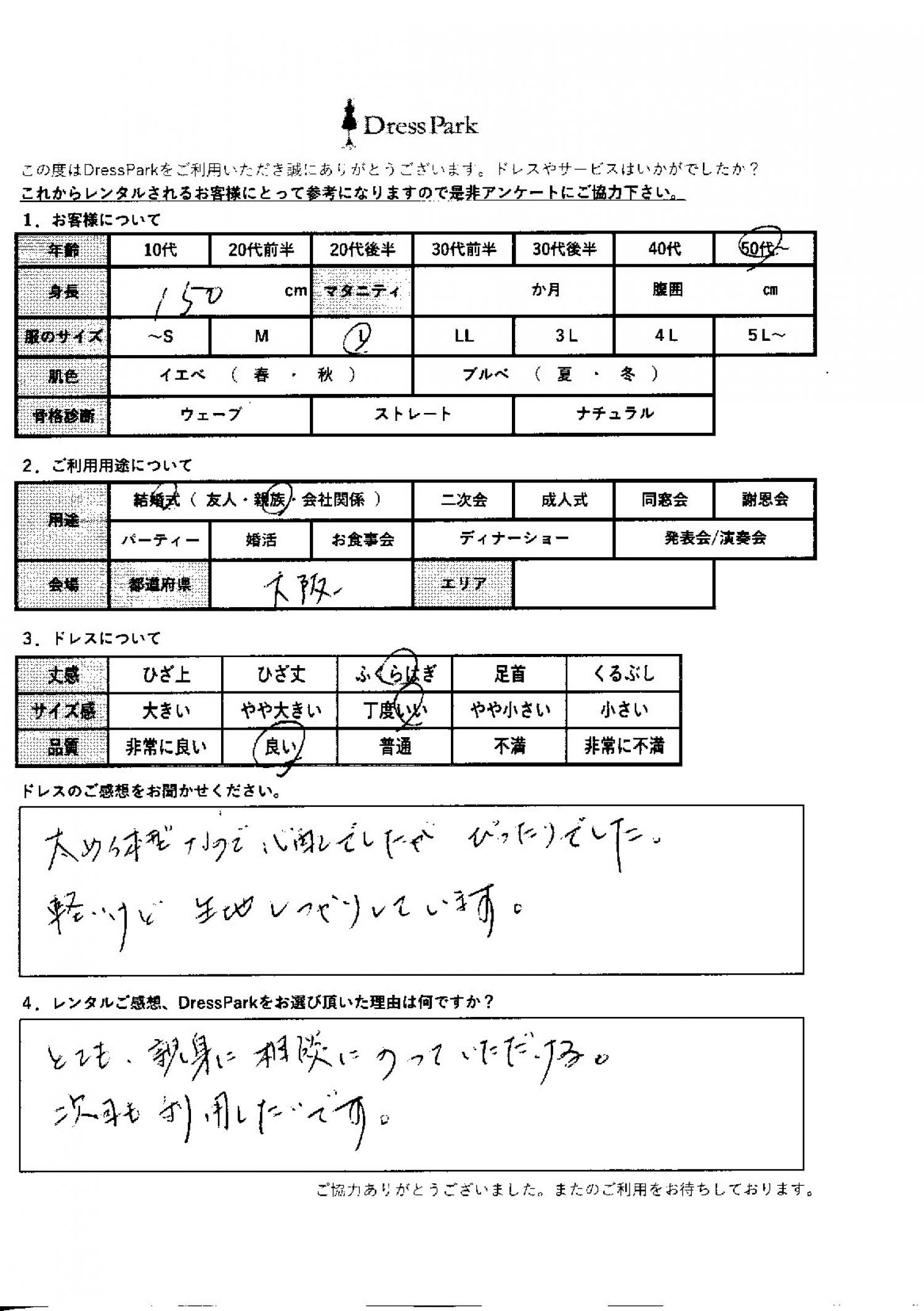 大阪府 T.H様150㎝ Lサイズ #50代~#M/L#150~154㎝#結婚式(親族)#大阪府 ◆レンタルしたドレスはこちら ◆レンタルしたサイズは:L ◆レンタルした日付:2025/10/04 ドレスの着用感 ◆点数: (4点) ◆丈感:ふくらはぎ ◆サイズ感:丁度いい ◆品質:良い ドレスの感想 太め体型なので心配でしたがぴったりでした。軽いけど生地しっかりしています。 レンタルのご感想、DressParkをお選び頂いた理由 とても親身に相談に乗っていただける。次回も利用したいです。 CUSTOMER REVIEWS お客様の声 気になるカテゴリー別にご利用の感想をチェック! ◆AGE 年代で見る 10代 20代 30代 40代 50代~ ◆SIZE サイズで見る SS/S M/L 大きいサイズLL~ ◆HIGHT 身長で見る 140~149㎝ 150~154㎝ 155~159㎝ 160~164㎝ 165~169㎝ 170㎝以上 ◆マタニティ ~3か月 4~6か月 7~8か月 9~10か月 ◆肌色 イエベ ブルべ ◆骨格診断 ウェーブ ストレート ナチュラル ◆利用シーン 結婚式(友人) 結婚式(親族) 結婚式(会社関係) 二次会 成人式 謝恩会 パーティー その他 CUSTOMER REVIEWS都道府県別お客様の声 都道府県別にのお客様の声をチェック! 北海道 青森県 岩手県 宮城県 秋田県 山形県 福島県 茨城県 栃木県 群馬県 埼玉県 千葉県 東京都 神奈川県 新潟県 富山県 石川県 福井県 山梨県 長野県 岐阜県 静岡県 愛知県 三重県 滋賀県 京都府 大阪府 兵庫県 奈良県 和歌山県 鳥取県 島根県 岡山県 広島県 山口県 徳島県 香川県 愛媛県 高知県 福岡県 佐賀県 長崎県 熊本県 大分県 宮崎県 鹿児島県 沖縄県 CUSTOMER REVIEWSエリア別お客様の声 都道府県別にのお客様の声をチェック! 札幌 仙台 名古屋 軽井沢 金沢 神戸・芦屋 博多 那覇 梅田・新大阪 難波・心斎橋 鎌倉・湘南 横浜・みなとみらい 舞浜・浦安・幕張 大宮・浦和 青山・表参道 六本木・麻布 渋谷・恵比寿 新宿 池袋 銀座・丸の内 お台場・汐留 鹿児島市 郡山市 福島市 東予 甲府・石和 LINEでお問い合わせ このサイトではJavaScriptを使用しています