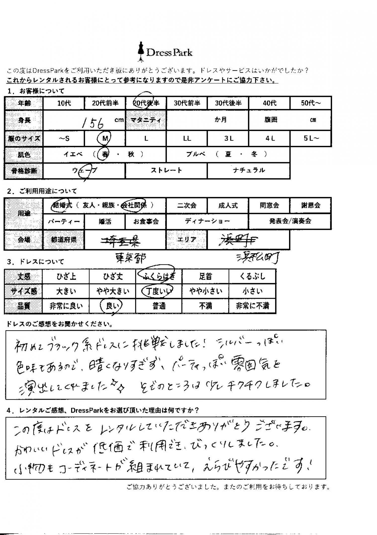 初めてブラック系ドレスに挑戦しました!シルバーっぽい色味もあるので、暗くなりすぎず、パーティーっぽい雰囲気を演出してくれました。袖のところは少しチクチクしました。