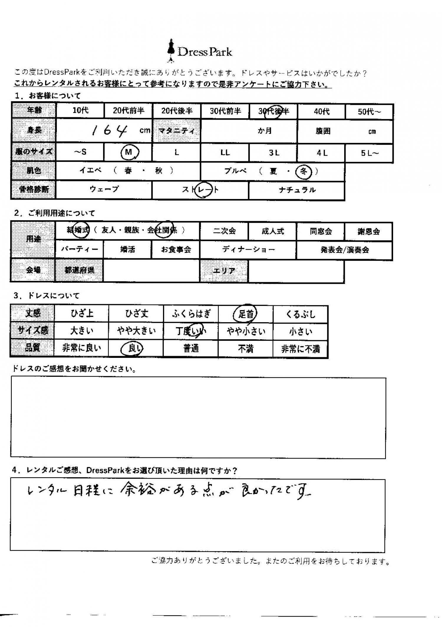 千葉県 E.M様164㎝ Mサイズ #30代#M/L#160~164㎝#結婚式(会社関係)#千葉県 ◆レンタルしたドレスはこちら ◆レンタルしたサイズは:M ◆レンタルした日付:2025/10/04 ドレスの着用感 ◆点数: (4点) ◆丈感:足首 ◆サイズ感:丁度いい ◆品質:良い ◆肌色:ブルべ ◆骨格診断:ストレート レンタルのご感想、DressParkをお選び頂いた理由 レンタル日程に余裕がある点が良かったです。 CUSTOMER REVIEWS お客様の声 気になるカテゴリー別にご利用の感想をチェック! ◆AGE 年代で見る 10代 20代 30代 40代 50代~ ◆SIZE サイズで見る SS/S M/L 大きいサイズLL~ ◆HIGHT 身長で見る 140~149㎝ 150~154㎝ 155~159㎝ 160~164㎝ 165~169㎝ 170㎝以上 ◆マタニティ ~3か月 4~6か月 7~8か月 9~10か月 ◆肌色 イエベ ブルべ ◆骨格診断 ウェーブ ストレート ナチュラル ◆利用シーン 結婚式(友人) 結婚式(親族) 結婚式(会社関係) 二次会 成人式 謝恩会 パーティー その他 CUSTOMER REVIEWS都道府県別お客様の声 都道府県別にのお客様の声をチェック! 北海道 青森県 岩手県 宮城県 秋田県 山形県 福島県 茨城県 栃木県 群馬県 埼玉県 千葉県 東京都 神奈川県 新潟県 富山県 石川県 福井県 山梨県 長野県 岐阜県 静岡県 愛知県 三重県 滋賀県 京都府 大阪府 兵庫県 奈良県 和歌山県 鳥取県 島根県 岡山県 広島県 山口県 徳島県 香川県 愛媛県 高知県 福岡県 佐賀県 長崎県 熊本県 大分県 宮崎県 鹿児島県 沖縄県 CUSTOMER REVIEWSエリア別お客様の声 都道府県別にのお客様の声をチェック! 札幌 仙台 名古屋 軽井沢 金沢 神戸・芦屋 博多 那覇 梅田・新大阪 難波・心斎橋 鎌倉・湘南 横浜・みなとみらい 舞浜・浦安・幕張 大宮・浦和 青山・表参道 六本木・麻布 渋谷・恵比寿 新宿 池袋 銀座・丸の内 お台場・汐留 鹿児島市 郡山市 福島市 東予 甲府・石和 LINEでお問い合わせ このサイトではJavaScriptを使用しています