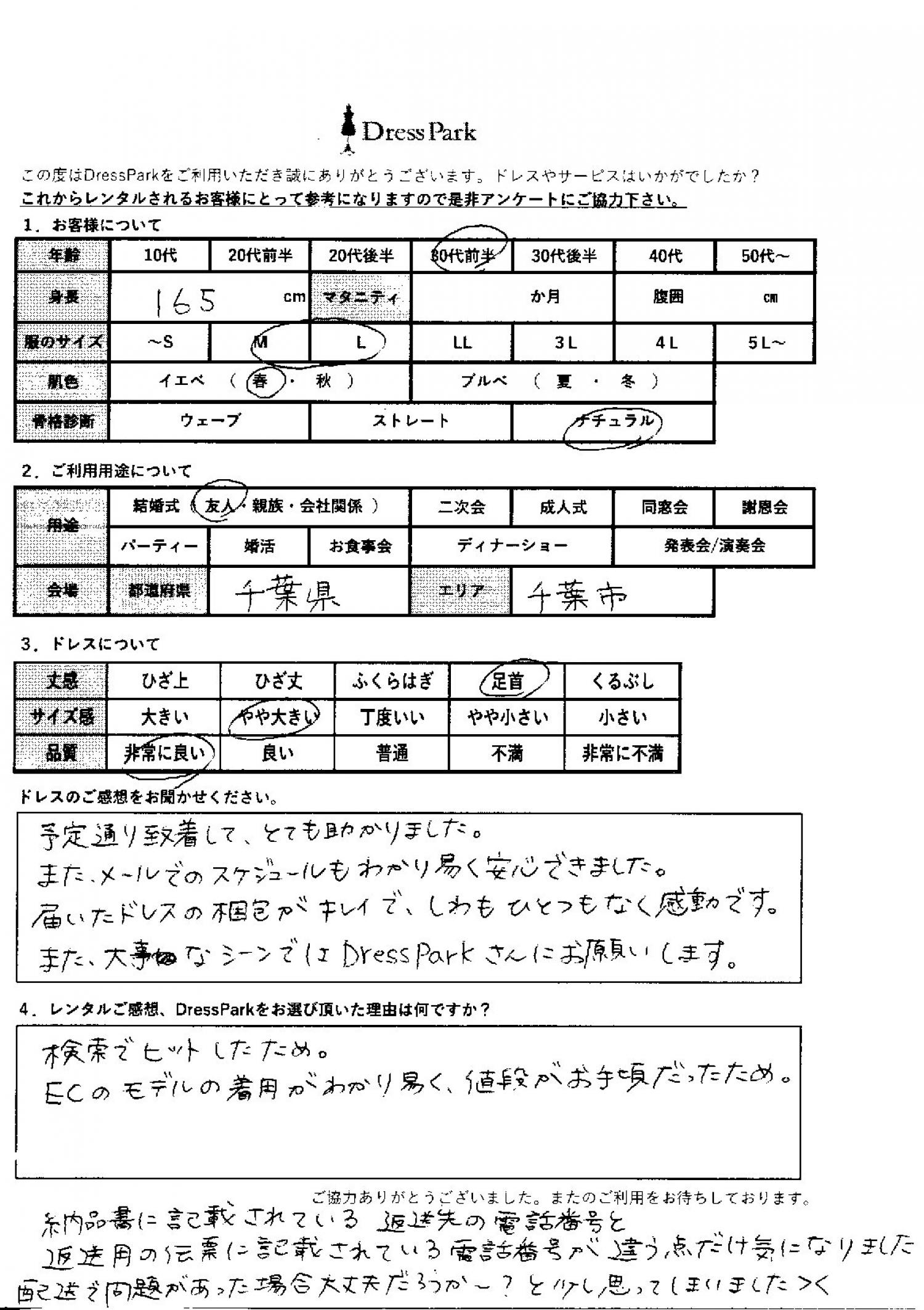 千葉県 R.H様165㎝ Mサイズ #30代#M/L#165~169㎝#結婚式(友人)#千葉県 ◆レンタルしたドレスはこちら ◆レンタルしたサイズは:M ◆レンタルした日付:2025/10/04 ドレスの着用感 ◆点数: (5点) ◆丈感:足首 ◆サイズ感:やや大きい ◆品質:非常に良い ◆肌色:イエベ ◆骨格診断:ナチュラル ドレスの感想 予定通り到着してとても助かりました。またメールでのスケジュールもわかりやすく安心できました。届いたドレスの梱包が綺麗で、シワひとつなく感動です。また大事なシーンではドレスパークさんにお願いします。 レンタルのご感想、DressParkをお選び頂いた理由 検索でヒットしたため。ECのモデルの着用が分かりやすく、値段がお手頃だったため。 CUSTOMER REVIEWS お客様の声 気になるカテゴリー別にご利用の感想をチェック! ◆AGE 年代で見る 10代 20代 30代 40代 50代~ ◆SIZE サイズで見る SS/S M/L 大きいサイズLL~ ◆HIGHT 身長で見る 140~149㎝ 150~154㎝ 155~159㎝ 160~164㎝ 165~169㎝ 170㎝以上 ◆マタニティ ~3か月 4~6か月 7~8か月 9~10か月 ◆肌色 イエベ ブルべ ◆骨格診断 ウェーブ ストレート ナチュラル ◆利用シーン 結婚式(友人) 結婚式(親族) 結婚式(会社関係) 二次会 成人式 謝恩会 パーティー その他 CUSTOMER REVIEWS都道府県別お客様の声 都道府県別にのお客様の声をチェック! 北海道 青森県 岩手県 宮城県 秋田県 山形県 福島県 茨城県 栃木県 群馬県 埼玉県 千葉県 東京都 神奈川県 新潟県 富山県 石川県 福井県 山梨県 長野県 岐阜県 静岡県 愛知県 三重県 滋賀県 京都府 大阪府 兵庫県 奈良県 和歌山県 鳥取県 島根県 岡山県 広島県 山口県 徳島県 香川県 愛媛県 高知県 福岡県 佐賀県 長崎県 熊本県 大分県 宮崎県 鹿児島県 沖縄県 CUSTOMER REVIEWSエリア別お客様の声 都道府県別にのお客様の声をチェック! 札幌 仙台 名古屋 軽井沢 金沢 神戸・芦屋 博多 那覇 梅田・新大阪 難波・心斎橋 鎌倉・湘南 横浜・みなとみらい 舞浜・浦安・幕張 大宮・浦和 青山・表参道 六本木・麻布 渋谷・恵比寿 新宿 池袋 銀座・丸の内 お台場・汐留 鹿児島市 郡山市 福島市 東予 甲府・石和 LINEでお問い合わせ このサイトではJavaScriptを使用しています