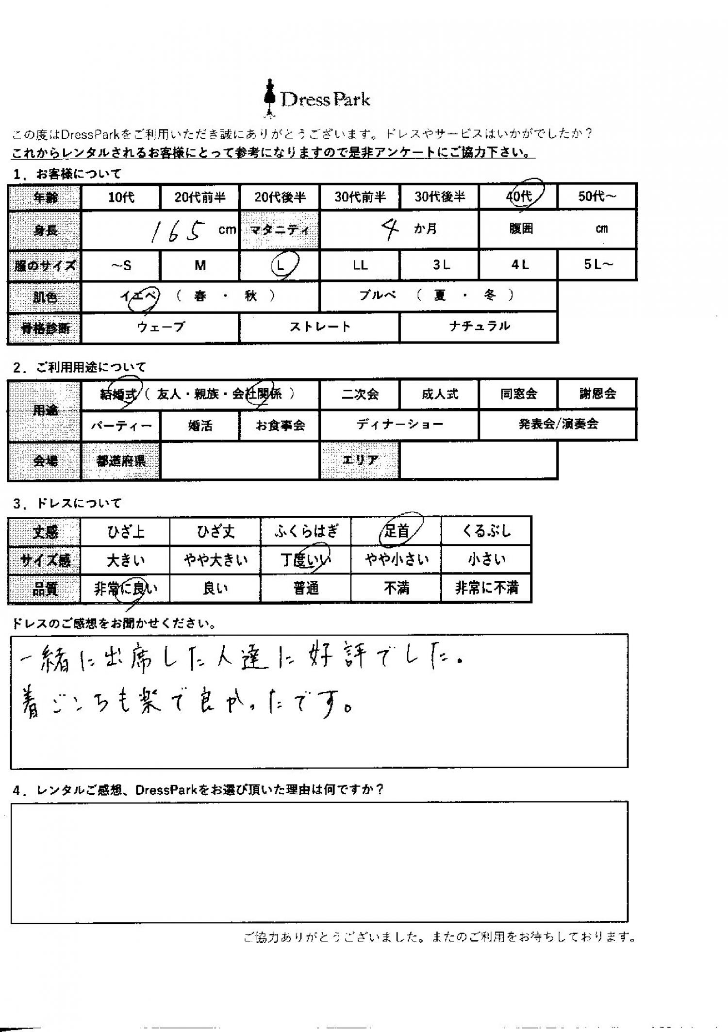 鳥取県 Y.Y様165㎝ Lサイズ マタニティ #40代#M/L#165~169㎝#結婚式(会社関係)#鳥取県 ◆レンタルしたドレスはこちら ◆レンタルしたサイズは:L ◆レンタルした日付:2025/10/04 ドレスの着用感 ◆点数: (5点) ◆丈感:足首 ◆サイズ感:丁度いい ◆品質:非常に良い ◆マタニティ: ◆肌色:イエベ ドレスの感想 一緒に出席した人たちに好評でした。着心地も楽でよかったです。 CUSTOMER REVIEWS お客様の声 気になるカテゴリー別にご利用の感想をチェック! ◆AGE 年代で見る 10代 20代 30代 40代 50代~ ◆SIZE サイズで見る SS/S M/L 大きいサイズLL~ ◆HIGHT 身長で見る 140~149㎝ 150~154㎝ 155~159㎝ 160~164㎝ 165~169㎝ 170㎝以上 ◆マタニティ ~3か月 4~6か月 7~8か月 9~10か月 ◆肌色 イエベ ブルべ ◆骨格診断 ウェーブ ストレート ナチュラル ◆利用シーン 結婚式(友人) 結婚式(親族) 結婚式(会社関係) 二次会 成人式 謝恩会 パーティー その他 CUSTOMER REVIEWS都道府県別お客様の声 都道府県別にのお客様の声をチェック! 北海道 青森県 岩手県 宮城県 秋田県 山形県 福島県 茨城県 栃木県 群馬県 埼玉県 千葉県 東京都 神奈川県 新潟県 富山県 石川県 福井県 山梨県 長野県 岐阜県 静岡県 愛知県 三重県 滋賀県 京都府 大阪府 兵庫県 奈良県 和歌山県 鳥取県 島根県 岡山県 広島県 山口県 徳島県 香川県 愛媛県 高知県 福岡県 佐賀県 長崎県 熊本県 大分県 宮崎県 鹿児島県 沖縄県 CUSTOMER REVIEWSエリア別お客様の声 都道府県別にのお客様の声をチェック! 札幌 仙台 名古屋 軽井沢 金沢 神戸・芦屋 博多 那覇 梅田・新大阪 難波・心斎橋 鎌倉・湘南 横浜・みなとみらい 舞浜・浦安・幕張 大宮・浦和 青山・表参道 六本木・麻布 渋谷・恵比寿 新宿 池袋 銀座・丸の内 お台場・汐留 鹿児島市 郡山市 福島市 東予 甲府・石和 LINEでお問い合わせ このサイトではJavaScriptを使用しています