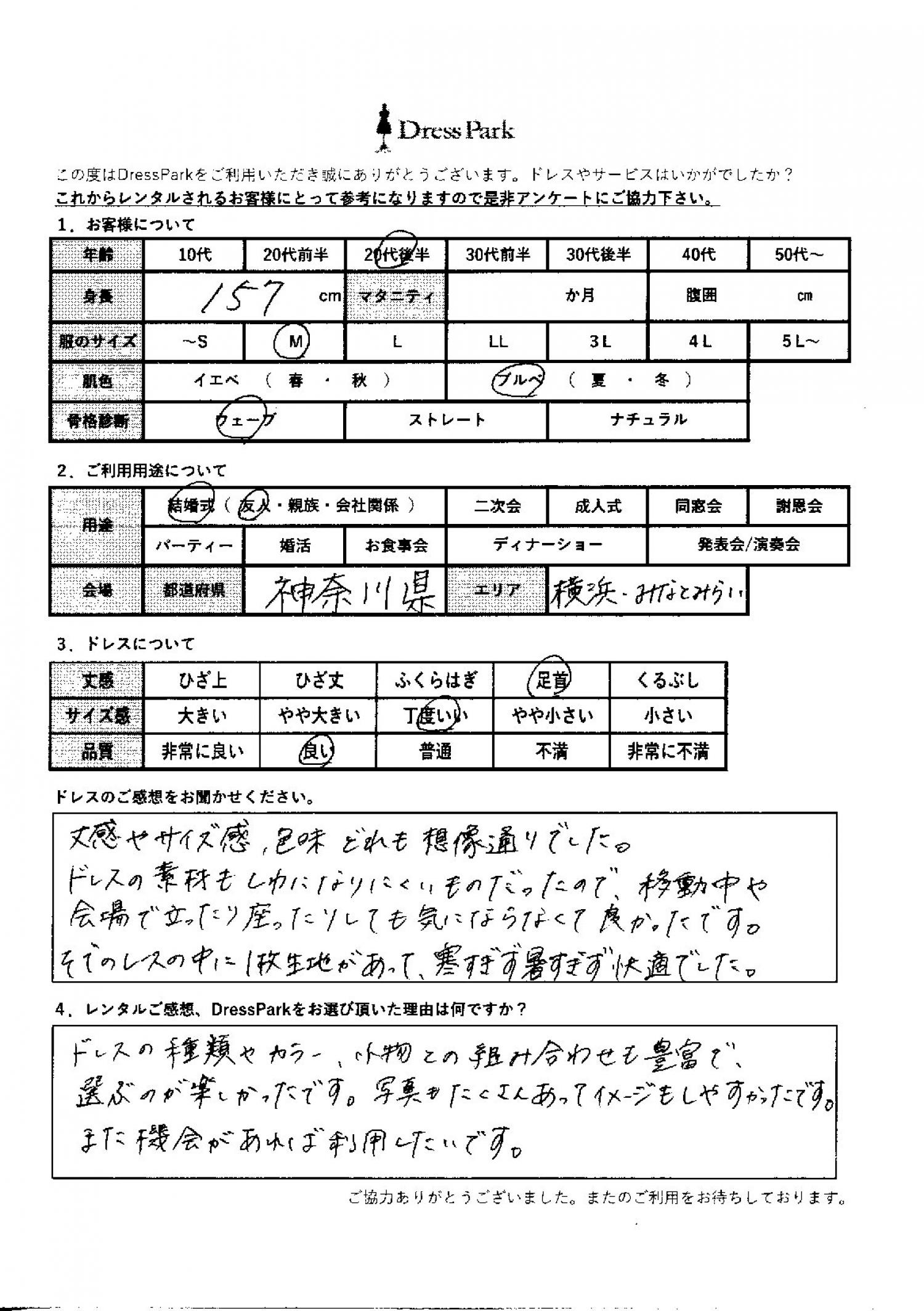 神奈川県 M.N様157㎝ Mサイズ横浜・みなとみらい #20代#M/L#155~159㎝#結婚式(友人)#神奈川県#横浜・みなとみらい ◆レンタルしたドレスはこちら ◆レンタルしたサイズは:M ◆レンタルした日付:2025/10/04 ドレスの着用感 ◆点数: (5点) ◆丈感:足首 ◆サイズ感:丁度いい ◆品質:良い ◆肌色:ブルべ ◆骨格診断:ウェーブ ドレスの感想 丈やサイズ感、色味、どれも想像通りでした。ドレスの素材もシワになりにくいものだったので、移動中や会場で立ったり座ったりしても気にならなくてよかったです。袖のレースの中に1枚生地があって、寒すぎず、暑すぎず快適でした。 レンタルのご感想、DressParkをお選び頂いた理由 ドレスの種類やカラー、小物との組み合わせも豊富で選ぶのが楽しかったです。写真がたくさんあってイメージもしやすかったです。また機会があれば利用したいです。 CUSTOMER REVIEWS お客様の声 気になるカテゴリー別にご利用の感想をチェック! ◆AGE 年代で見る 10代 20代 30代 40代 50代~ ◆SIZE サイズで見る SS/S M/L 大きいサイズLL~ ◆HIGHT 身長で見る 140~149㎝ 150~154㎝ 155~159㎝ 160~164㎝ 165~169㎝ 170㎝以上 ◆マタニティ ~3か月 4~6か月 7~8か月 9~10か月 ◆肌色 イエベ ブルべ ◆骨格診断 ウェーブ ストレート ナチュラル ◆利用シーン 結婚式(友人) 結婚式(親族) 結婚式(会社関係) 二次会 成人式 謝恩会 パーティー その他 CUSTOMER REVIEWS都道府県別お客様の声 都道府県別にのお客様の声をチェック! 北海道 青森県 岩手県 宮城県 秋田県 山形県 福島県 茨城県 栃木県 群馬県 埼玉県 千葉県 東京都 神奈川県 新潟県 富山県 石川県 福井県 山梨県 長野県 岐阜県 静岡県 愛知県 三重県 滋賀県 京都府 大阪府 兵庫県 奈良県 和歌山県 鳥取県 島根県 岡山県 広島県 山口県 徳島県 香川県 愛媛県 高知県 福岡県 佐賀県 長崎県 熊本県 大分県 宮崎県 鹿児島県 沖縄県 CUSTOMER REVIEWSエリア別お客様の声 都道府県別にのお客様の声をチェック! 札幌 仙台 名古屋 軽井沢 金沢 神戸・芦屋 博多 那覇 梅田・新大阪 難波・心斎橋 鎌倉・湘南 横浜・みなとみらい 舞浜・浦安・幕張 大宮・浦和 青山・表参道 六本木・麻布 渋谷・恵比寿 新宿 池袋 銀座・丸の内 お台場・汐留 鹿児島市 郡山市 福島市 東予 甲府・石和 LINEでお問い合わせ このサイトではJavaScriptを使用しています