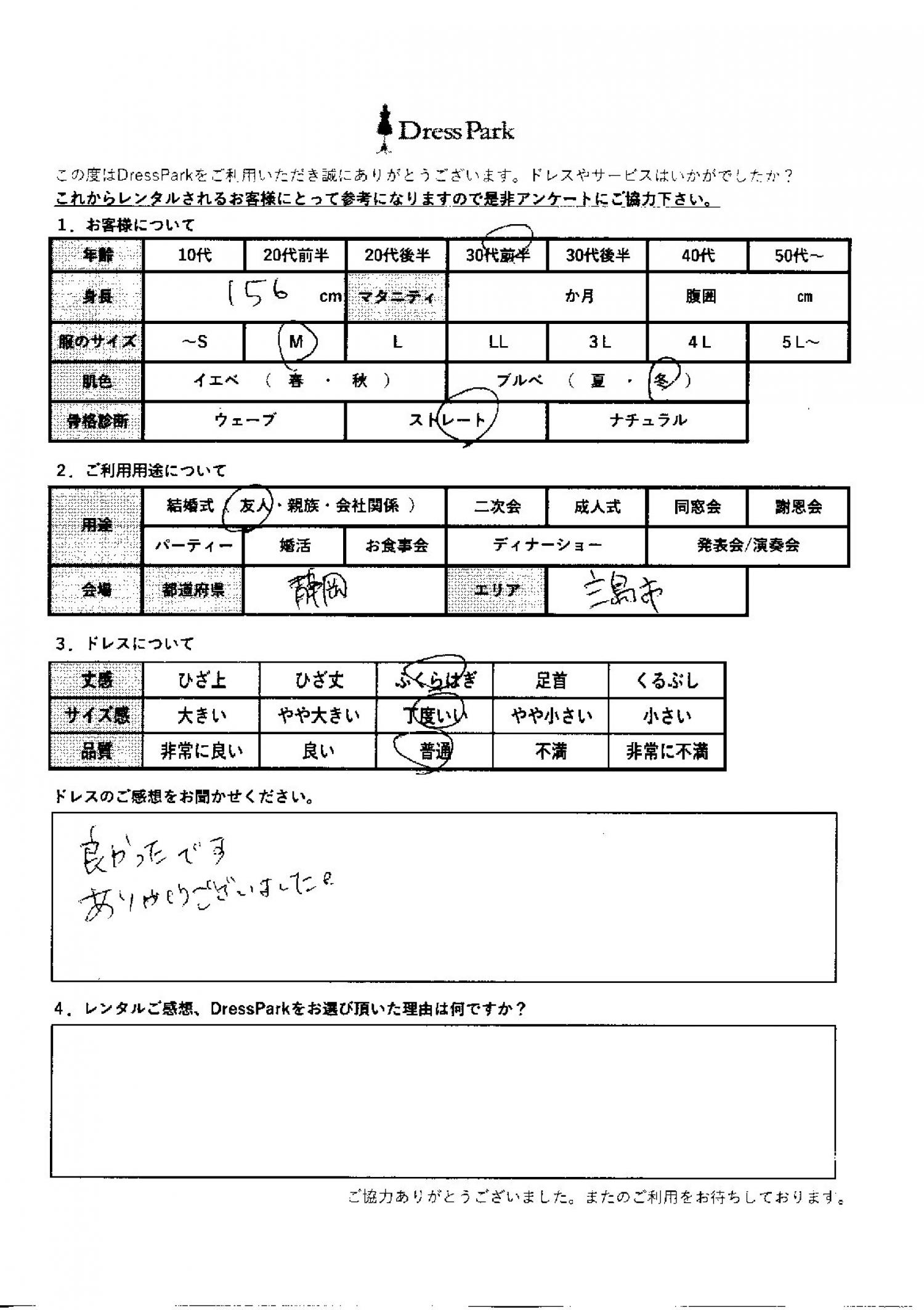 静岡県 M.S様156㎝ Mサイズ #30代#M/L#155~159㎝#結婚式(友人)#静岡県 ◆レンタルしたドレスはこちら ◆レンタルしたサイズは:M ◆レンタルした日付:2025/10/04 ドレスの着用感 ◆点数: (4点) ◆丈感:ふくらはぎ ◆サイズ感:丁度いい ◆品質:普通 ◆肌色:ブルべ ◆骨格診断:ストレート ドレスの感想 良かったです。ありがとうございました。 CUSTOMER REVIEWS お客様の声 気になるカテゴリー別にご利用の感想をチェック! ◆AGE 年代で見る 10代 20代 30代 40代 50代~ ◆SIZE サイズで見る SS/S M/L 大きいサイズLL~ ◆HIGHT 身長で見る 140~149㎝ 150~154㎝ 155~159㎝ 160~164㎝ 165~169㎝ 170㎝以上 ◆マタニティ ~3か月 4~6か月 7~8か月 9~10か月 ◆肌色 イエベ ブルべ ◆骨格診断 ウェーブ ストレート ナチュラル ◆利用シーン 結婚式(友人) 結婚式(親族) 結婚式(会社関係) 二次会 成人式 謝恩会 パーティー その他 CUSTOMER REVIEWS都道府県別お客様の声 都道府県別にのお客様の声をチェック! 北海道 青森県 岩手県 宮城県 秋田県 山形県 福島県 茨城県 栃木県 群馬県 埼玉県 千葉県 東京都 神奈川県 新潟県 富山県 石川県 福井県 山梨県 長野県 岐阜県 静岡県 愛知県 三重県 滋賀県 京都府 大阪府 兵庫県 奈良県 和歌山県 鳥取県 島根県 岡山県 広島県 山口県 徳島県 香川県 愛媛県 高知県 福岡県 佐賀県 長崎県 熊本県 大分県 宮崎県 鹿児島県 沖縄県 CUSTOMER REVIEWSエリア別お客様の声 都道府県別にのお客様の声をチェック! 札幌 仙台 名古屋 軽井沢 金沢 神戸・芦屋 博多 那覇 梅田・新大阪 難波・心斎橋 鎌倉・湘南 横浜・みなとみらい 舞浜・浦安・幕張 大宮・浦和 青山・表参道 六本木・麻布 渋谷・恵比寿 新宿 池袋 銀座・丸の内 お台場・汐留 鹿児島市 郡山市 福島市 東予 甲府・石和 LINEでお問い合わせ このサイトではJavaScriptを使用しています