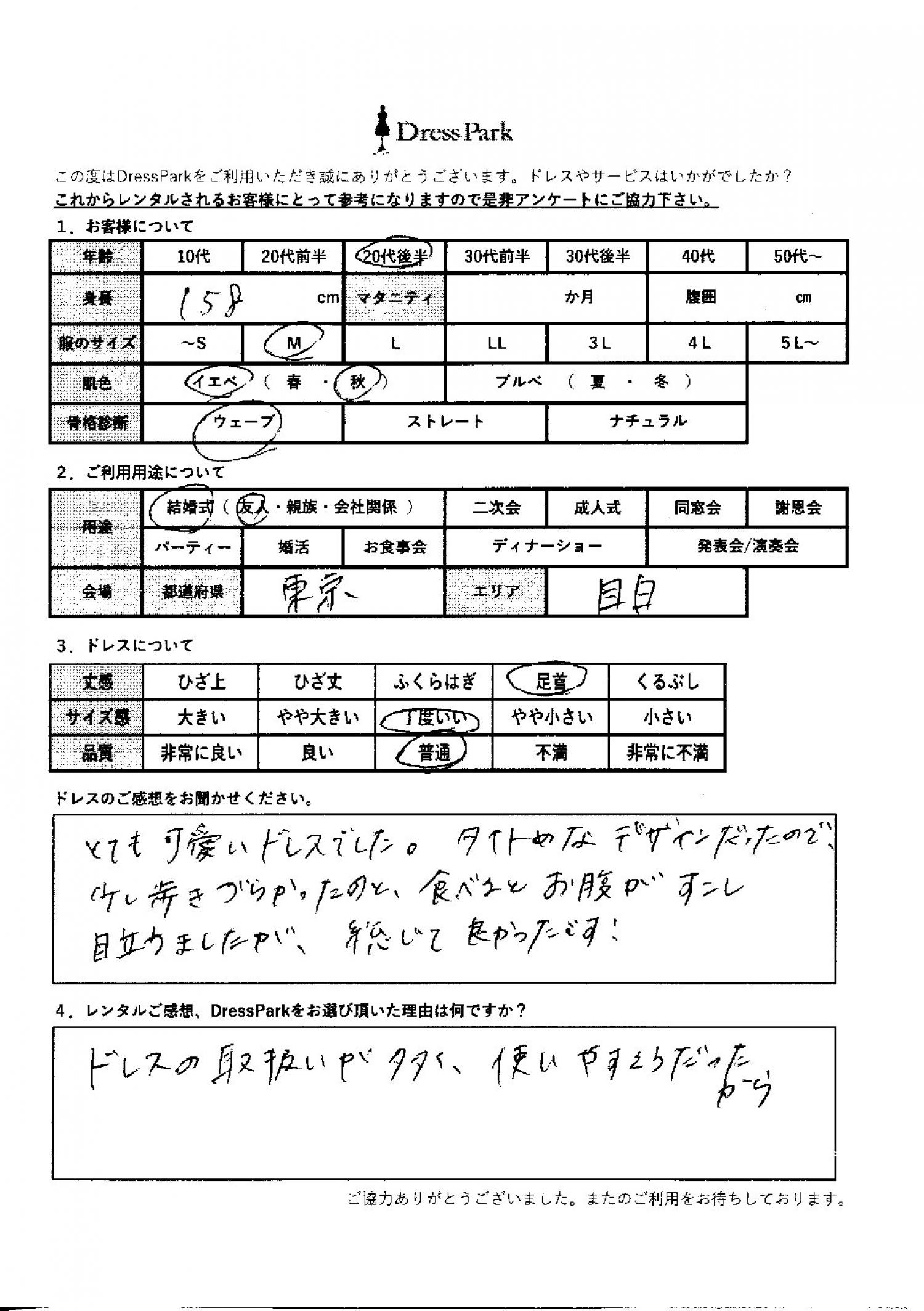 東京都 H.A様158㎝ Mサイズ #20代#M/L#155~159㎝#結婚式(友人)#東京都 ◆レンタルしたドレスはこちら ◆レンタルしたサイズは:M ◆レンタルした日付:2025/10/04 ドレスの着用感 ◆点数: (4点) ◆丈感:足首 ◆サイズ感:丁度いい ◆品質:普通 ◆肌色:イエベ ◆骨格診断:ウェーブ ドレスの感想 とてもかわいいドレスでした。タイトめなデザインだったので、少し歩きづらかったのと、食べるとお腹が少し目立ちましたが、総じてよかったです! レンタルのご感想、DressParkをお選び頂いた理由 ドレスの取り扱いが多く使いやすそうだったから。 CUSTOMER REVIEWS お客様の声 気になるカテゴリー別にご利用の感想をチェック! ◆AGE 年代で見る 10代 20代 30代 40代 50代~ ◆SIZE サイズで見る SS/S M/L 大きいサイズLL~ ◆HIGHT 身長で見る 140~149㎝ 150~154㎝ 155~159㎝ 160~164㎝ 165~169㎝ 170㎝以上 ◆マタニティ ~3か月 4~6か月 7~8か月 9~10か月 ◆肌色 イエベ ブルべ ◆骨格診断 ウェーブ ストレート ナチュラル ◆利用シーン 結婚式(友人) 結婚式(親族) 結婚式(会社関係) 二次会 成人式 謝恩会 パーティー その他 CUSTOMER REVIEWS都道府県別お客様の声 都道府県別にのお客様の声をチェック! 北海道 青森県 岩手県 宮城県 秋田県 山形県 福島県 茨城県 栃木県 群馬県 埼玉県 千葉県 東京都 神奈川県 新潟県 富山県 石川県 福井県 山梨県 長野県 岐阜県 静岡県 愛知県 三重県 滋賀県 京都府 大阪府 兵庫県 奈良県 和歌山県 鳥取県 島根県 岡山県 広島県 山口県 徳島県 香川県 愛媛県 高知県 福岡県 佐賀県 長崎県 熊本県 大分県 宮崎県 鹿児島県 沖縄県 CUSTOMER REVIEWSエリア別お客様の声 都道府県別にのお客様の声をチェック! 札幌 仙台 名古屋 軽井沢 金沢 神戸・芦屋 博多 那覇 梅田・新大阪 難波・心斎橋 鎌倉・湘南 横浜・みなとみらい 舞浜・浦安・幕張 大宮・浦和 青山・表参道 六本木・麻布 渋谷・恵比寿 新宿 池袋 銀座・丸の内 お台場・汐留 鹿児島市 郡山市 福島市 東予 甲府・石和 LINEでお問い合わせ このサイトではJavaScriptを使用しています