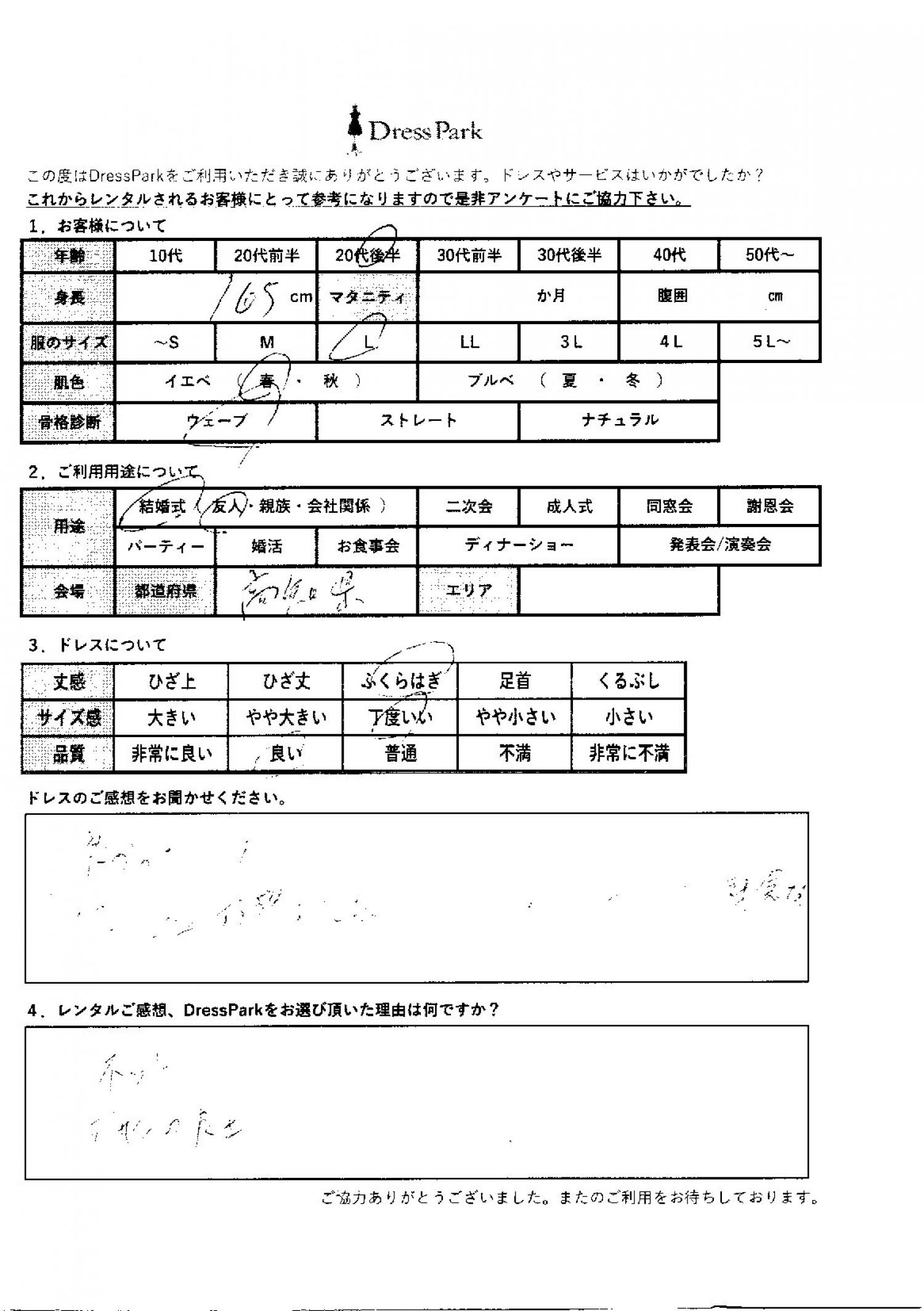 高知県 A.N様165㎝ Lサイズ #20代#M/L#165~169㎝#結婚式(友人)#高知県 ◆レンタルしたドレスはこちら ◆レンタルしたサイズは:L ◆レンタルした日付:2025/10/04 ドレスの着用感 ◆点数: (4点) ◆丈感:ふくらはぎ ◆サイズ感:丁度いい ◆品質:良い ◆肌色:イエベ ◆骨格診断:ウェーブ ドレスの感想 よかったです。ただ返却する際は元払いというのを知らなかったので残念。 【スタッフより】 この度はご利用ありがとうございました。当店はご返却送料はお客様にご負担いただいておりますので、サイト内やご注文前にも明記がございます。ご確認いただけますと幸いです。 レンタルのご感想、DressParkをお選び頂いた理由 ネット、デザインの良さ CUSTOMER REVIEWS お客様の声 気になるカテゴリー別にご利用の感想をチェック! ◆AGE 年代で見る 10代 20代 30代 40代 50代~ ◆SIZE サイズで見る SS/S M/L 大きいサイズLL~ ◆HIGHT 身長で見る 140~149㎝ 150~154㎝ 155~159㎝ 160~164㎝ 165~169㎝ 170㎝以上 ◆マタニティ ~3か月 4~6か月 7~8か月 9~10か月 ◆肌色 イエベ ブルべ ◆骨格診断 ウェーブ ストレート ナチュラル ◆利用シーン 結婚式(友人) 結婚式(親族) 結婚式(会社関係) 二次会 成人式 謝恩会 パーティー その他 CUSTOMER REVIEWS都道府県別お客様の声 都道府県別にのお客様の声をチェック! 北海道 青森県 岩手県 宮城県 秋田県 山形県 福島県 茨城県 栃木県 群馬県 埼玉県 千葉県 東京都 神奈川県 新潟県 富山県 石川県 福井県 山梨県 長野県 岐阜県 静岡県 愛知県 三重県 滋賀県 京都府 大阪府 兵庫県 奈良県 和歌山県 鳥取県 島根県 岡山県 広島県 山口県 徳島県 香川県 愛媛県 高知県 福岡県 佐賀県 長崎県 熊本県 大分県 宮崎県 鹿児島県 沖縄県 CUSTOMER REVIEWSエリア別お客様の声 都道府県別にのお客様の声をチェック! 札幌 仙台 名古屋 軽井沢 金沢 神戸・芦屋 博多 那覇 梅田・新大阪 難波・心斎橋 鎌倉・湘南 横浜・みなとみらい 舞浜・浦安・幕張 大宮・浦和 青山・表参道 六本木・麻布 渋谷・恵比寿 新宿 池袋 銀座・丸の内 お台場・汐留 鹿児島市 郡山市 福島市 東予 甲府・石和 LINEでお問い合わせ このサイトではJavaScriptを使用しています
