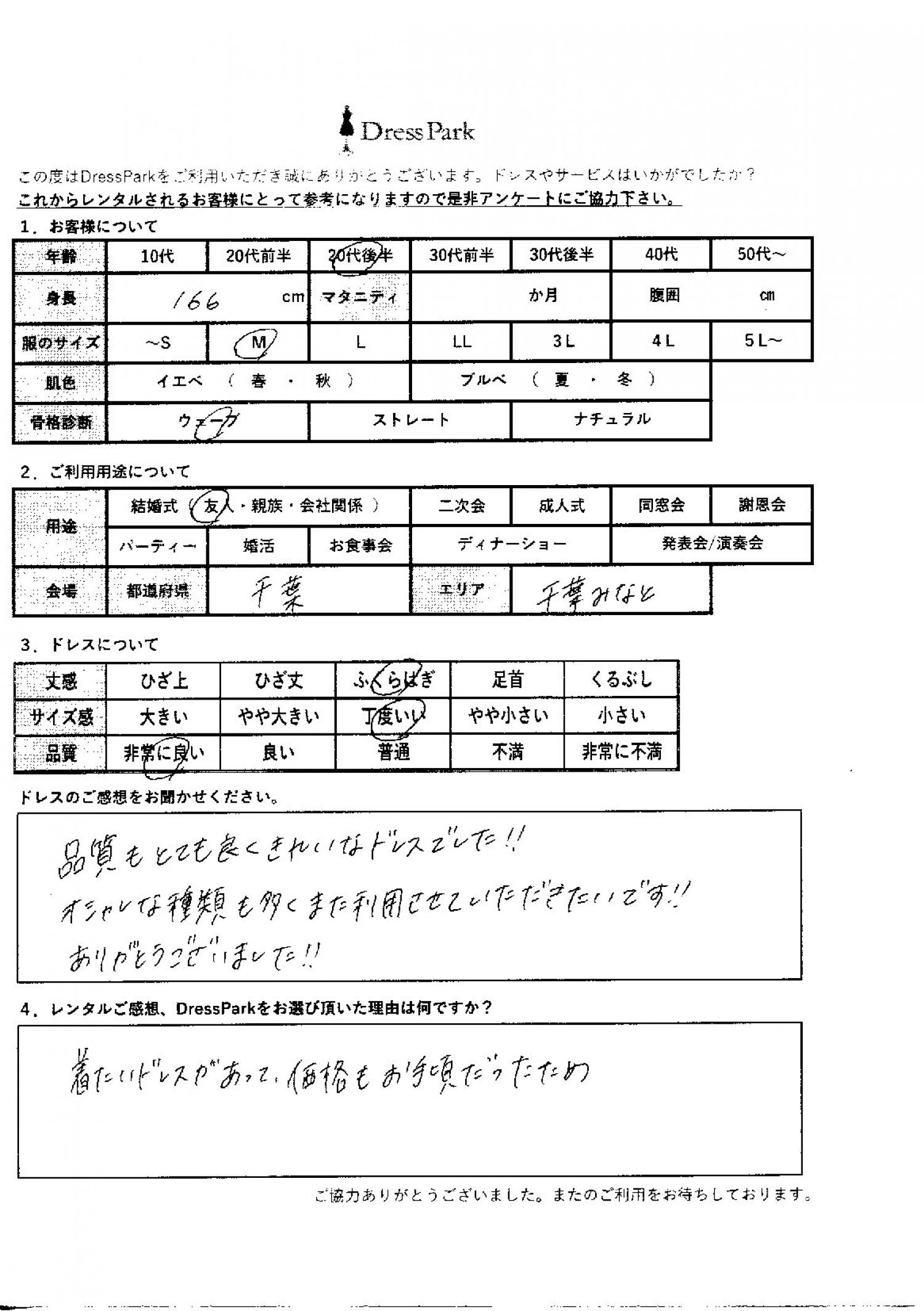 千葉県 K.T様166㎝ Mサイズ #20代#M/L#165~169㎝#結婚式(友人)#千葉県 ◆レンタルしたドレスはこちら ◆レンタルしたサイズは:M ◆レンタルした日付:2025/09/29 ドレスの着用感 ◆点数: (5点) ◆丈感:ふくらはぎ ◆サイズ感:丁度いい ◆品質:非常に良い ◆骨格診断:ウェーブ ドレスの感想 品質もとても良く、綺麗なドレスでした!おしゃれな種類も多く、また利用させていただきたいです!ありがとうございました! レンタルのご感想、DressParkをお選び頂いた理由 着たいドレスがあって、価格もお手頃だったため。 CUSTOMER REVIEWS お客様の声 気になるカテゴリー別にご利用の感想をチェック! ◆AGE 年代で見る 10代 20代 30代 40代 50代~ ◆SIZE サイズで見る SS/S M/L 大きいサイズLL~ ◆HIGHT 身長で見る 140~149㎝ 150~154㎝ 155~159㎝ 160~164㎝ 165~169㎝ 170㎝以上 ◆マタニティ ~3か月 4~6か月 7~8か月 9~10か月 ◆肌色 イエベ ブルべ ◆骨格診断 ウェーブ ストレート ナチュラル ◆利用シーン 結婚式(友人) 結婚式(親族) 結婚式(会社関係) 二次会 成人式 謝恩会 パーティー その他 CUSTOMER REVIEWS都道府県別お客様の声 都道府県別にのお客様の声をチェック! 北海道 青森県 岩手県 宮城県 秋田県 山形県 福島県 茨城県 栃木県 群馬県 埼玉県 千葉県 東京都 神奈川県 新潟県 富山県 石川県 福井県 山梨県 長野県 岐阜県 静岡県 愛知県 三重県 滋賀県 京都府 大阪府 兵庫県 奈良県 和歌山県 鳥取県 島根県 岡山県 広島県 山口県 徳島県 香川県 愛媛県 高知県 福岡県 佐賀県 長崎県 熊本県 大分県 宮崎県 鹿児島県 沖縄県 CUSTOMER REVIEWSエリア別お客様の声 都道府県別にのお客様の声をチェック! 札幌 仙台 名古屋 軽井沢 金沢 神戸・芦屋 博多 那覇 梅田・新大阪 難波・心斎橋 鎌倉・湘南 横浜・みなとみらい 舞浜・浦安・幕張 大宮・浦和 青山・表参道 六本木・麻布 渋谷・恵比寿 新宿 池袋 銀座・丸の内 お台場・汐留 鹿児島市 郡山市 福島市 東予 甲府・石和 LINEでお問い合わせ このサイトではJavaScriptを使用しています